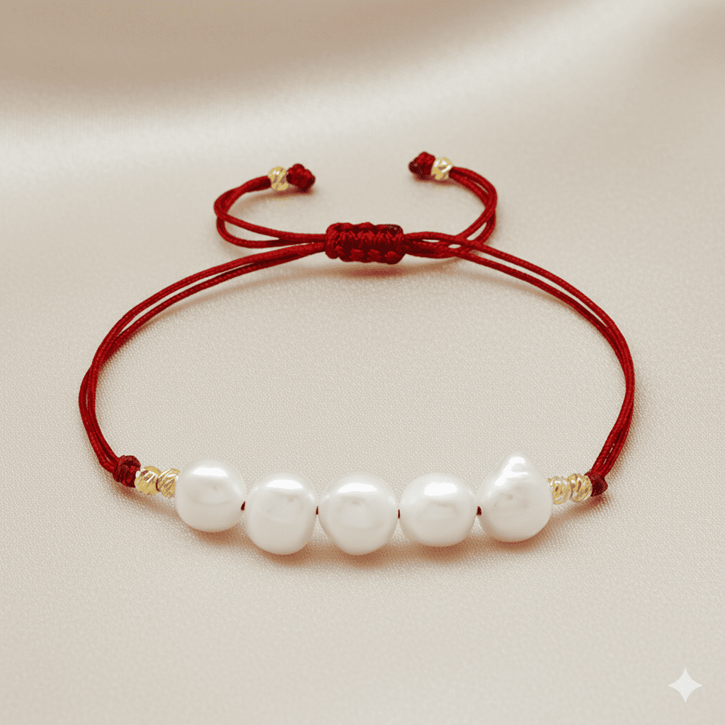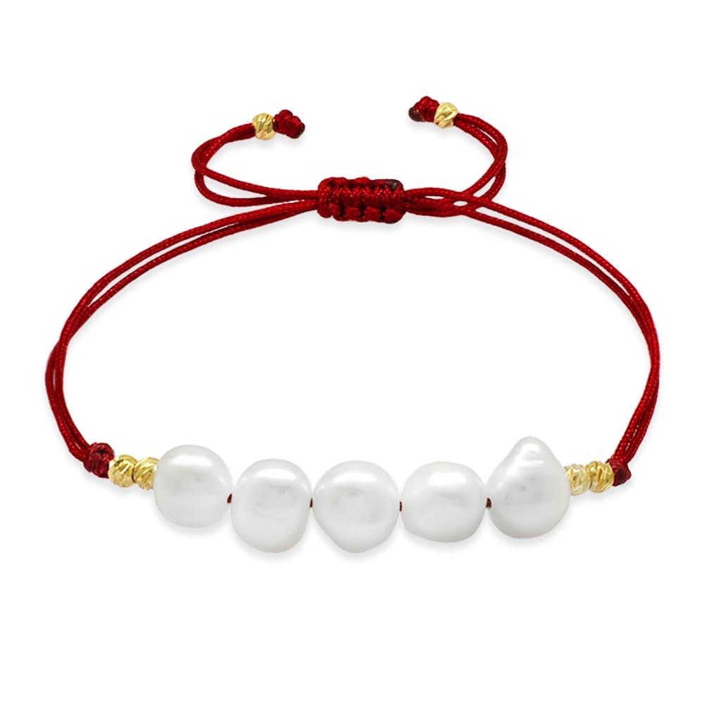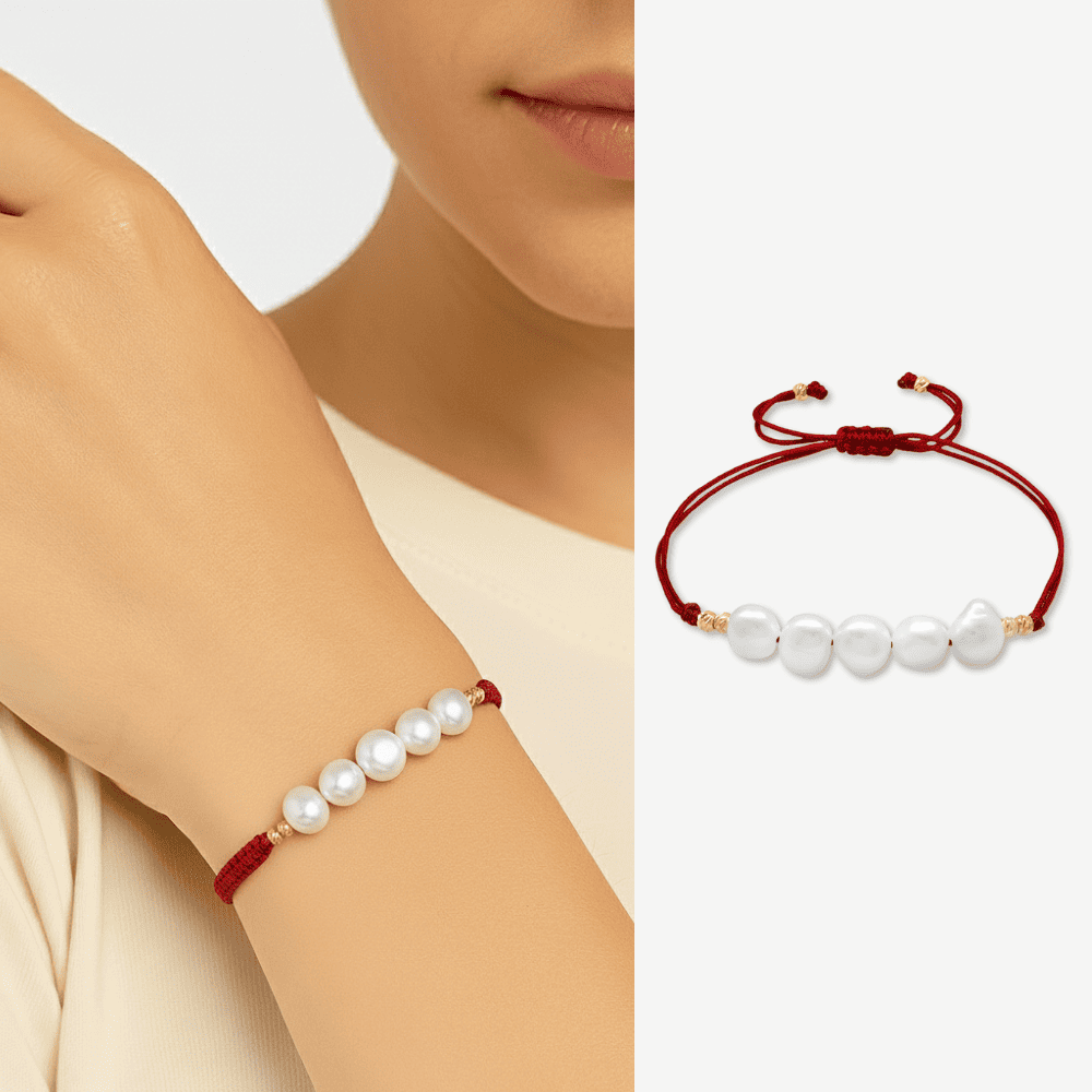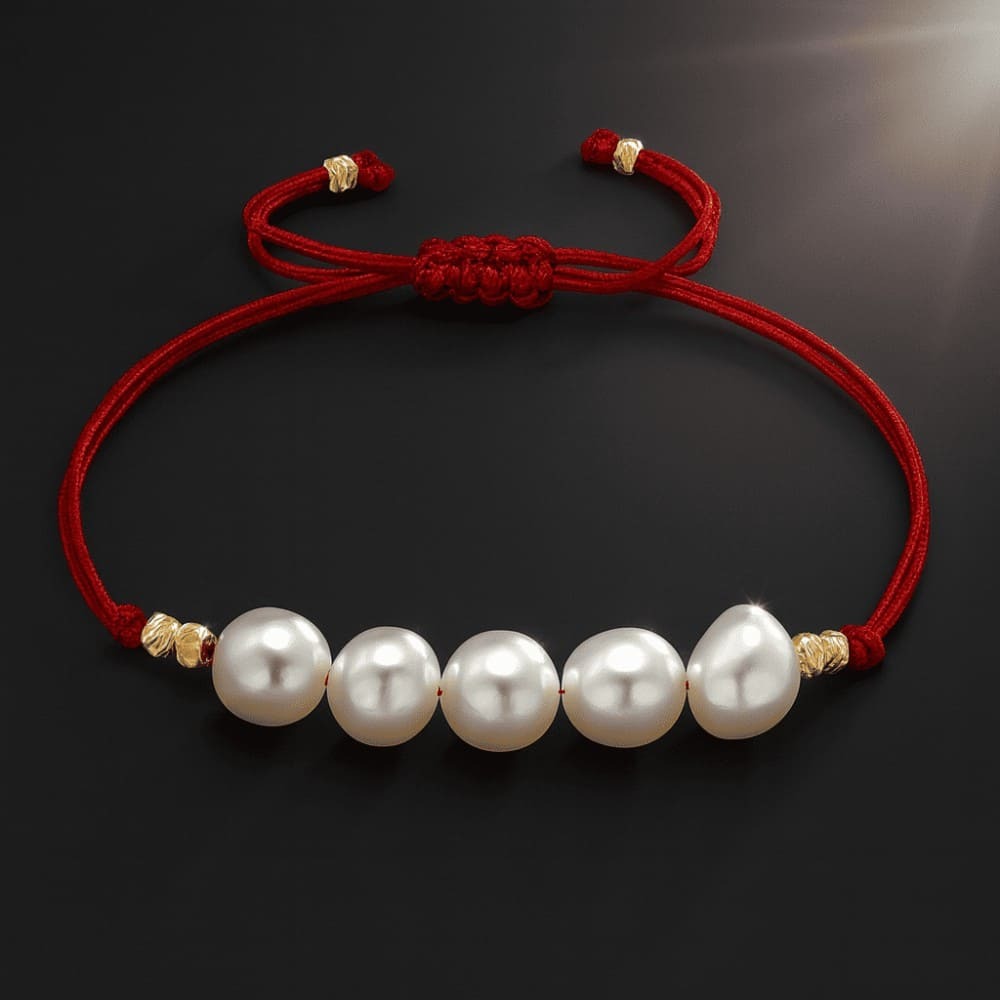 Makrome Örgülü Naturel Kesim Kırmızı İpli Dorika Top Süslemeli Doğal İnci Kadın Bileklik