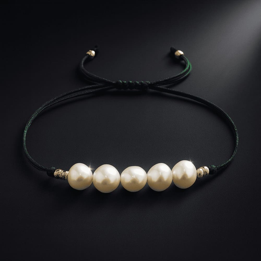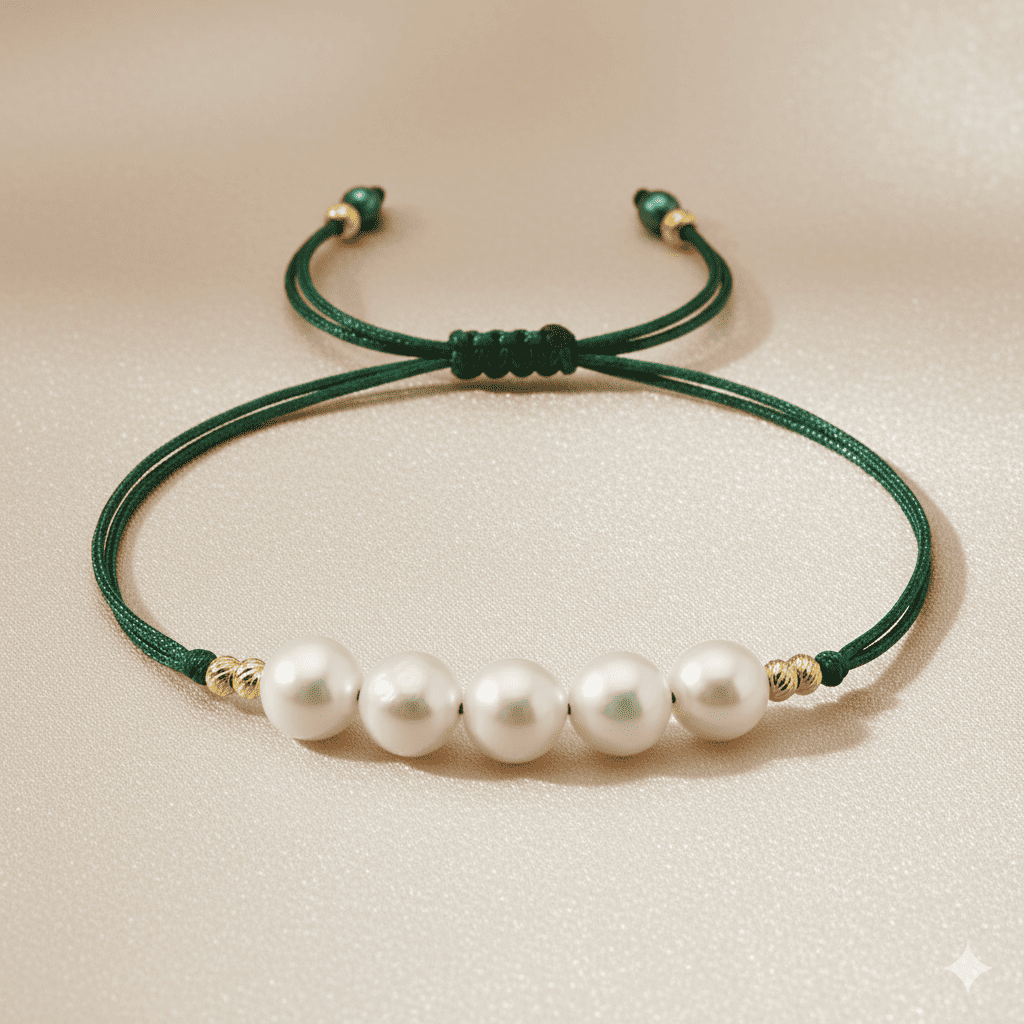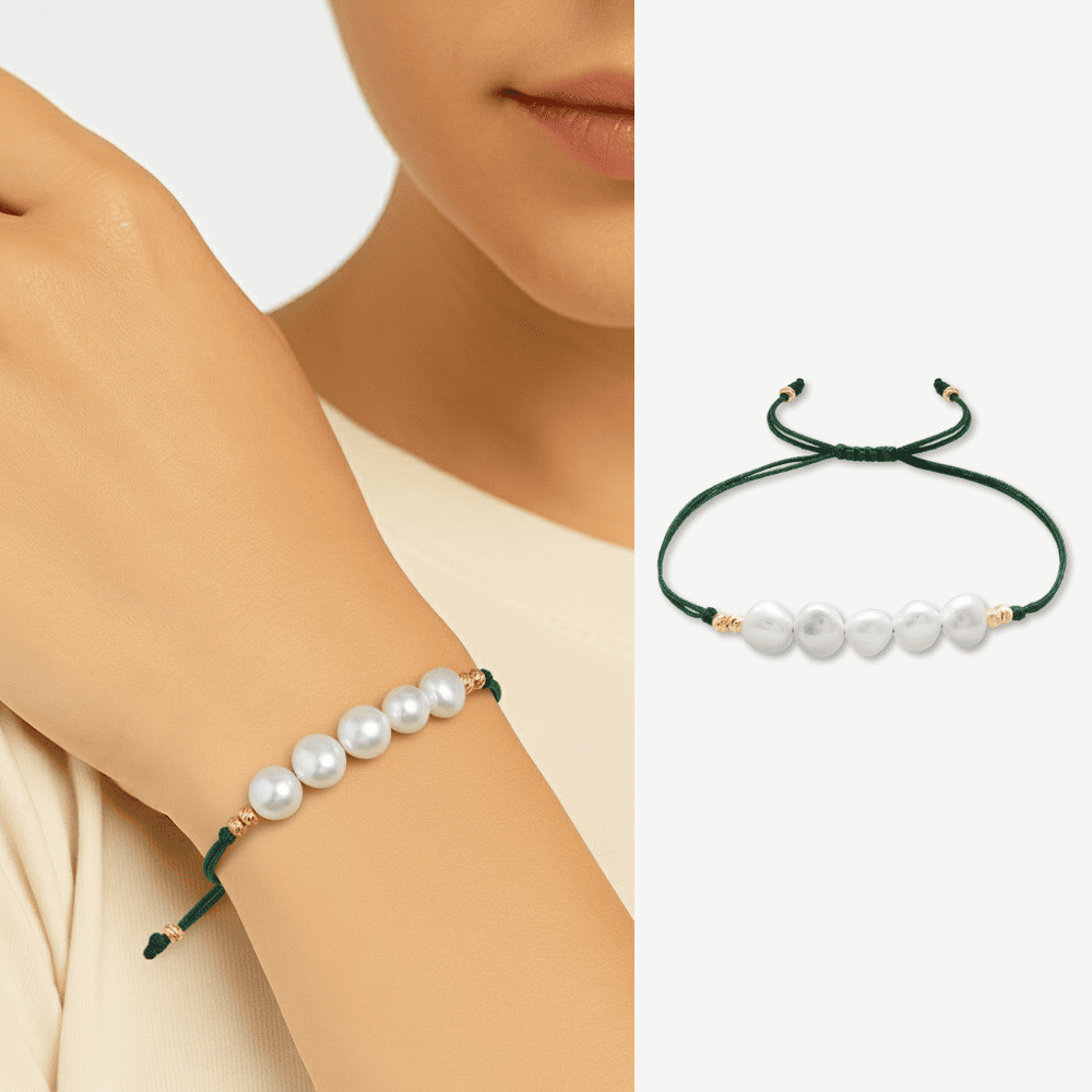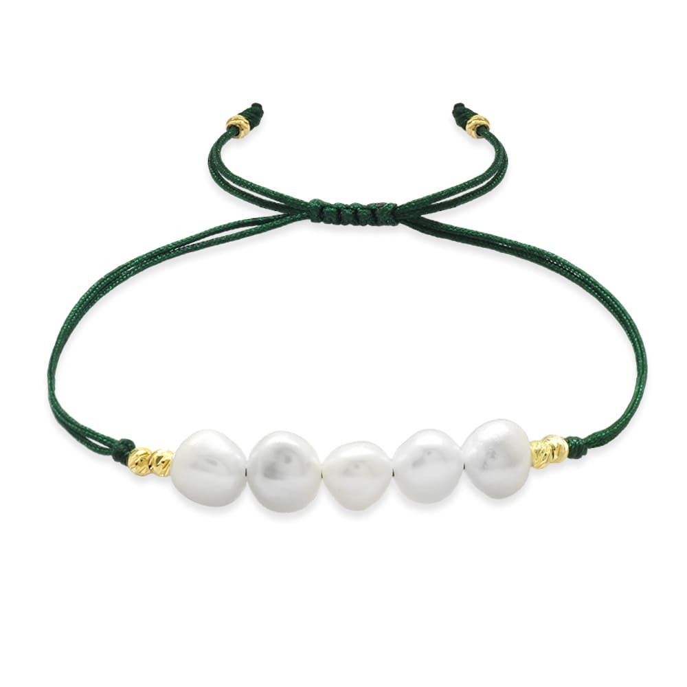 Makrome Örgülü Naturel Kesim Yeşil İpli Sarı Dorika Top Süslemeli Doğal İnci Kadın Bileklik