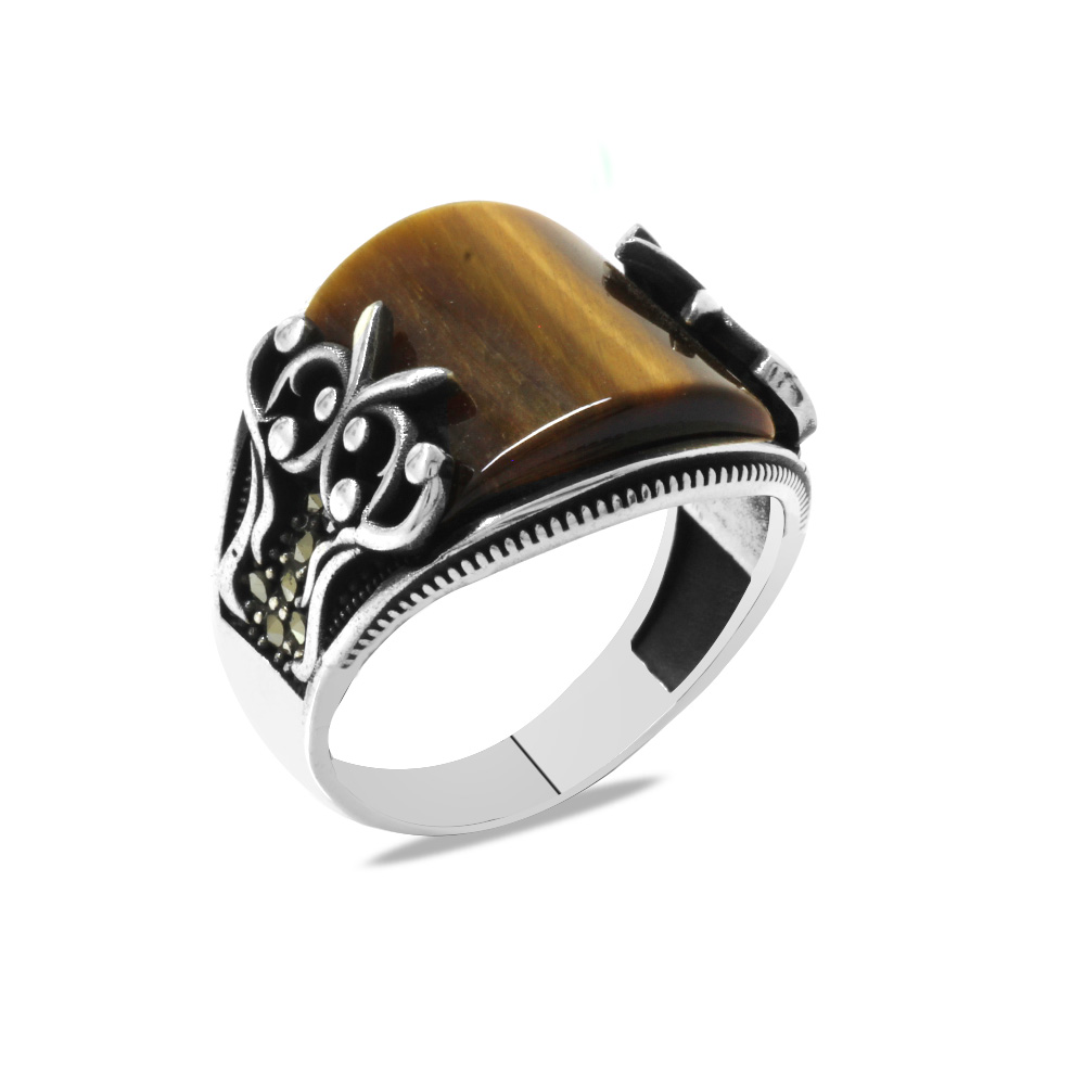 Markazit Taş İşlemeli Bombeli Kaplan Gözü Taşlı 925 Ayar Gümüş Erkek Yüzük