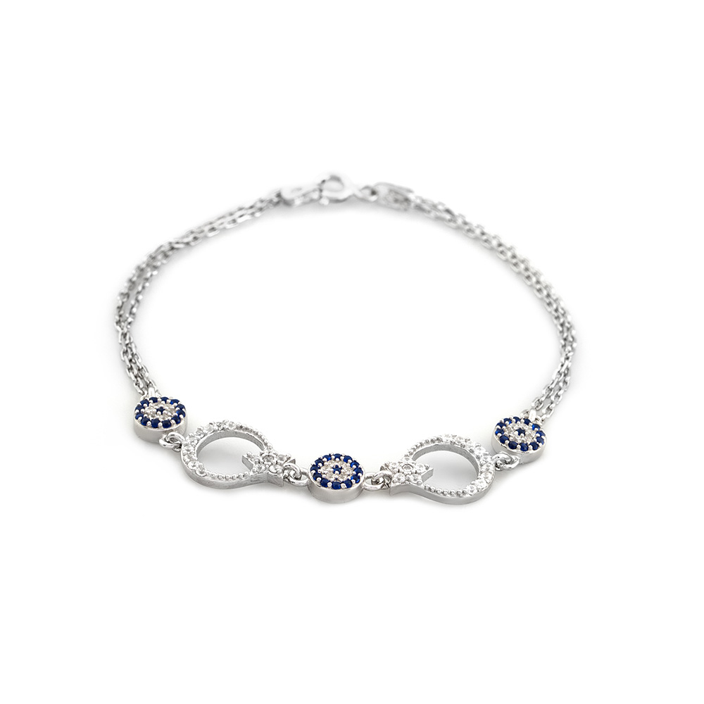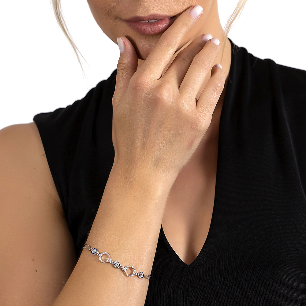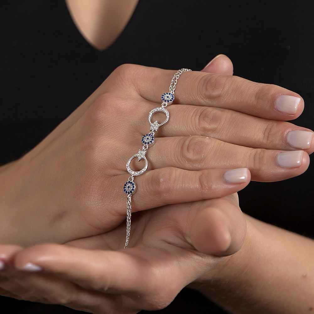 Mavi-Beyaz Zirkon Taşlı Ayyıldız Tasarım 925 Ayar Gümüş Kadın Bileklik