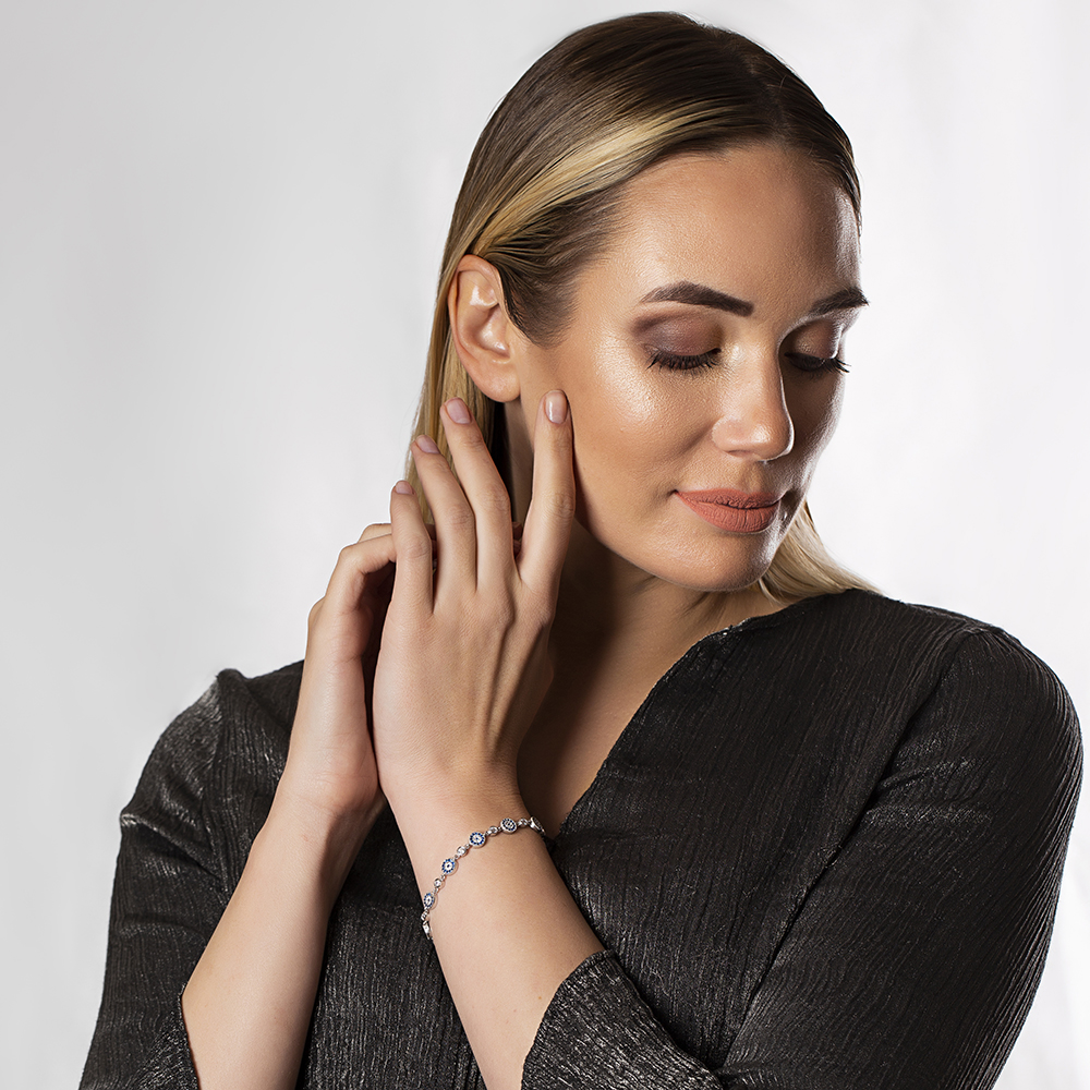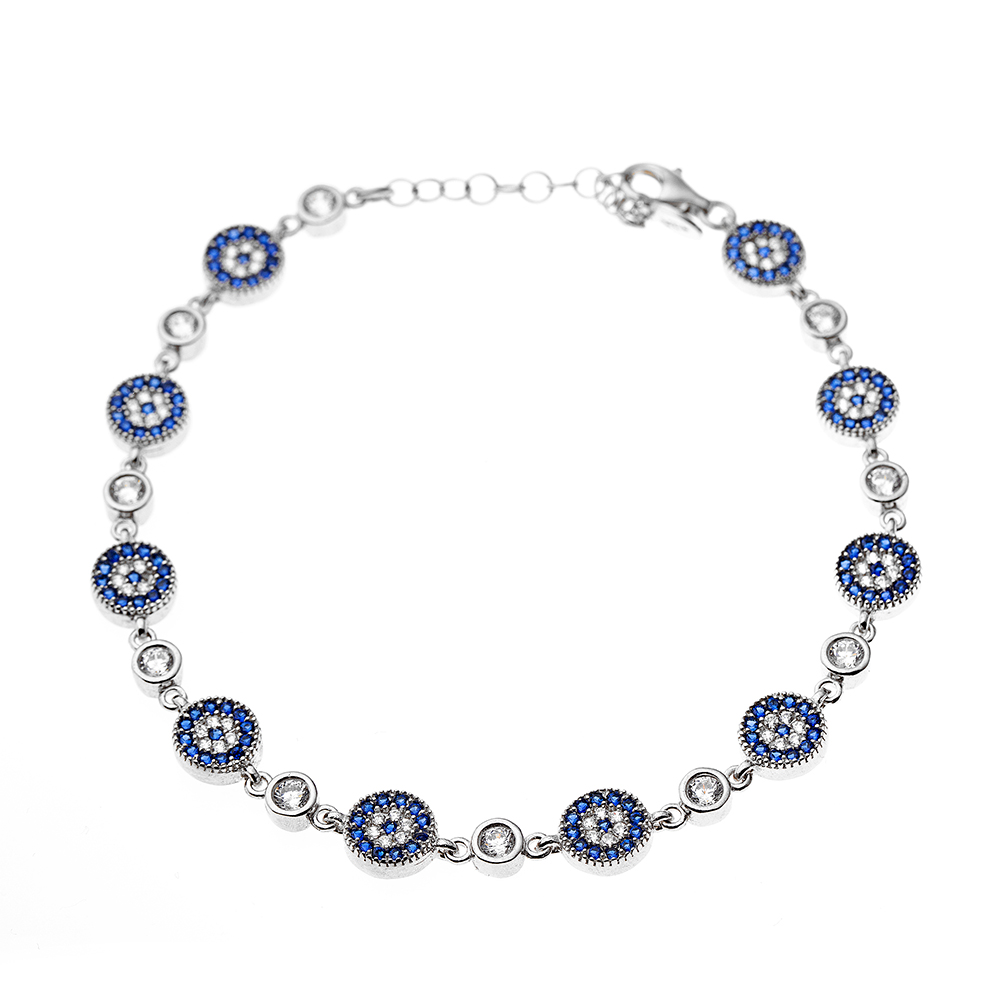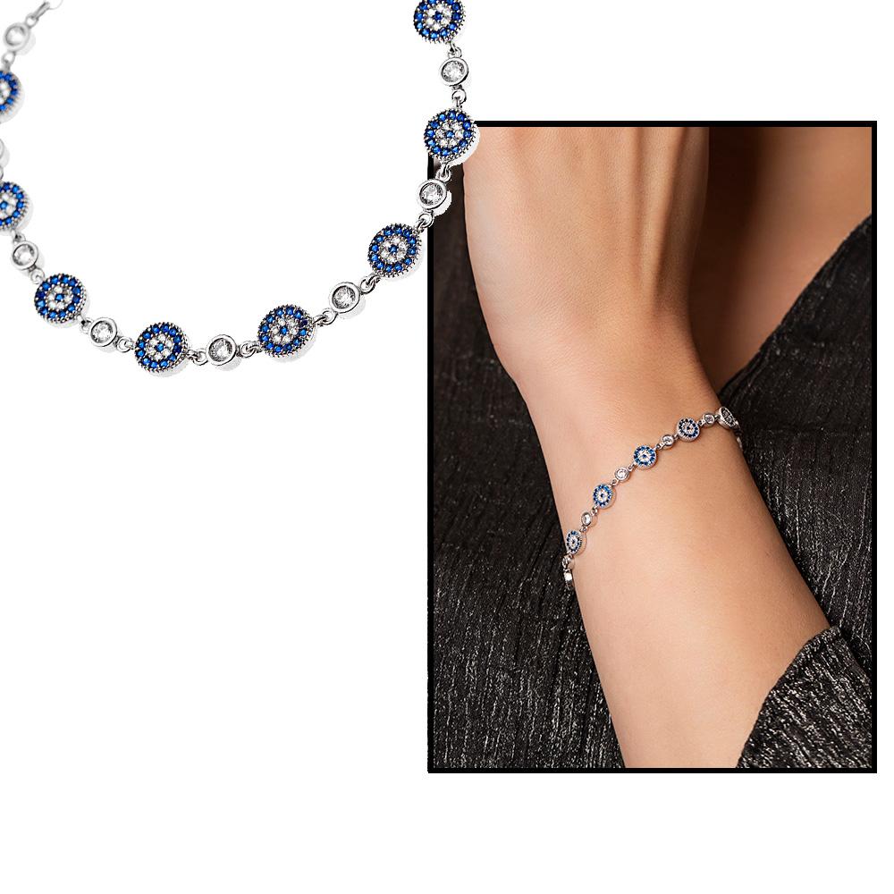 Mavi Beyaz Zirkon Taşlı Çiçek Tasarım Tam Tur 925 Ayar Gümüş Kadın Bileklik