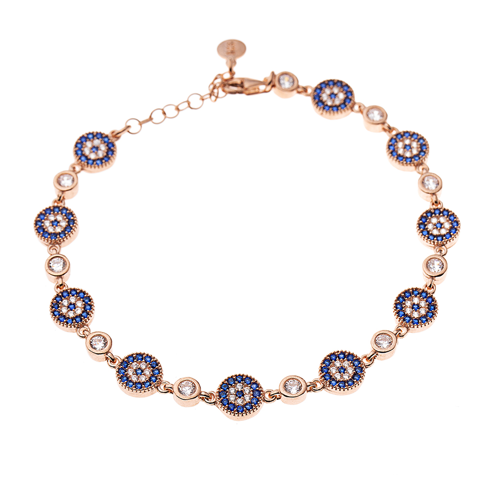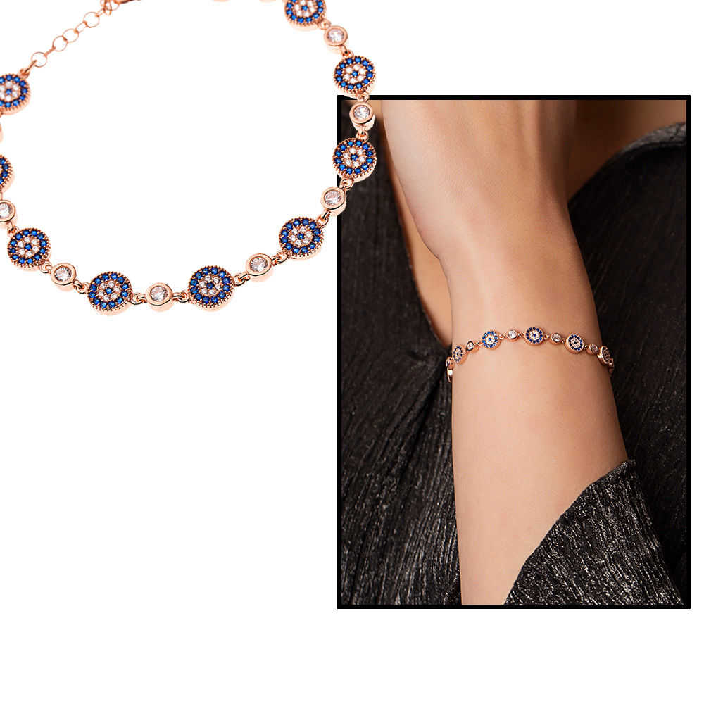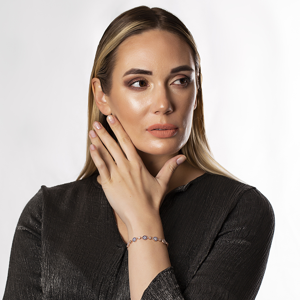 Mavi Beyaz Zirkon Taşlı Çiçek Tasarım Tam Tur Rose 925 Ayar Gümüş Kadın Bileklik