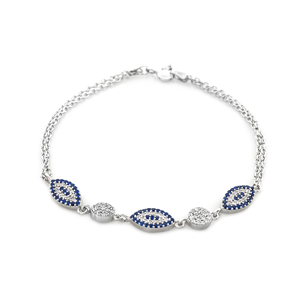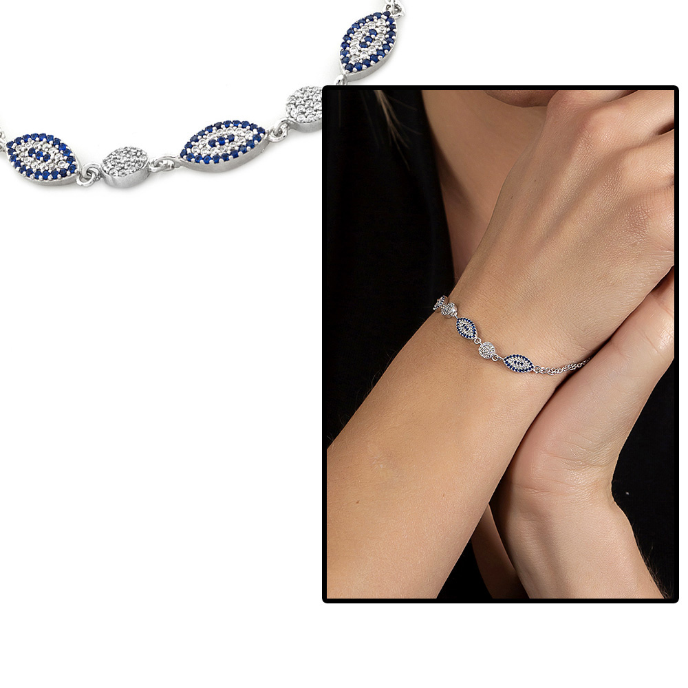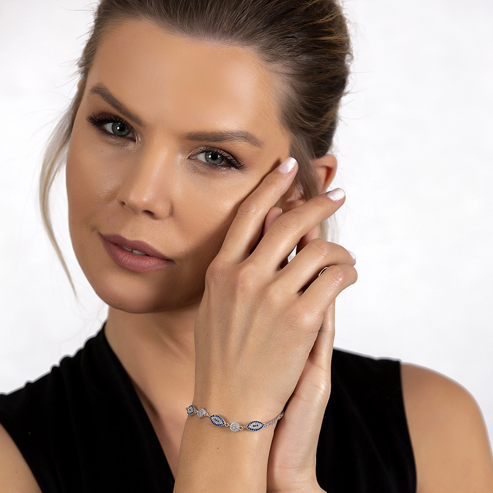 Mavi Beyaz Zirkon Taşlı Oval Tasarım 925 Ayar Gümüş Su Yolu Kadın Bileklik