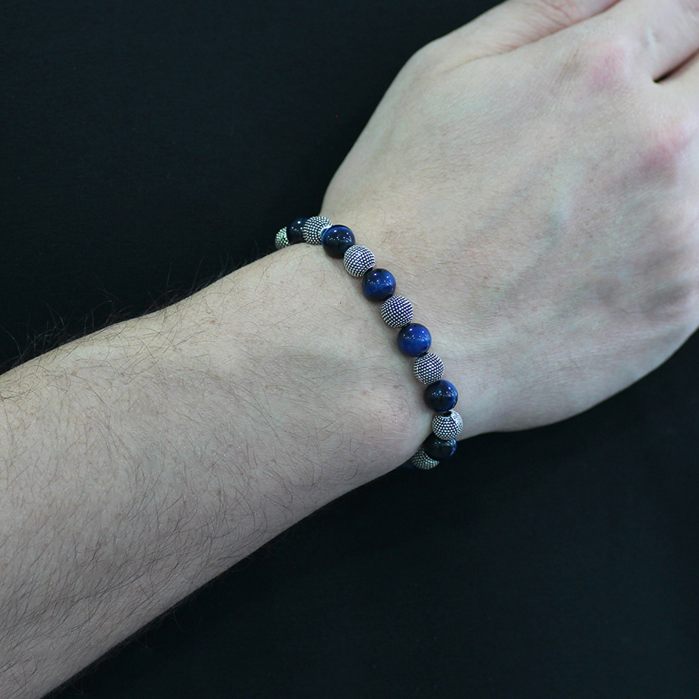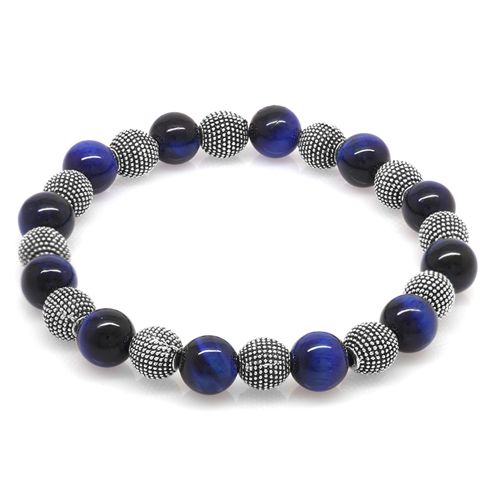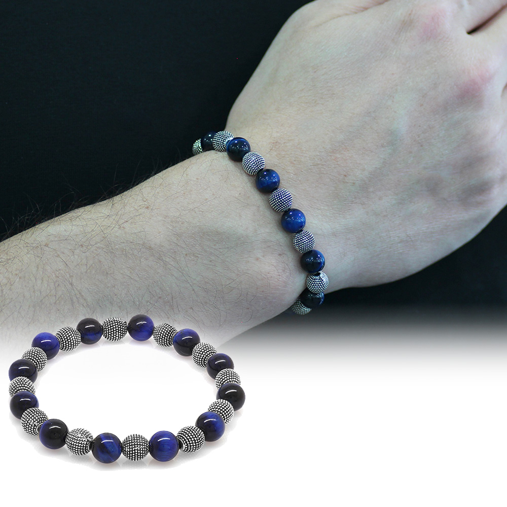Mavi Kaplan Gözü Doğaltaş Bileklik - Metal Kombinli - Küre Kesim