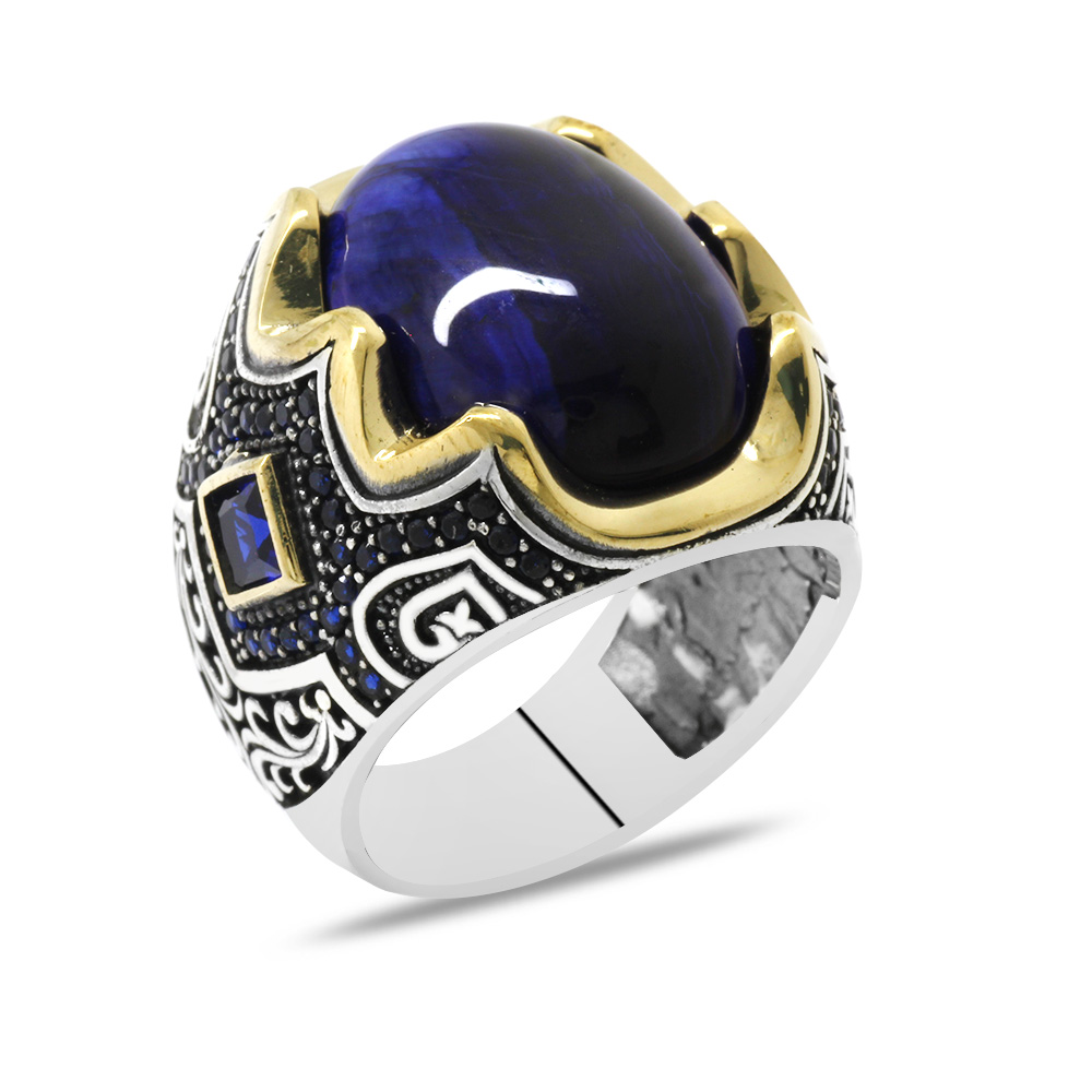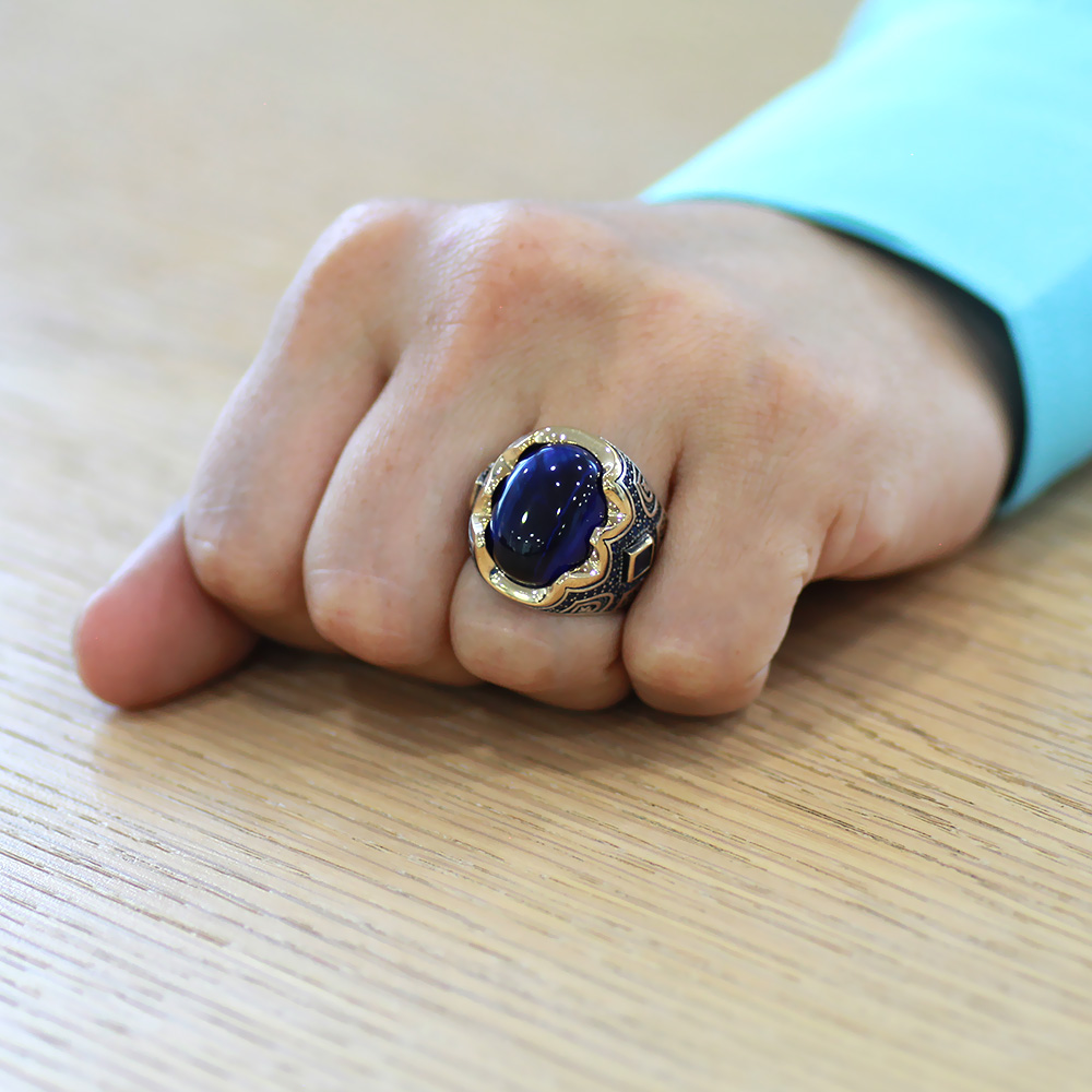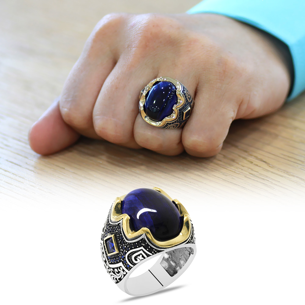 Mavi Kaplan Gözü Taşlı Yanları Gravür İşlemeli 925 Ayar Gümüş Erkek Yüzük