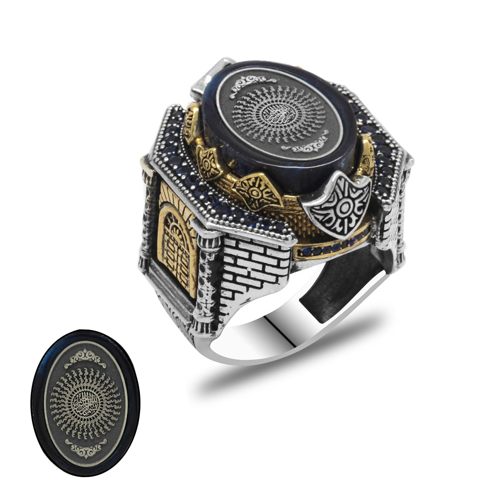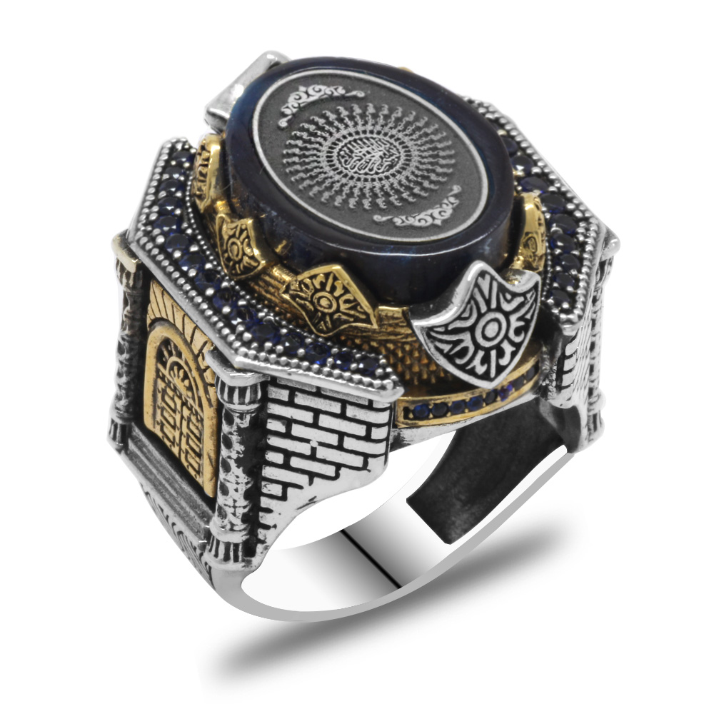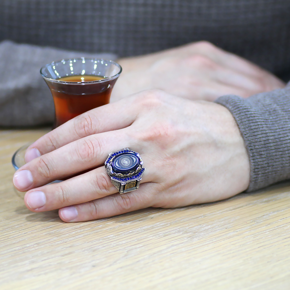 Mavi Kehribar Üzerine Hüsnü Hat 33 Besmelei Şerif Yazılı Kale Tasarım 925 Ayar Gümüş Erkek Yüzük