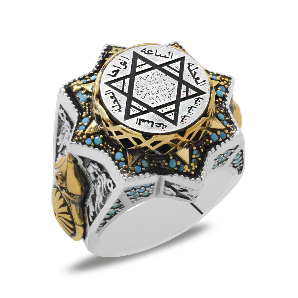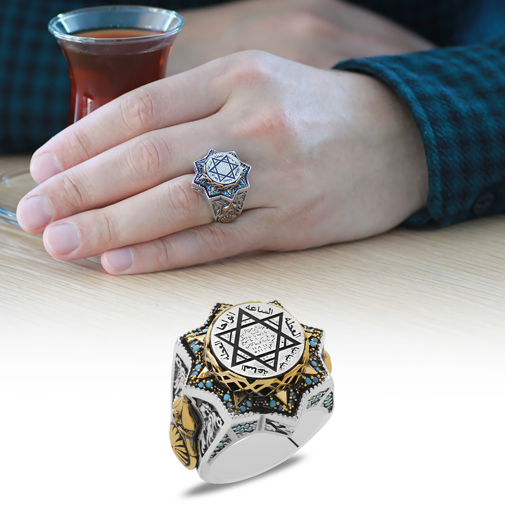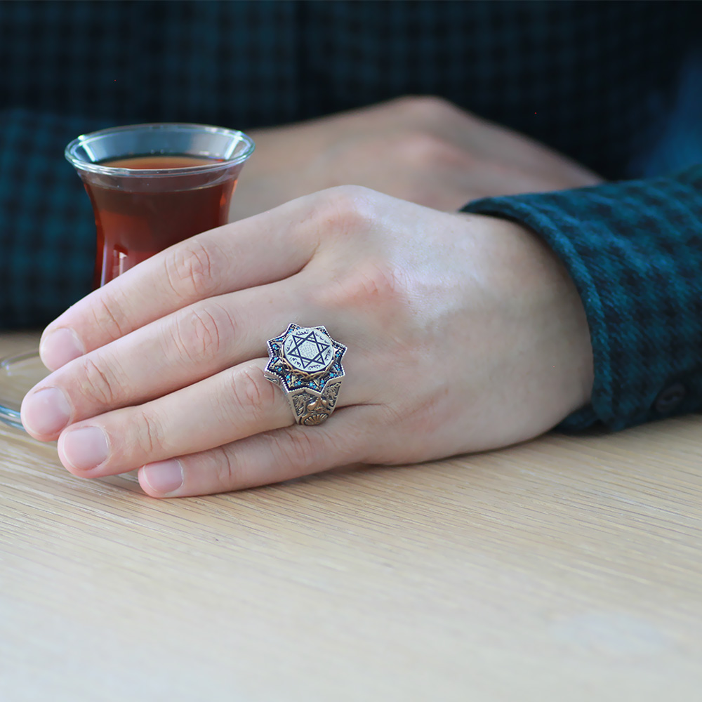 Mavi Sıkma Kehribar Üzerine Mührü Süleyman İşlemeli Yıldız Tasarım 925 Ayar Gümüş Erkek Yüzük