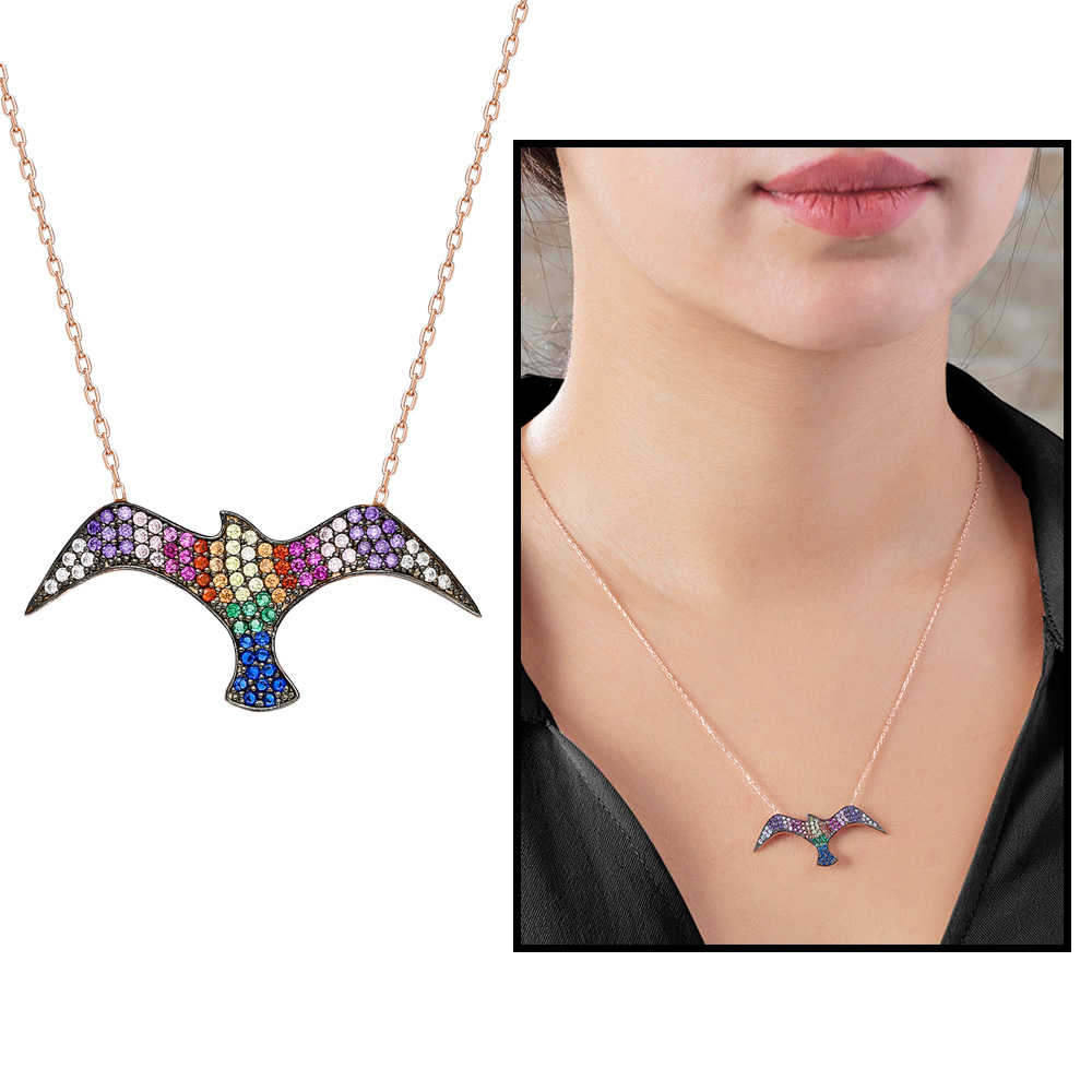 Mavi ve Yeşil Zirkon Taşlı Martı Tasarım 925 Ayar Gümüş Bayan Kolye