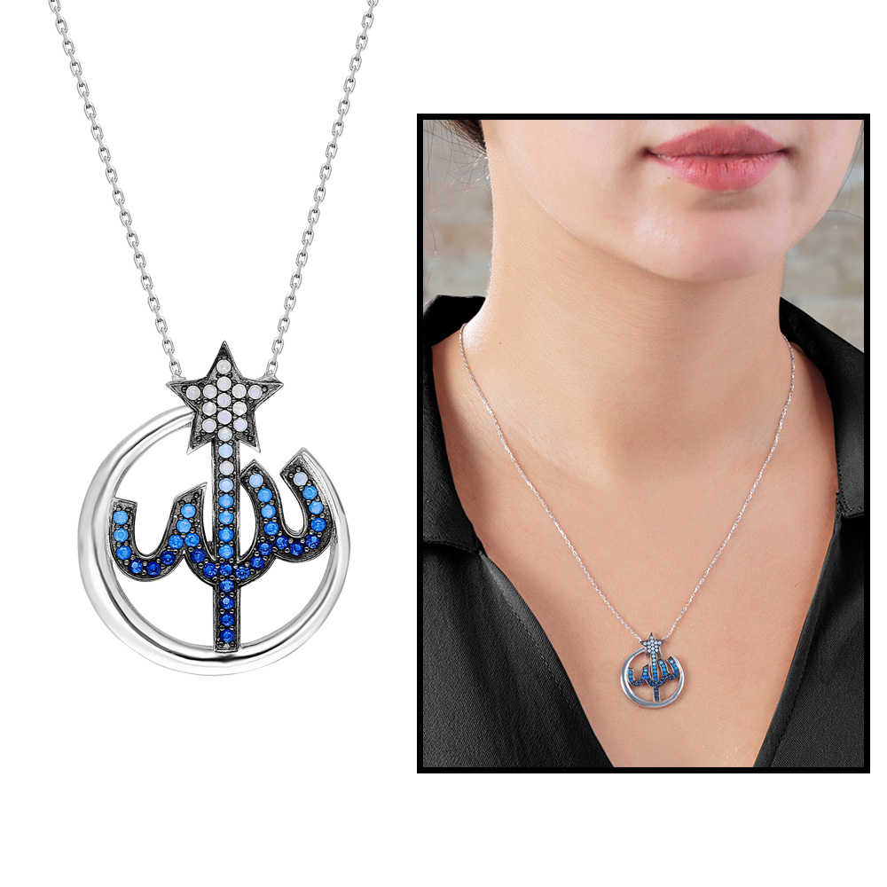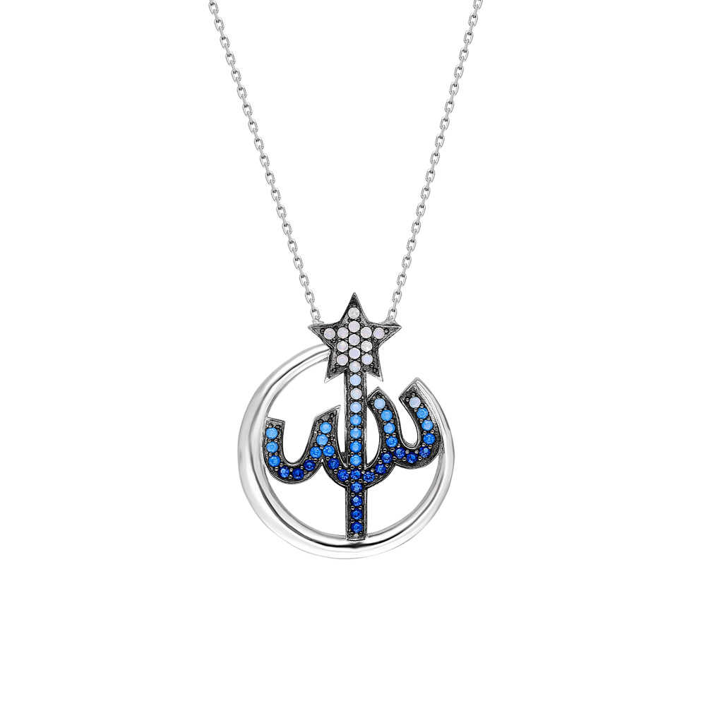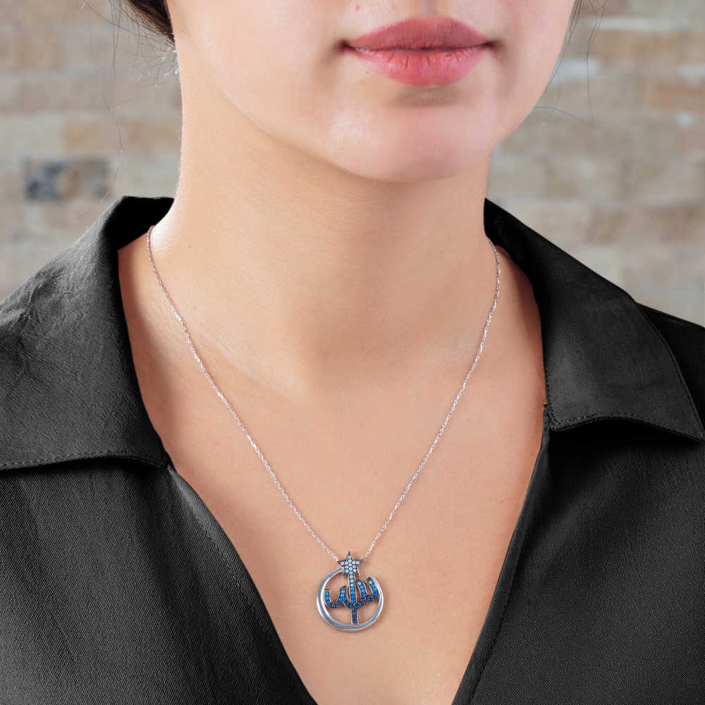 Mavi Zirkon Taşlı Arapça Allah Yazılı 925 Ayar Gümüş Bayan Kolye