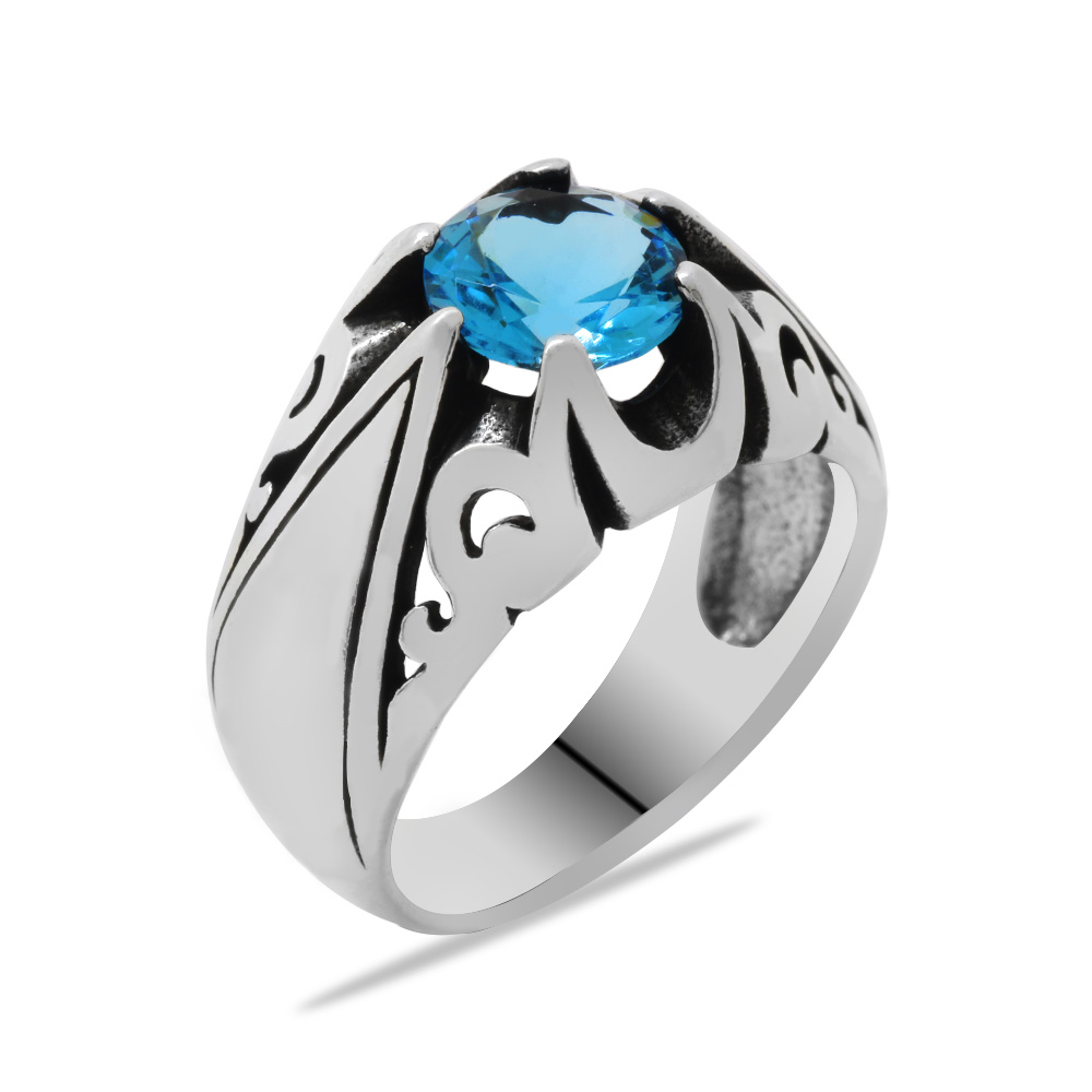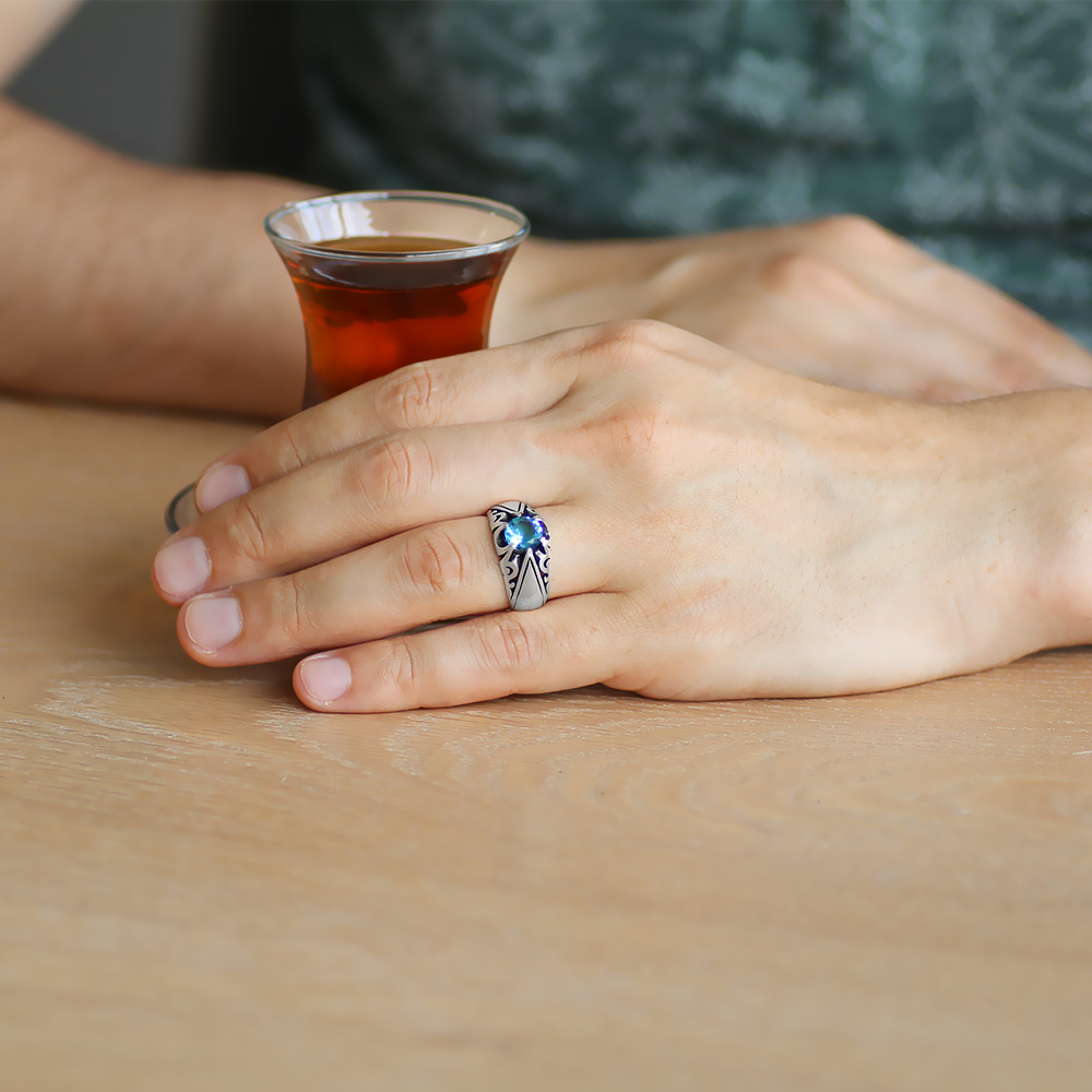 Mavi Zirkon Taşlı Minimal Tasarım 925 Ayar Gümüş Erkek Yüzük