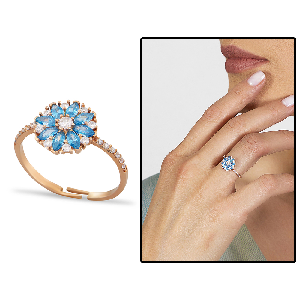 Mavi Zirkon Taşlı Nergis Çiçeği Tasarım Rose Renk 925 Ayar Gümüş Kadın Yüzük - 1
