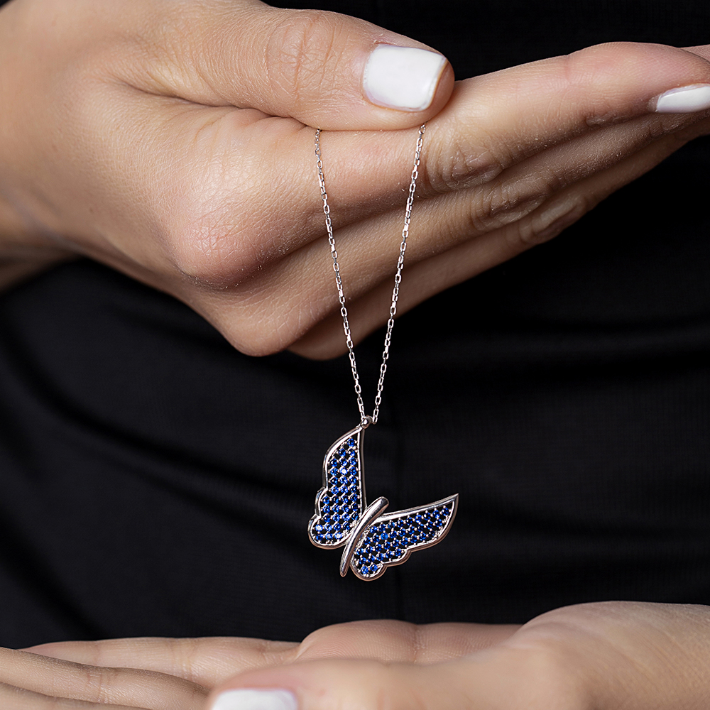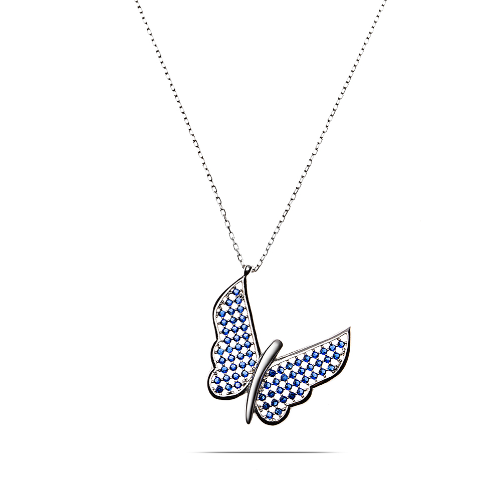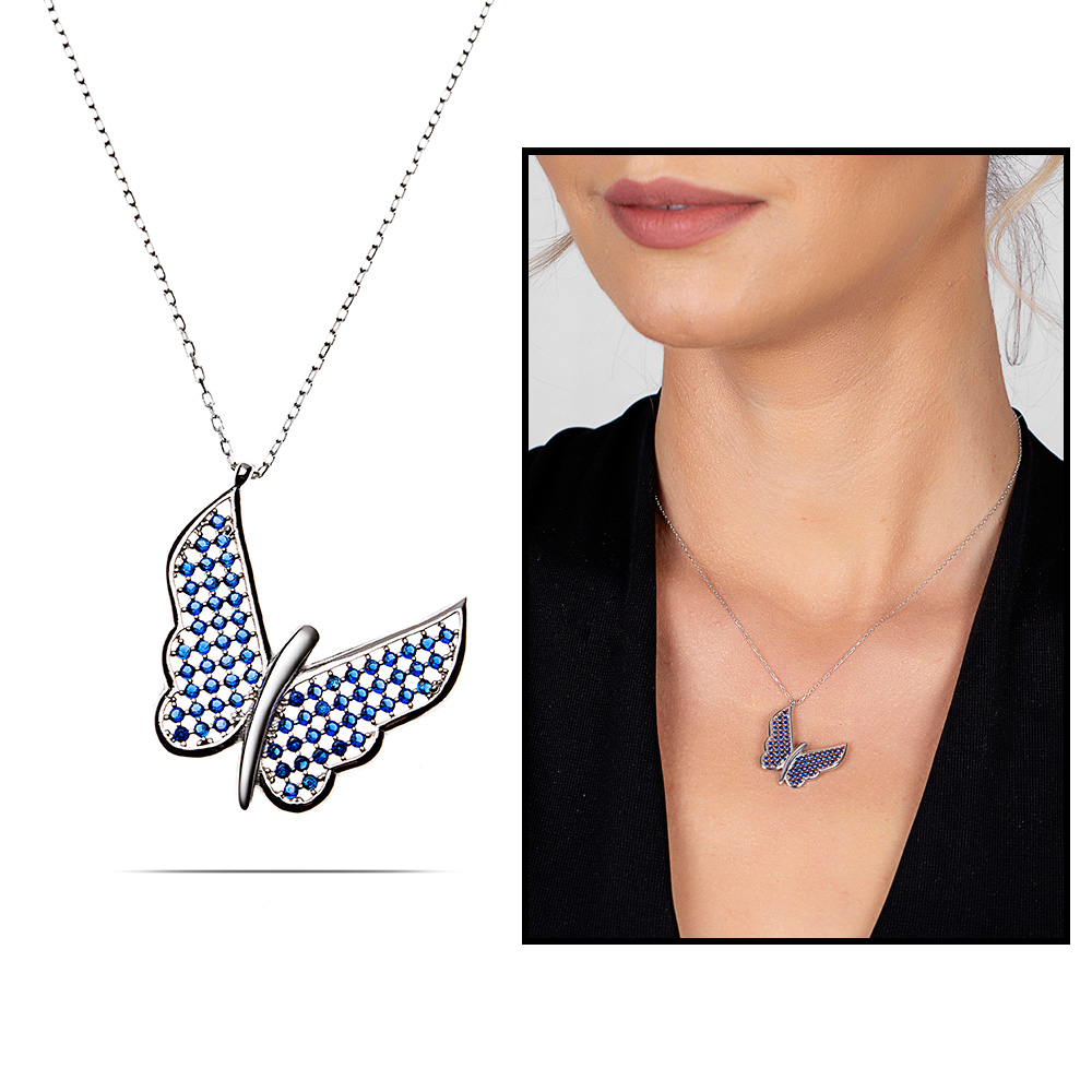 Mavi Zirkon Taşlı Zarif Tasarım 925 Ayar Gümüş Kelebek Kolye