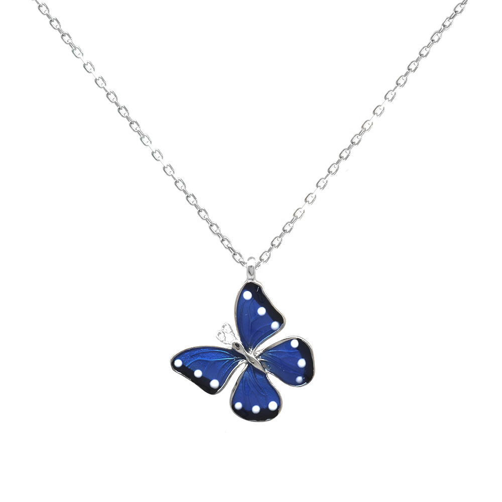 Mavi ve Beyaz Mineli Kelebek Tasarım Gümüş Renk 925 Ayar Gümüş Kadın Kolye