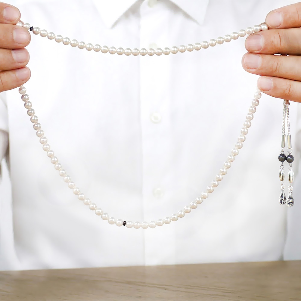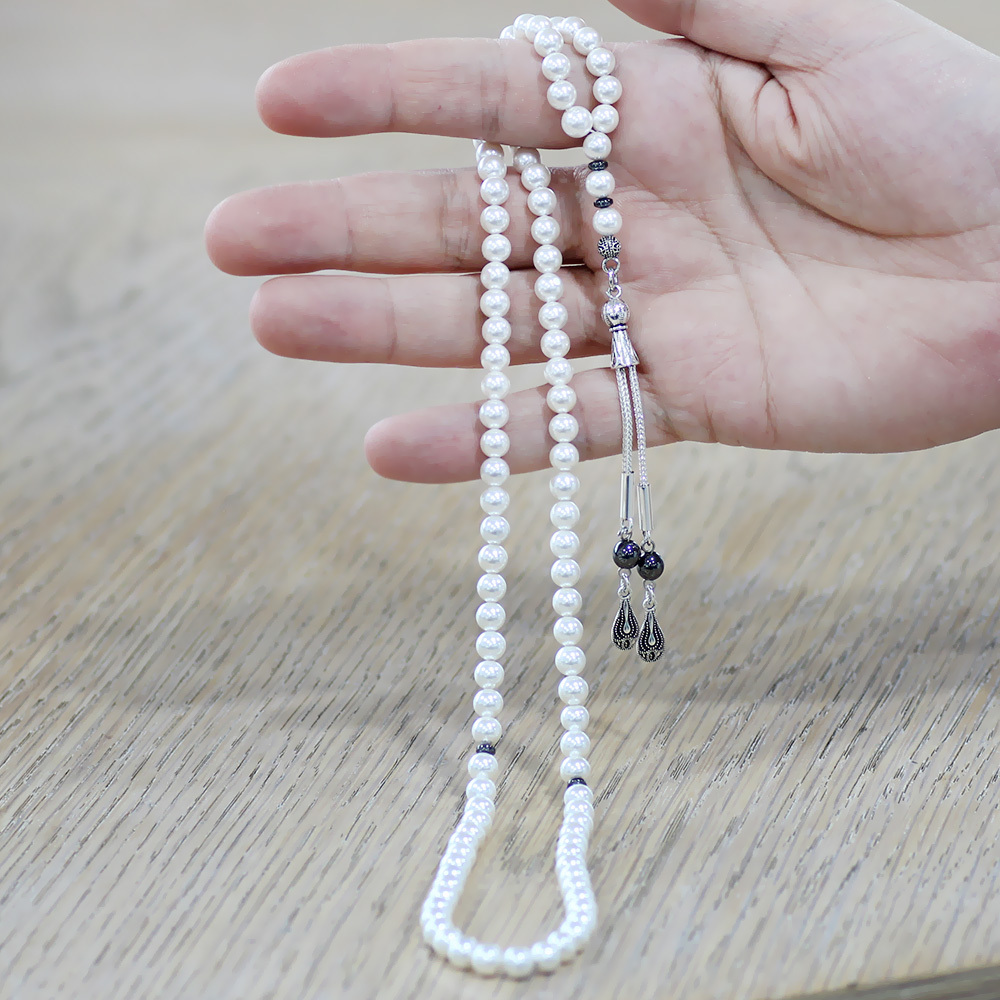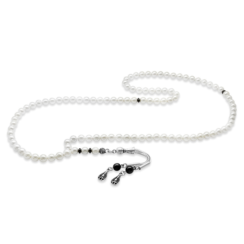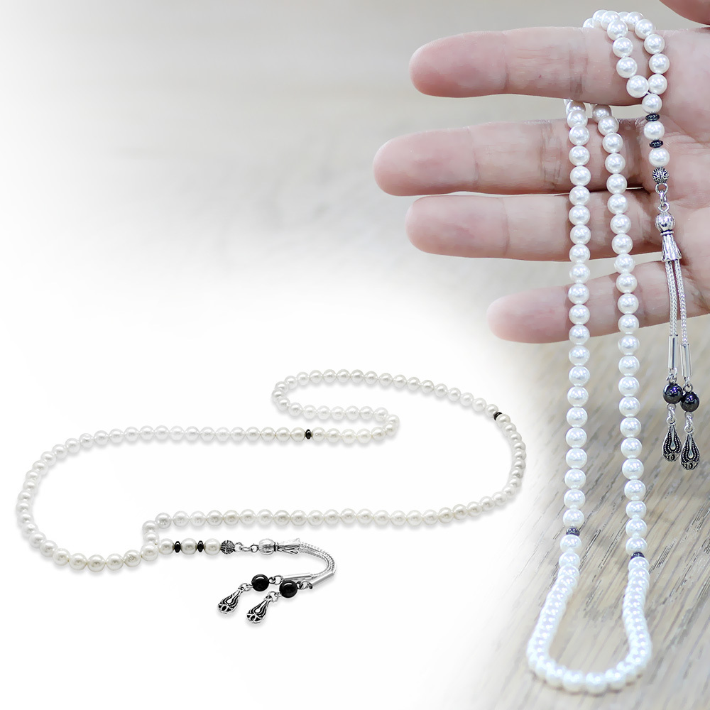 Mayorka İnci Doğaltaş Namaz Tesbihi - Kararmaz Metal Damla Püsküllü - Beyaz Renk - Küre Kesim