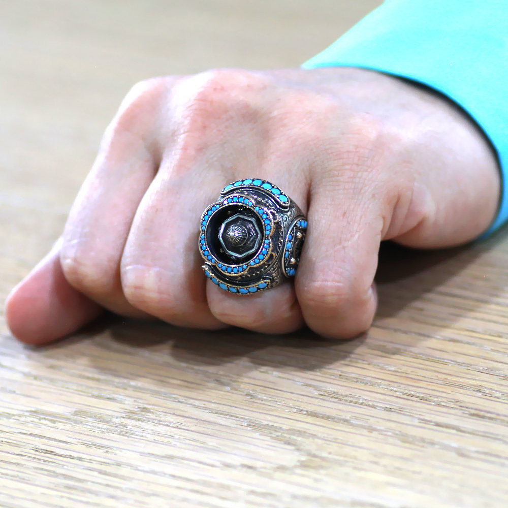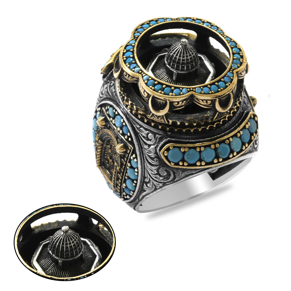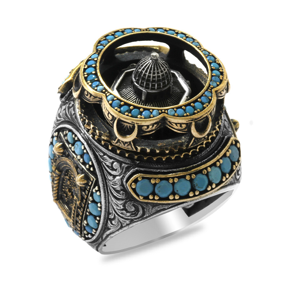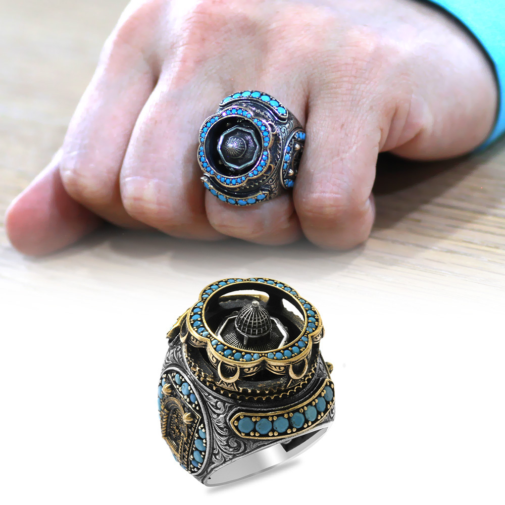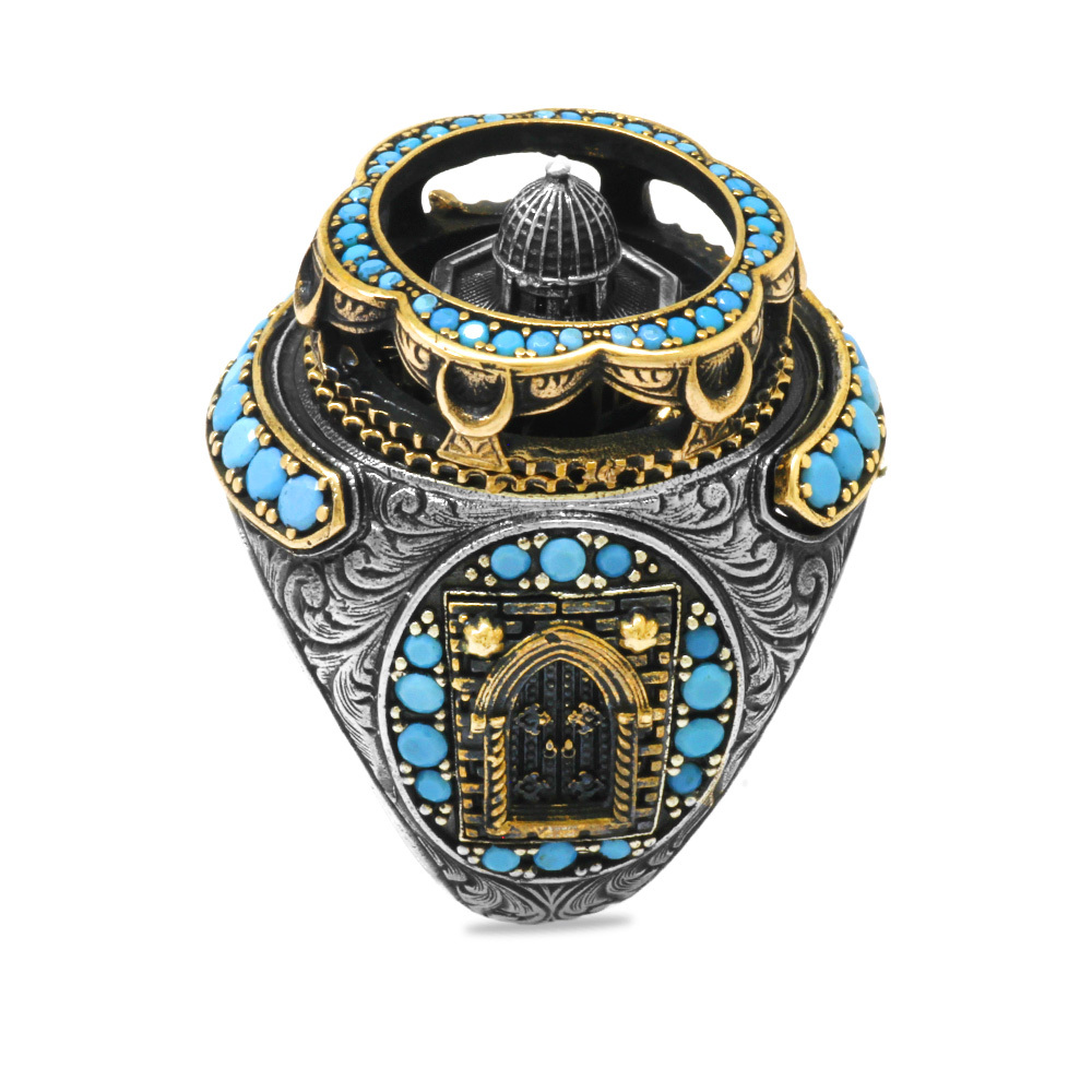 Mescidi Aksa Detaylı Kenarları Mikro Firuze Taş Süslemeli Avangarde 925 Ayar Gümüş Erkek Yüzük