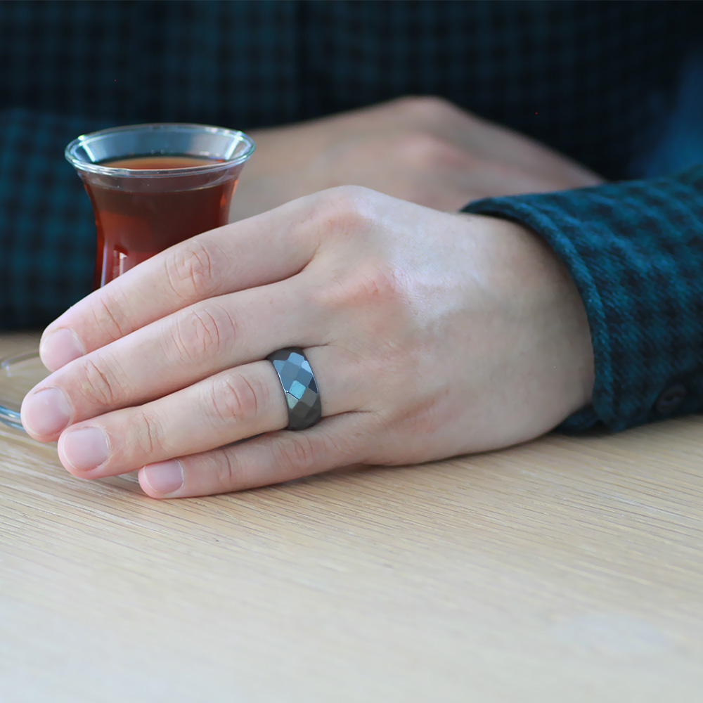 Metalik Gri Renkli Faset Kesim Hematit Doğaltaş Erkek Yüzük 14 Ölçü