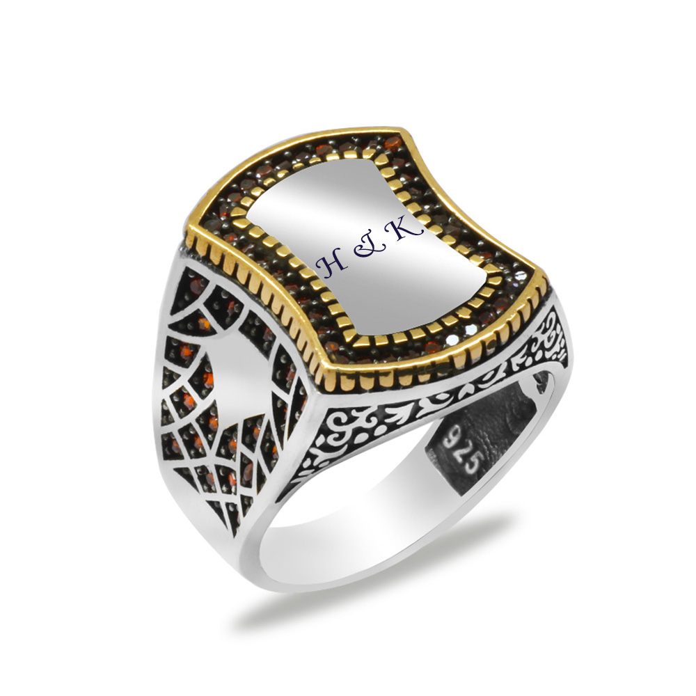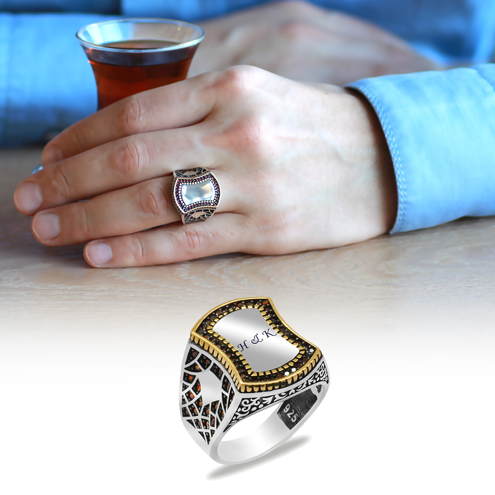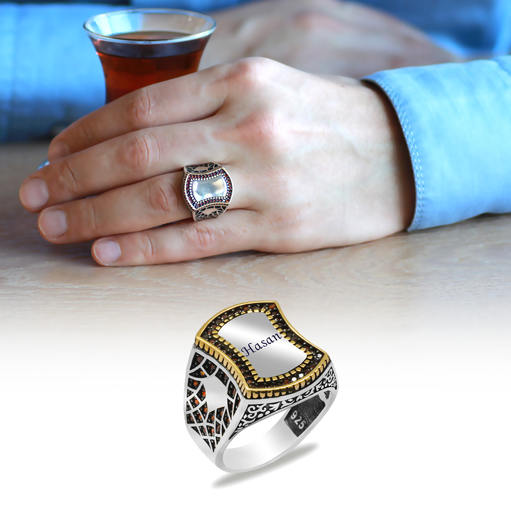 Mikro Kırmızı Zirkon Taş Mıhlamalı İtalyan Tasarım İsme Özel Veya Harf Yazılı 925 Ayar Gümüş Erkek Yüzük