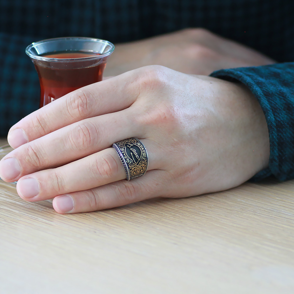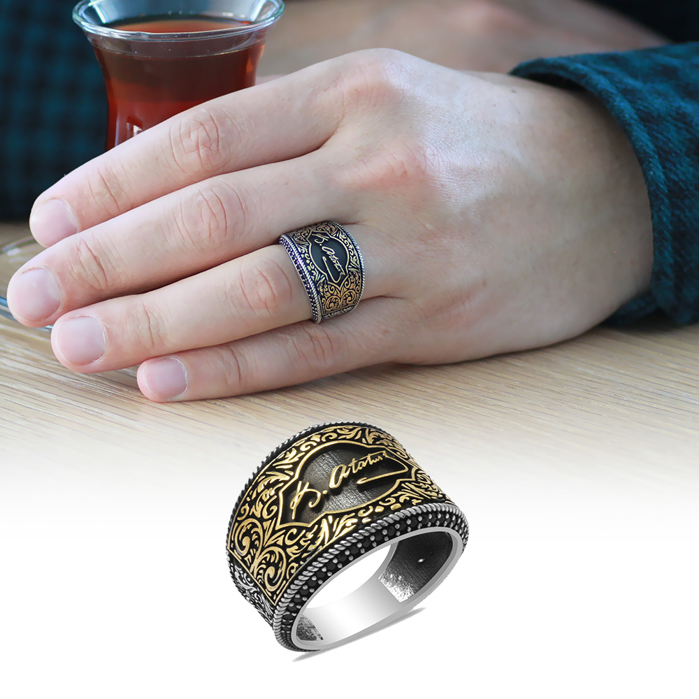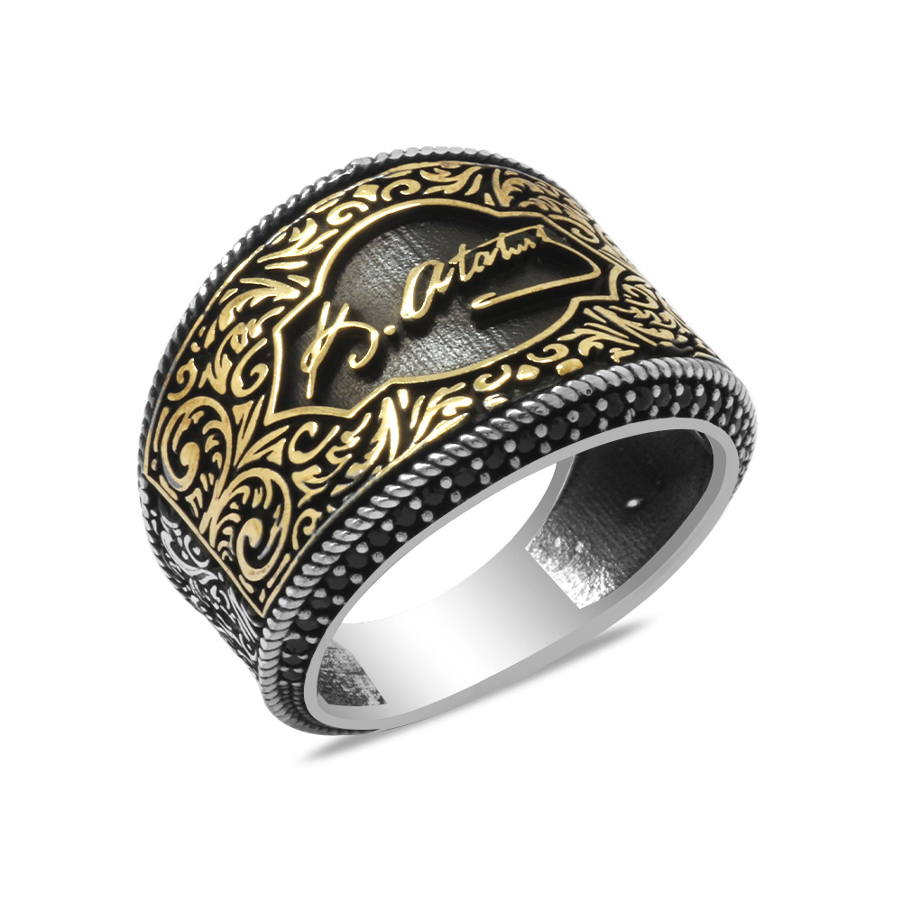 Mikro Siyah Zirkon Taş Mıhlamalı Atatürk İmzalı 925 Ayar Gümüş Erkek Yüzük