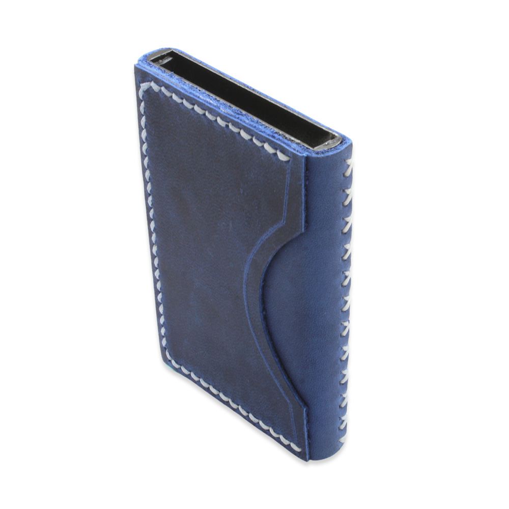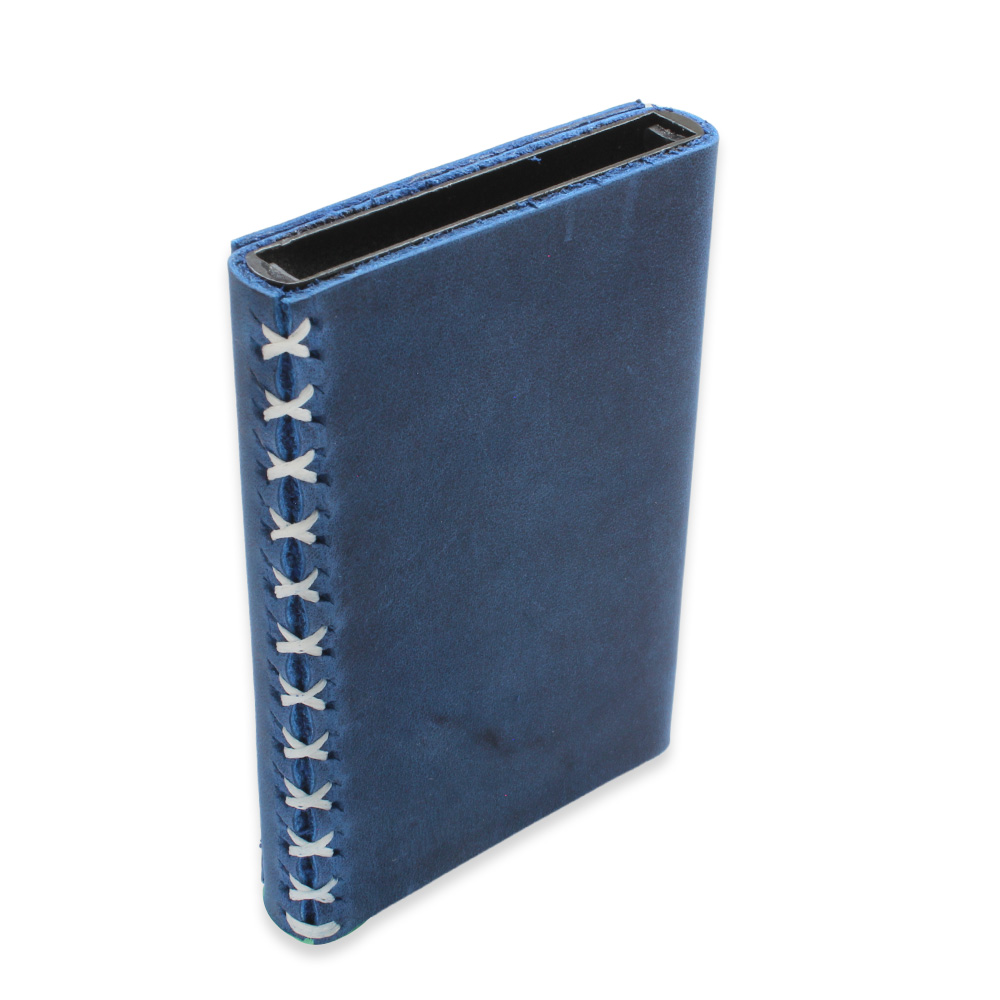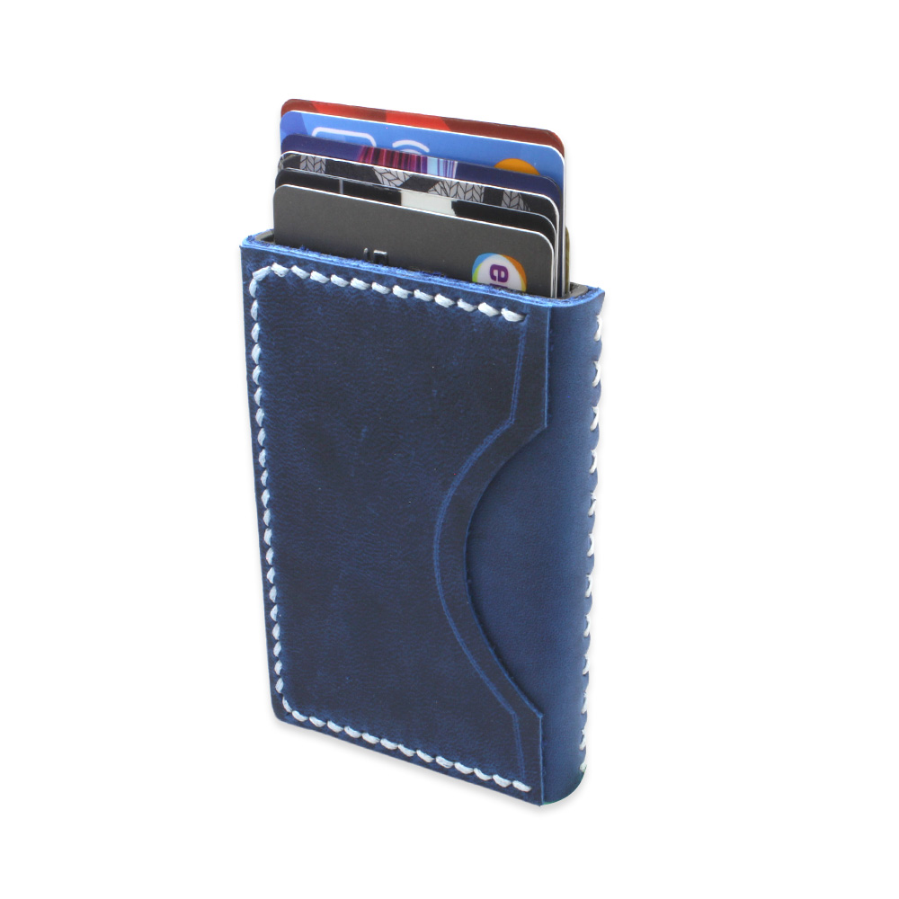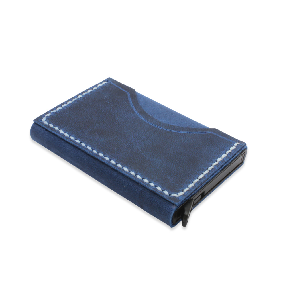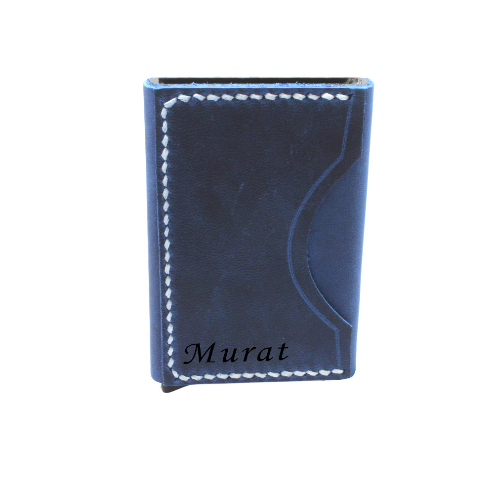 Tamamı El Dikişi Mavi Hakiki Deriden Mekanizmalı İsme Özel Yazılı Kartlık Cüzdan M3