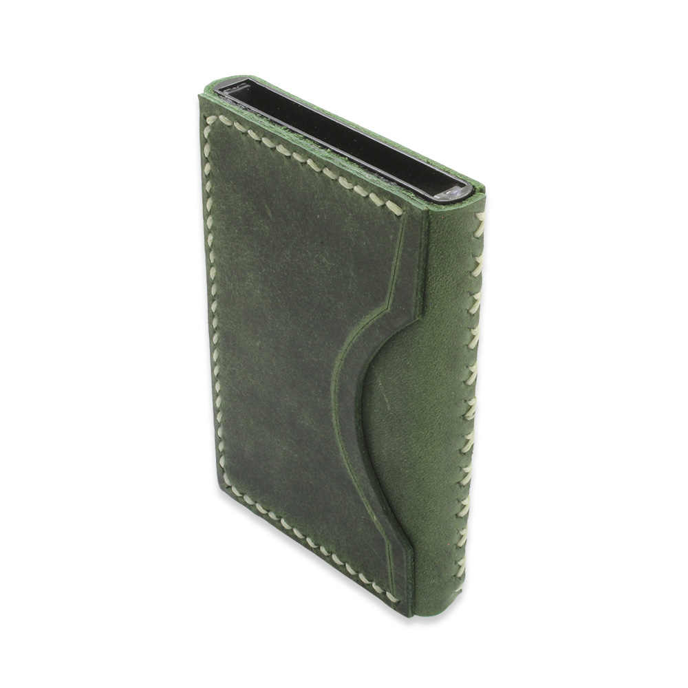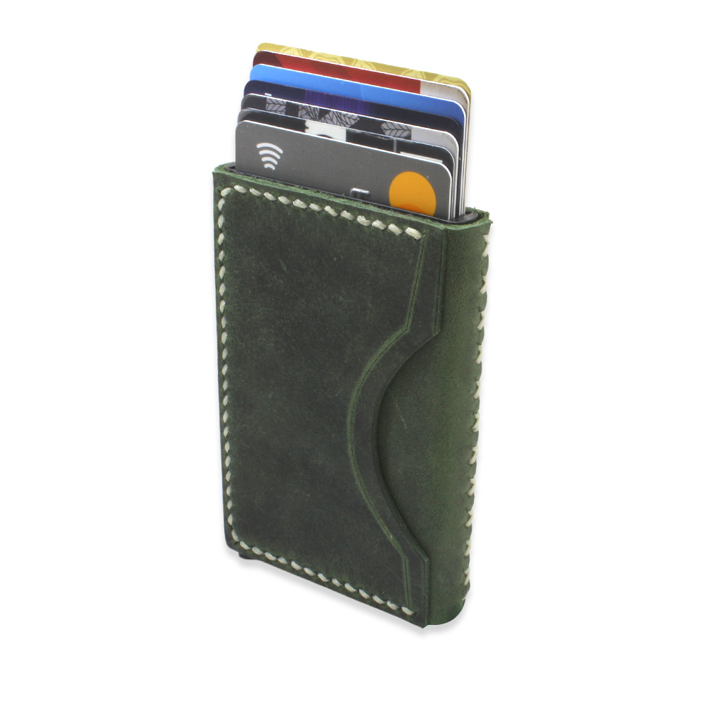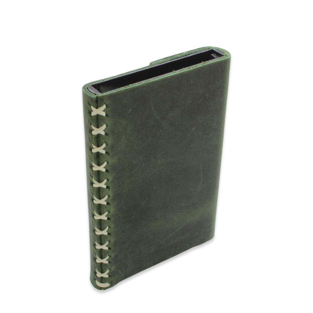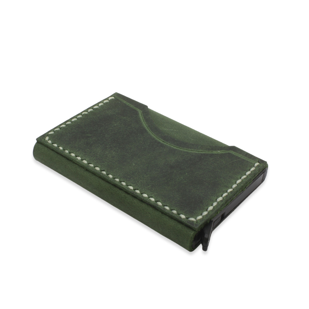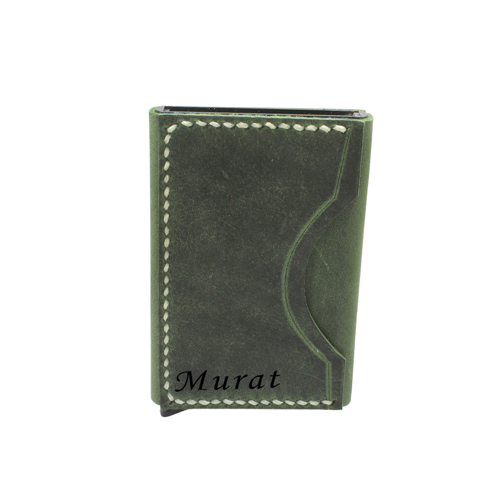 Tamamı El Dikişi Yeşil Hakiki Deriden Mekanizmalı İsme Özel Yazılı Kartlık Cüzdan M3