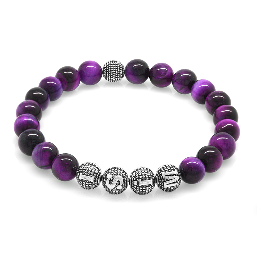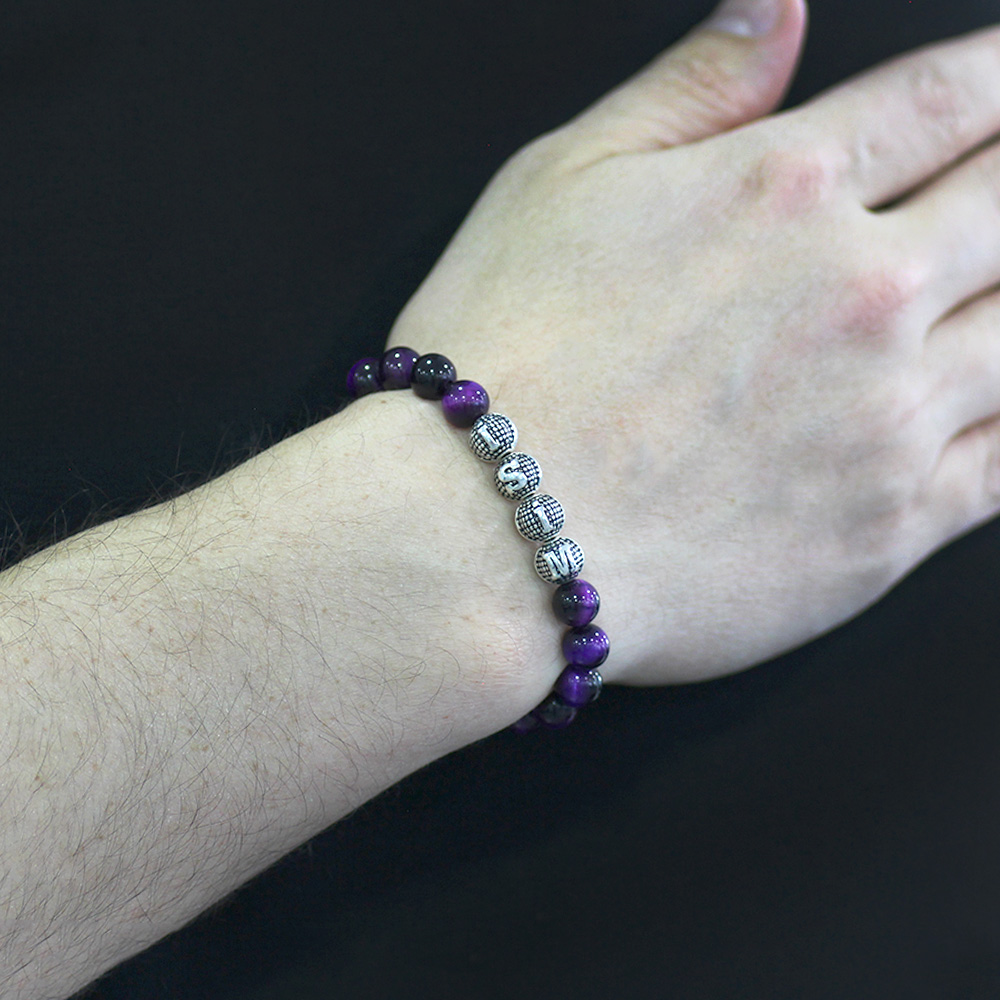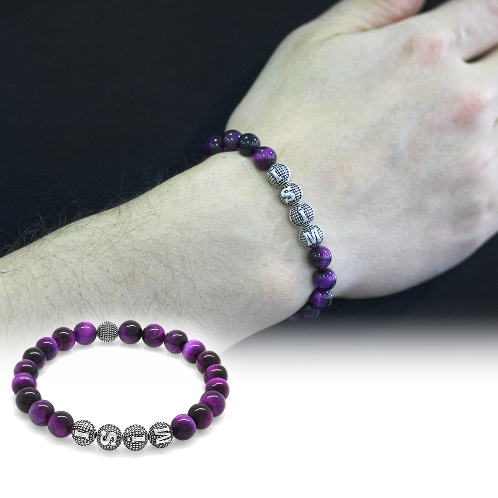 Mor Kaplan Gözü Doğaltaş Bileklik - İsme Özel Yazılı - Metal Kombinli - Küre Kesim