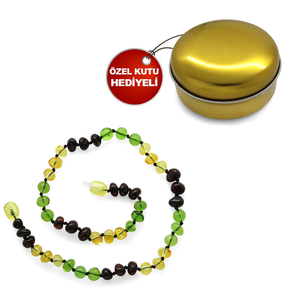 Şeffaf Yeşil Kırmızı Renkli Şık Kutulu Özel Seri Naturel Damla Kehribar Taşlı Bebek Diş Kolyesi