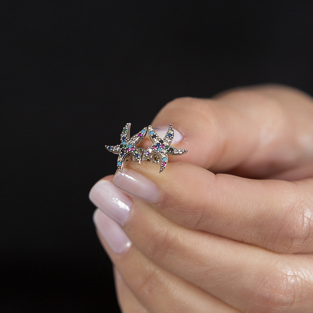 Çok Renkli Zirkon Taşlı Deniz Yıldızı Tasarım 925 Ayar Gümüş Kadın Küpe