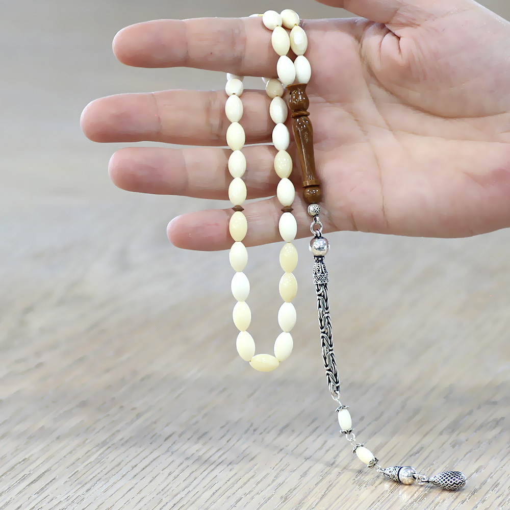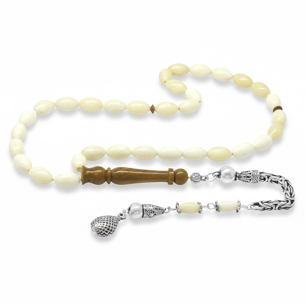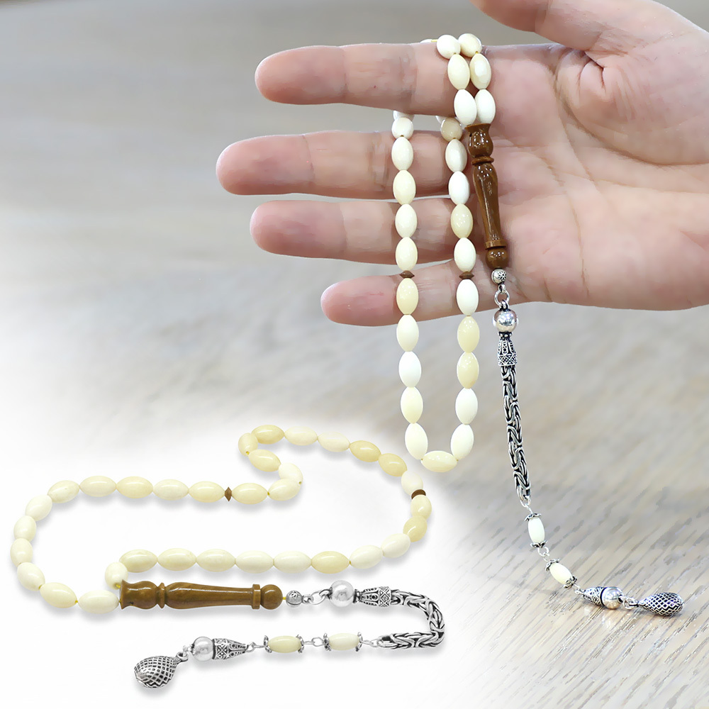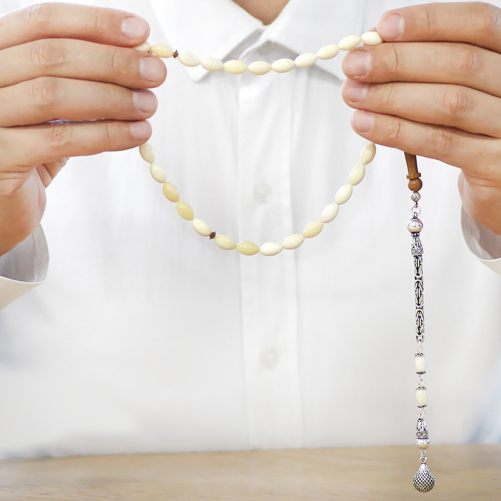 Natural Deve Kemiği Tesbih - 925 Ayar Gümüş Püsküllü - Kuka İmameli - Krem Rengi - Arpa Kesim