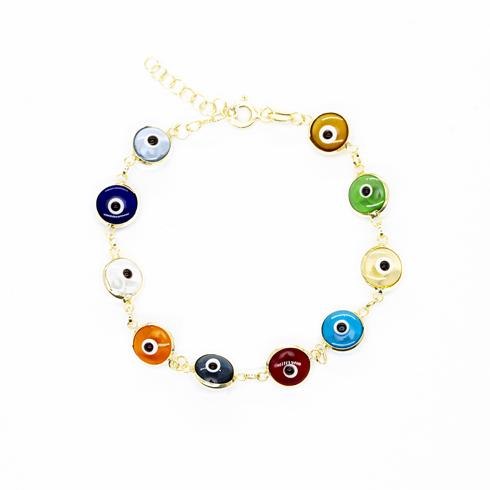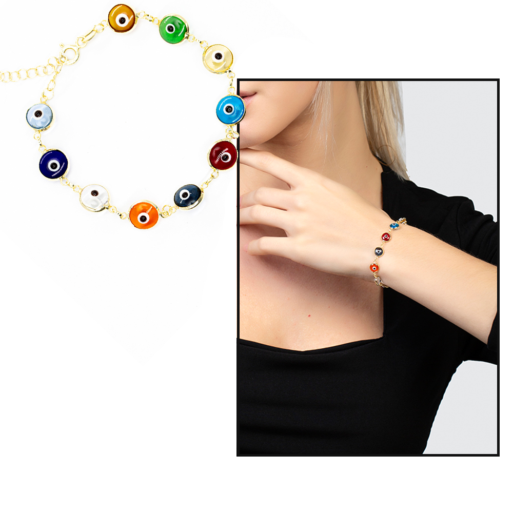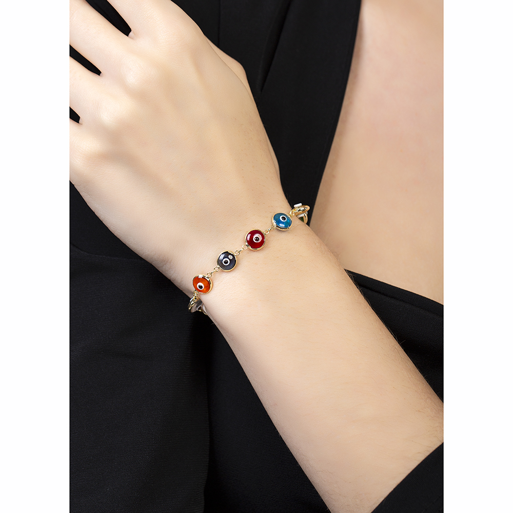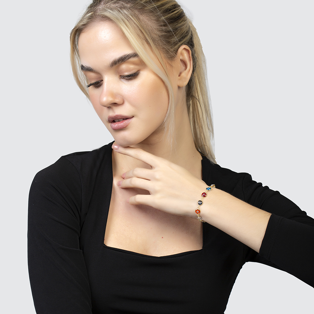 Nazar Boncuğu Detaylı Çok Renkli Altın Renk 925 Ayar Gümüş Kadın Bileklik