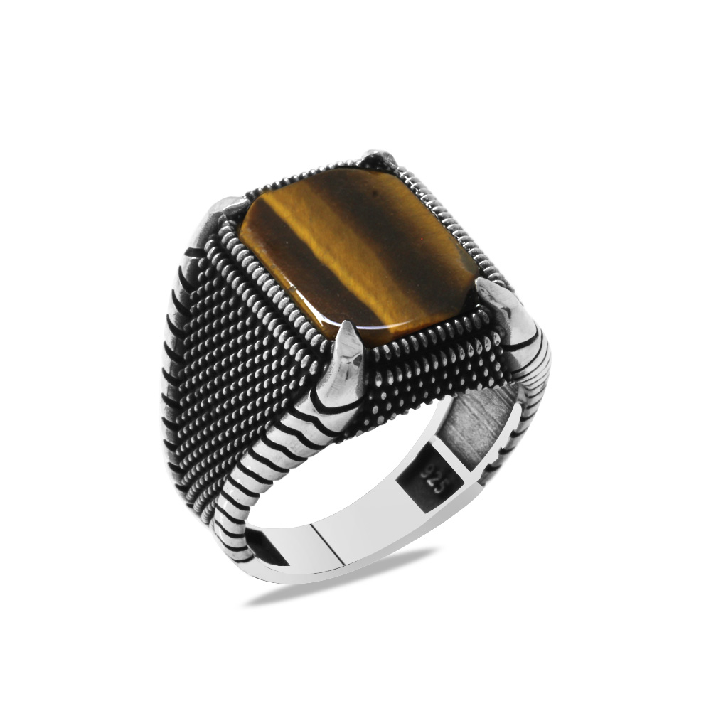 Nokta İşlemeli Kartal Pençesi Detaylı Kaplan Gözü Taşlı 925 Ayar Gümüş Erkek Yüzük