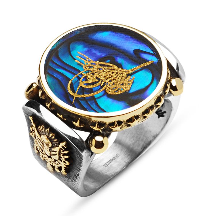 | Ürün Adı | Okyanus Sedefi Üzerine Altın Varak Tuğralı Arma Tasarım Gümüş Yüzük |