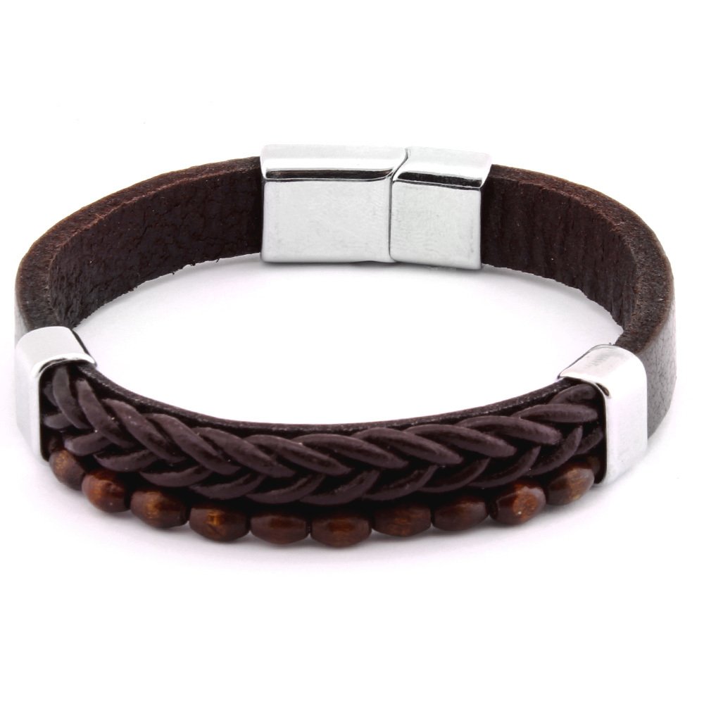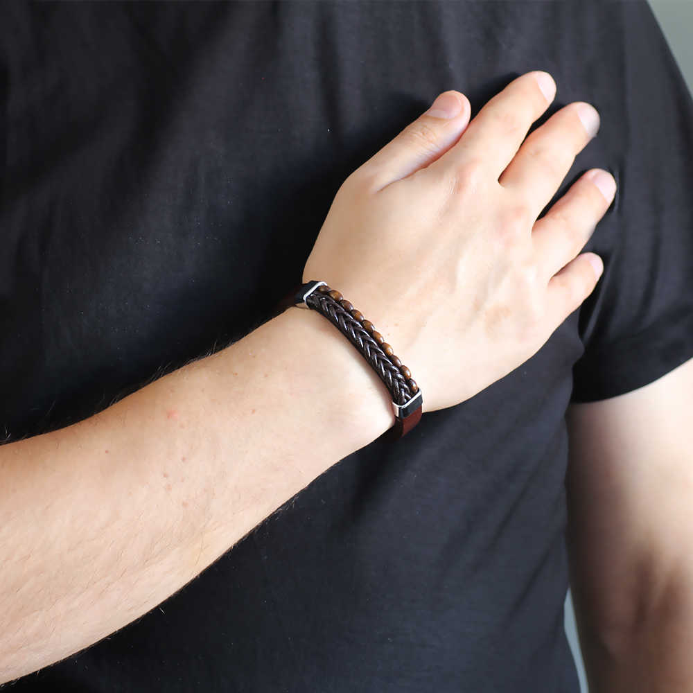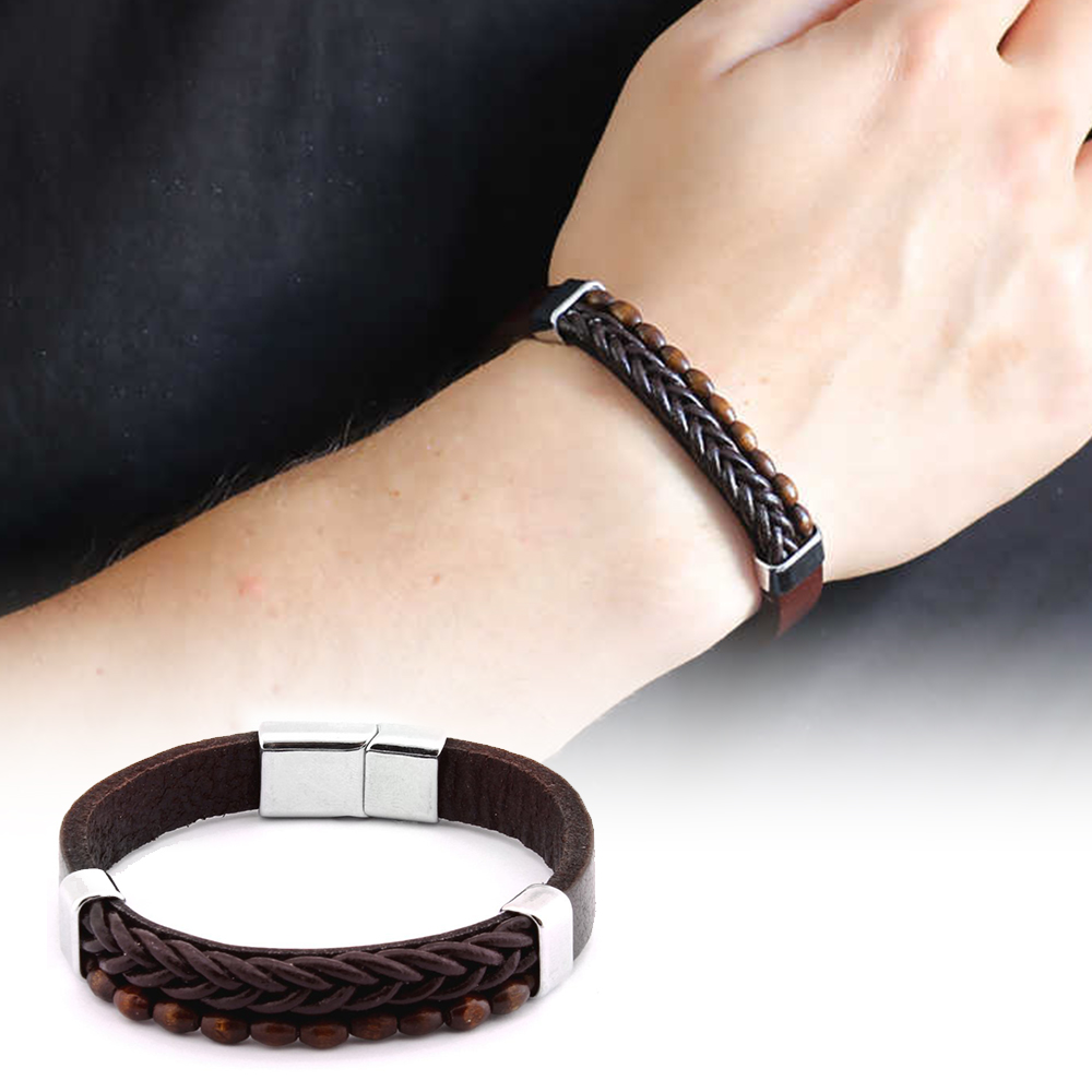 Hasır Tasarım Kuka İşlemeli Kahverengi Çelik Deri Kombinli Erkek Bileklik