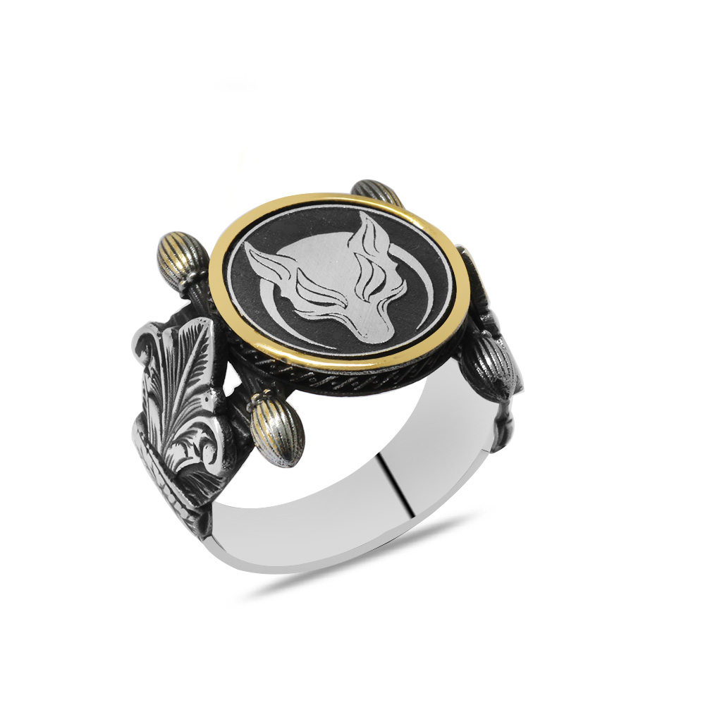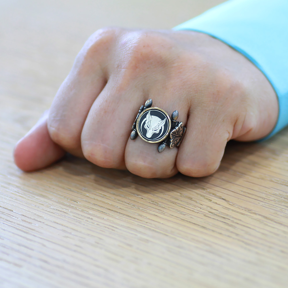 Otantik Tasarım Hilal Detaylı Bozkurt Motifli 925 Ayar Gümüş Erkek Yüzük