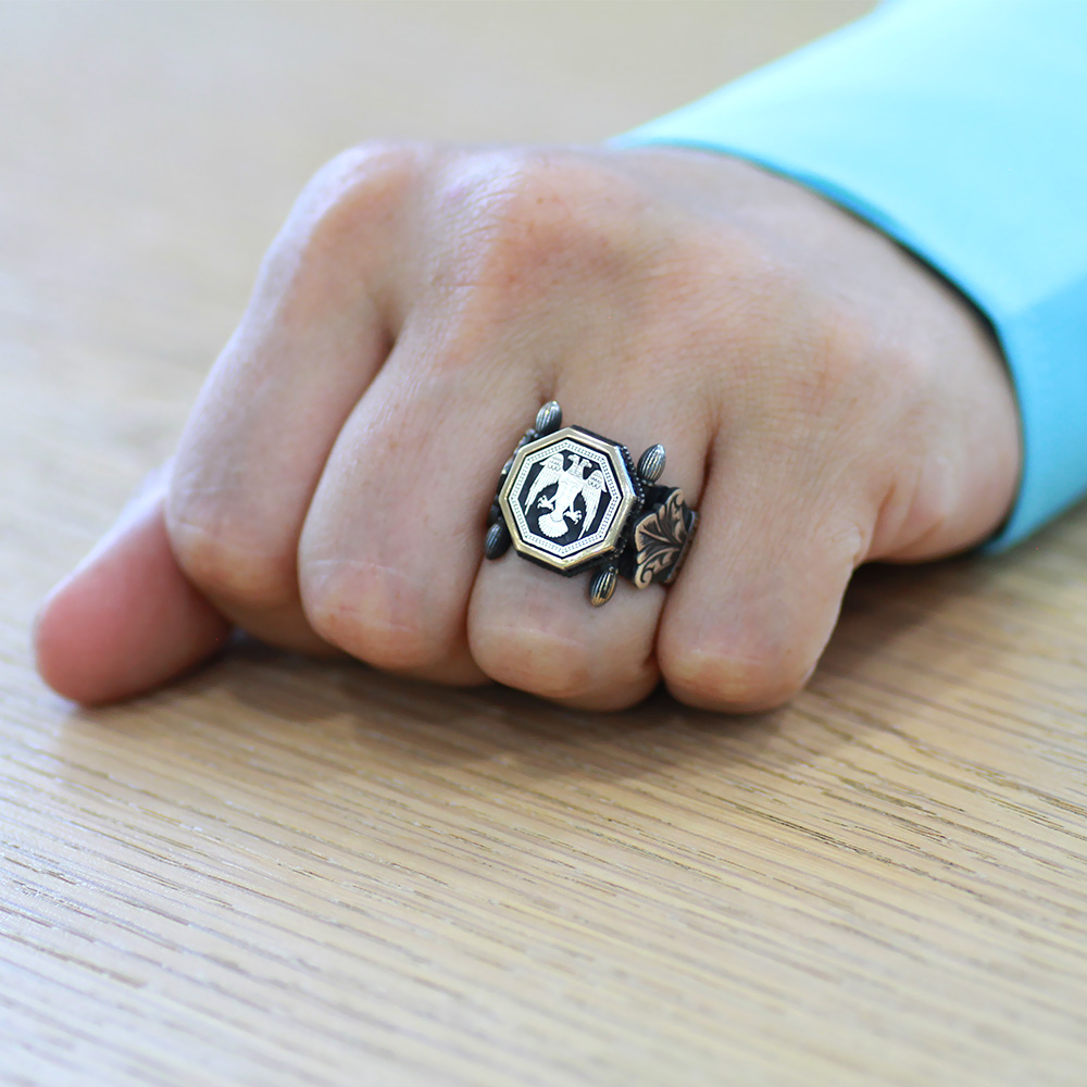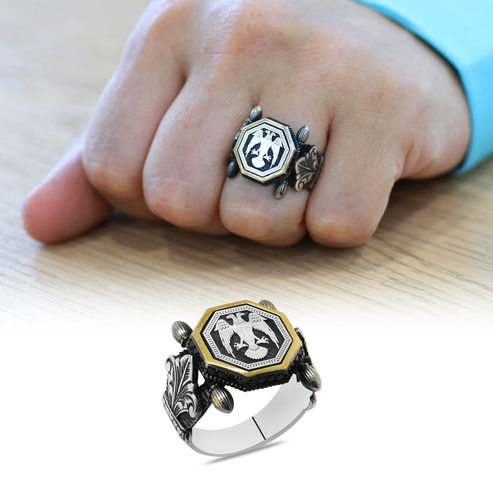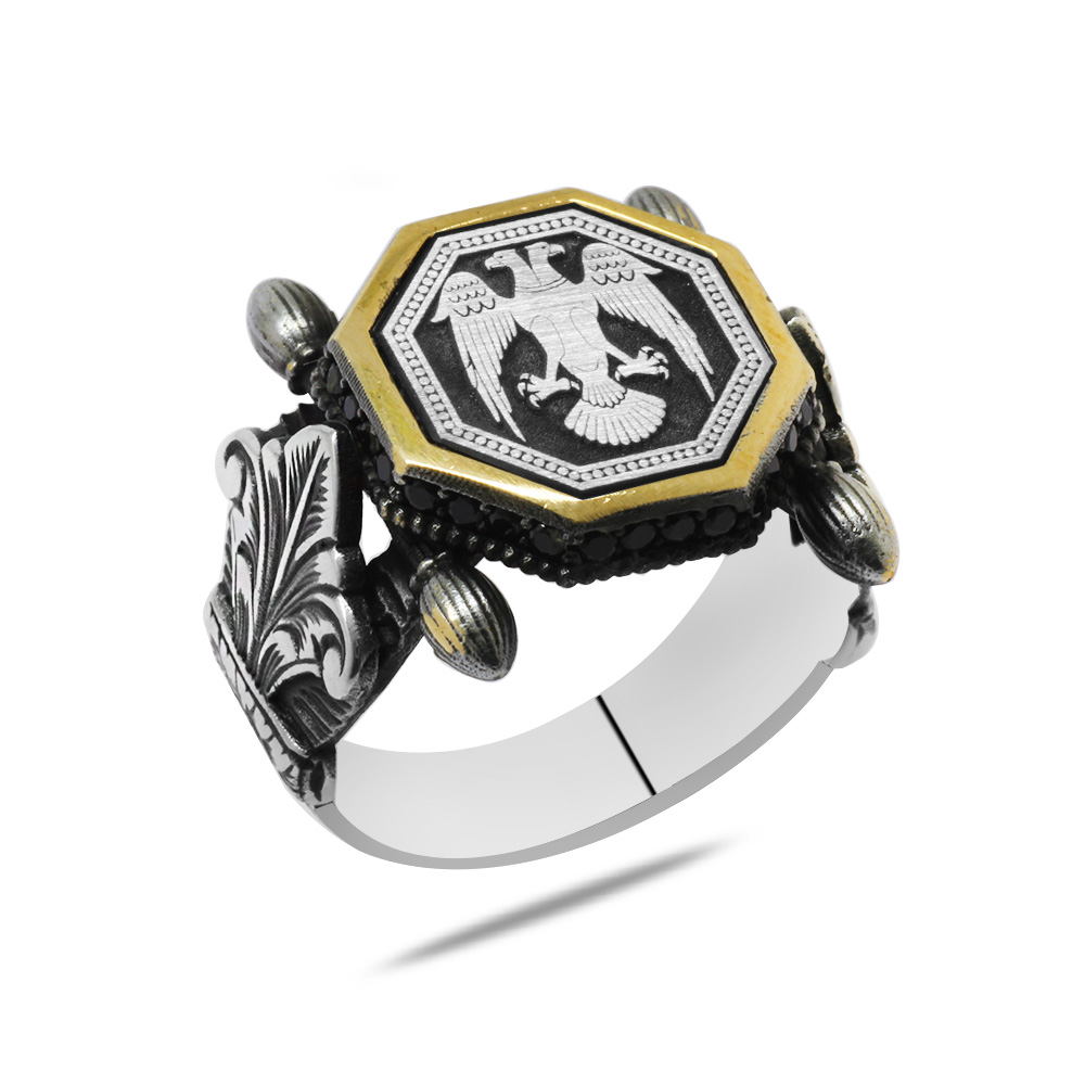Otantik Tasarım Siyah Zirkon Taşlı Selçuklu Kartalı İşlemeli 925 Ayar Gümüş Erkek Yüzük