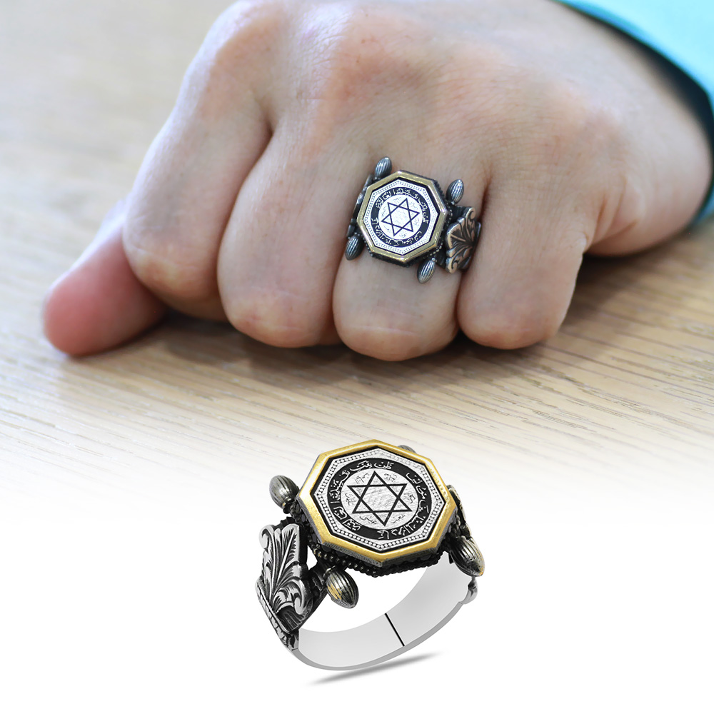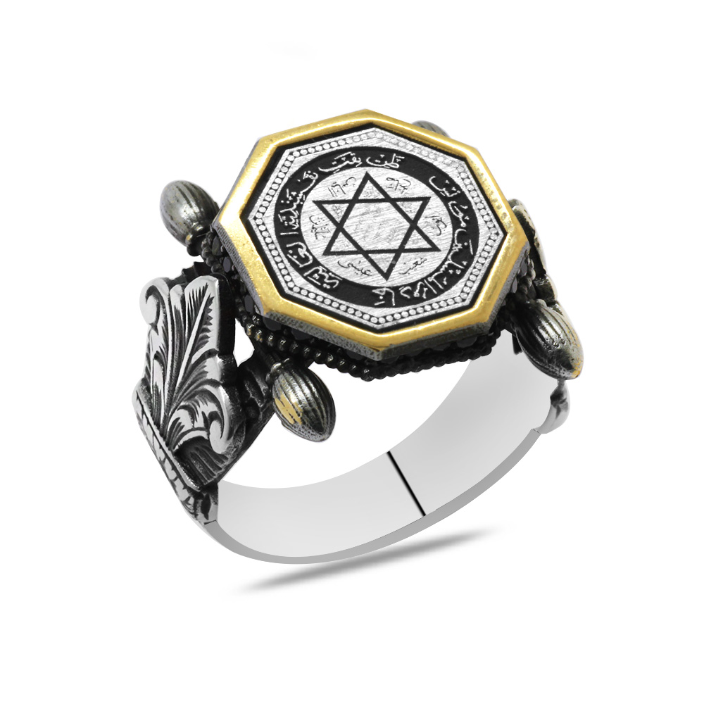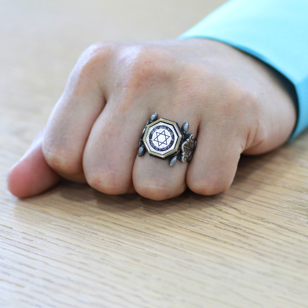 Otantik Tasarım Siyah Zirkon Taşlı Mührü Süleyman İşlemeli 925 Ayar Gümüş Erkek Yüzük