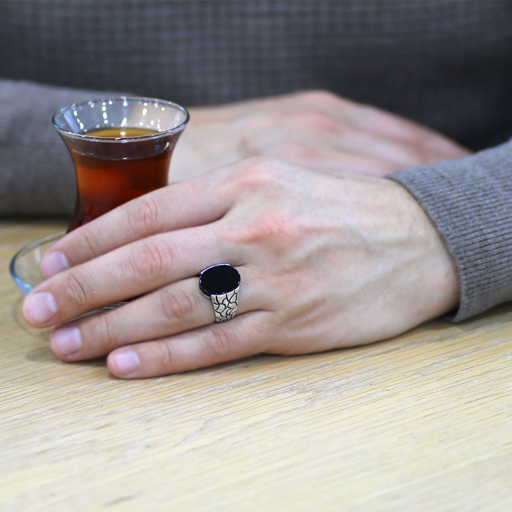 Oval Oniks Taşlı Delta Tasarım 925 Ayar Gümüş Erkek Yüzük