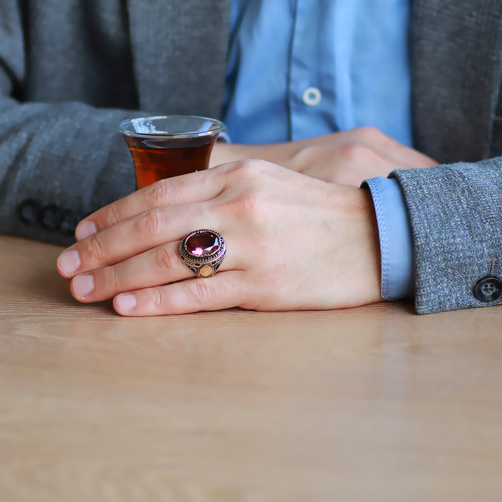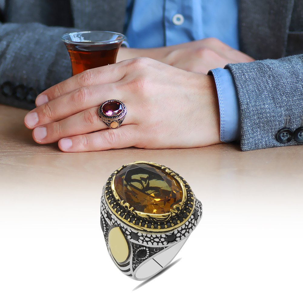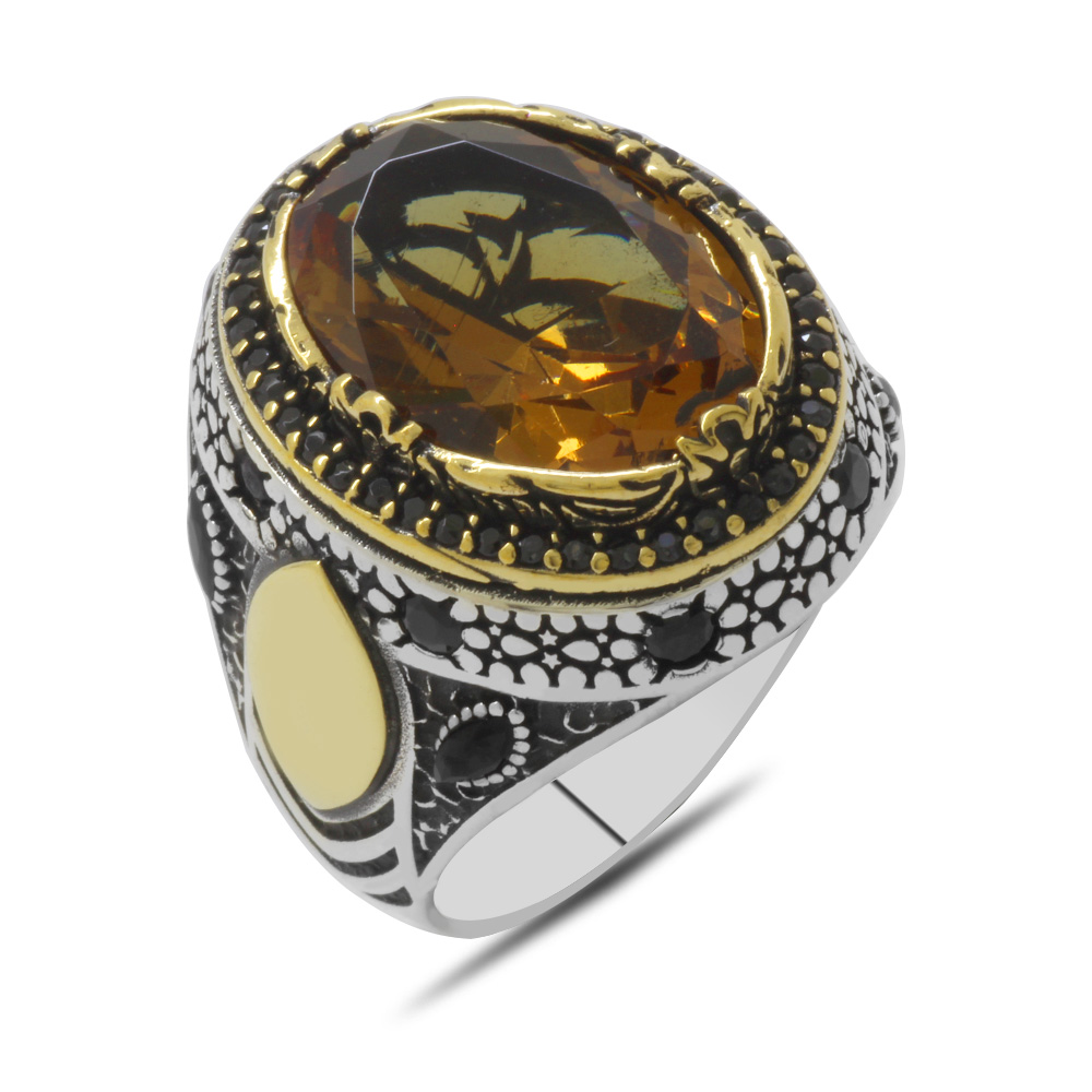 Oval Tasarım Faset Zultanit Taşlı Çevresi Mikro Taş Mıhlamalı 925 Ayar Gümüş Erkek Yüzük