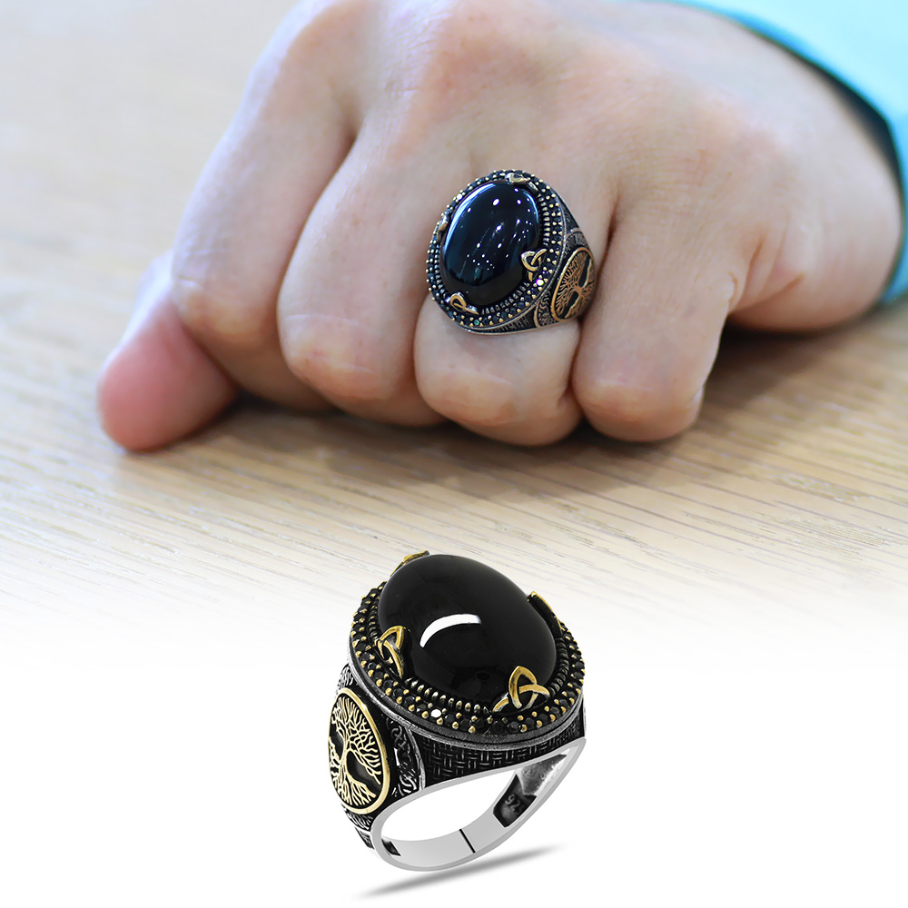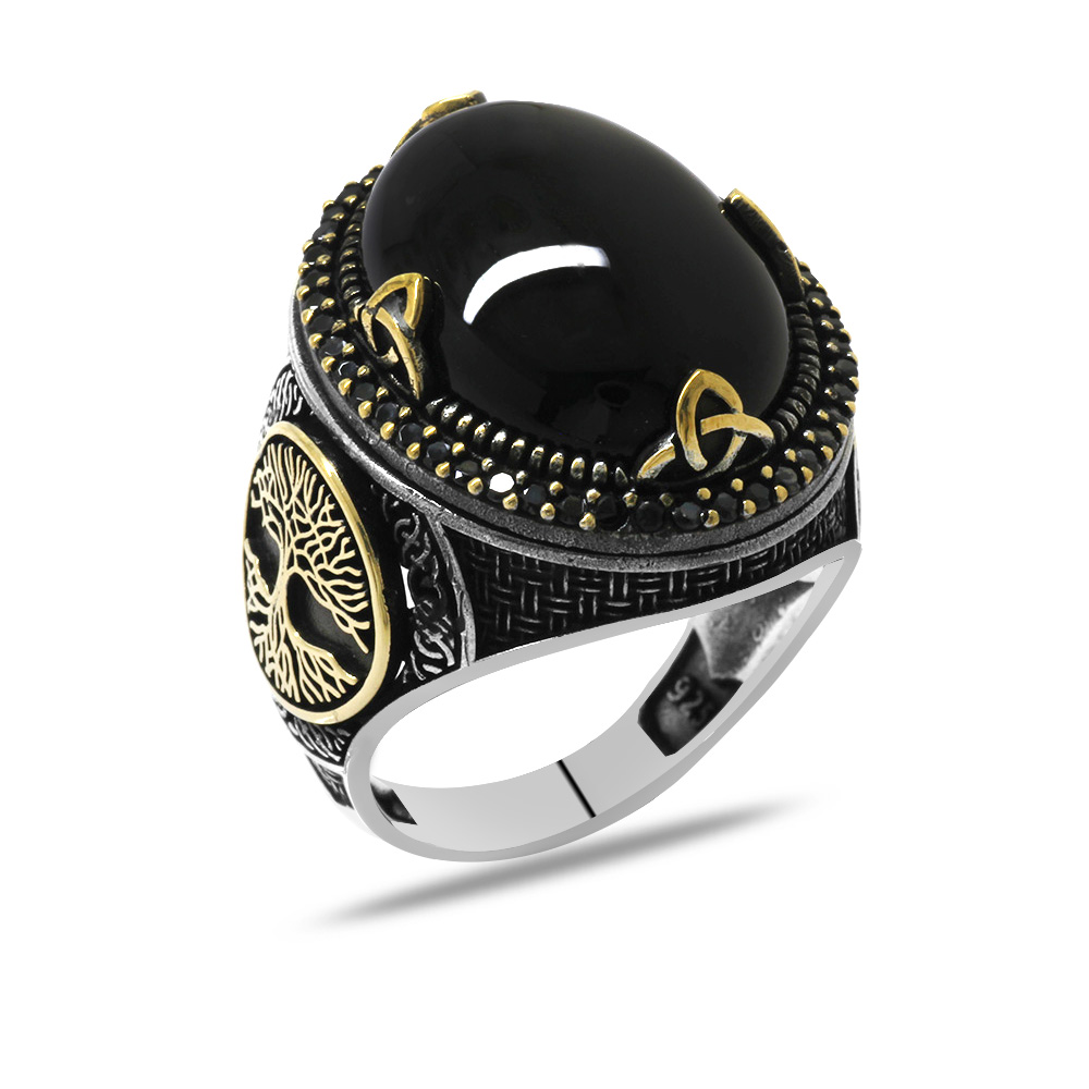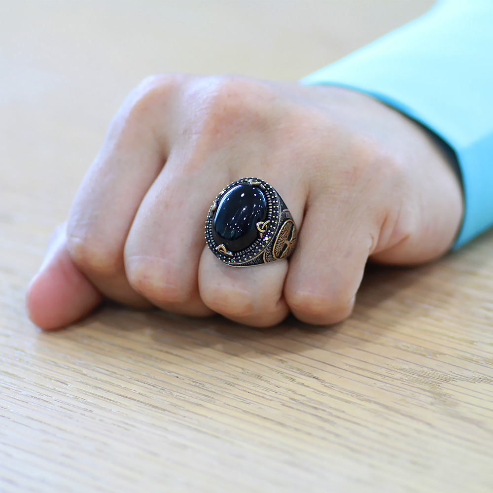 Oval Tasarım Hayat Ağacı Desenli Oniks Taşlı 925 Ayar Gümüş Erkek Yüzük