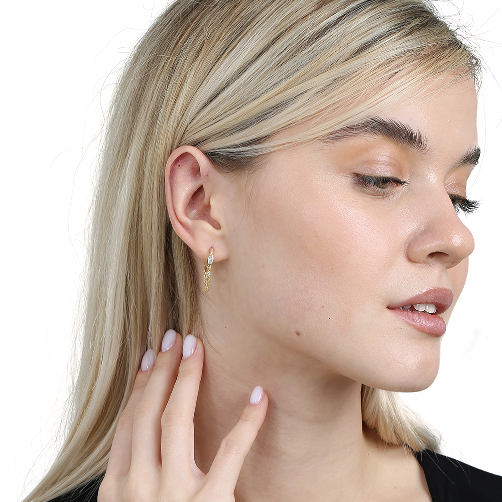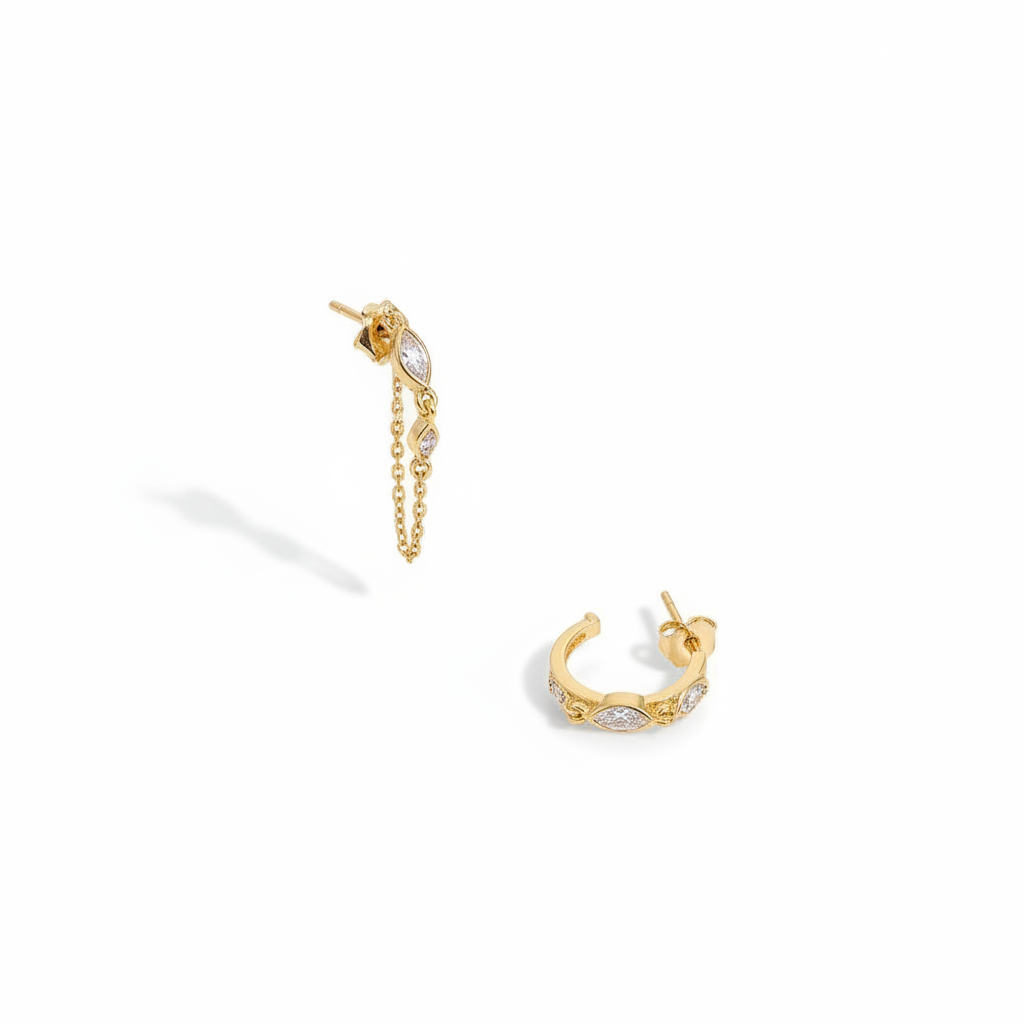 Oval Tektaş Tasarım Sıralı Zirkon Taş Sallantılı Zincir Detaylı Altın Renk 925 Ayar Gümüş Kadın Küpe
