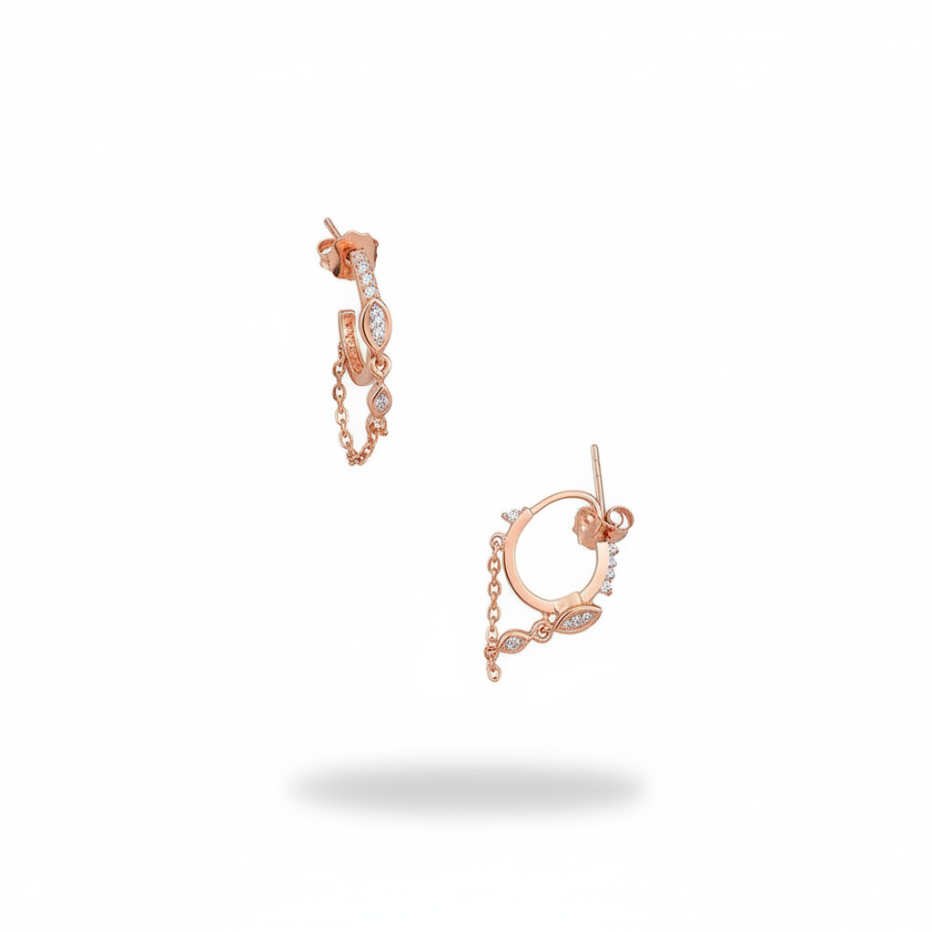 Oval Tektaş Tasarım Sıralı Zirkon Taş Sallantılı Zincir Detaylı Rose Renk 925 Ayar Gümüş Kadın Küpe