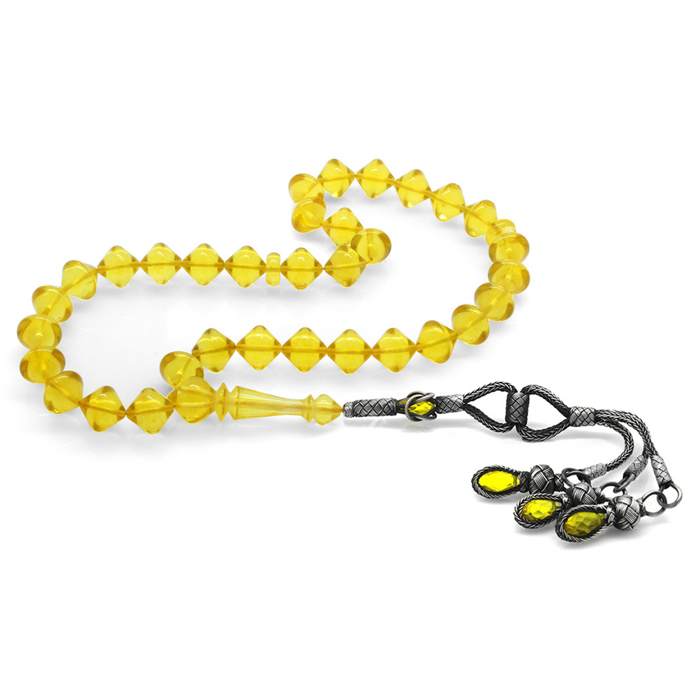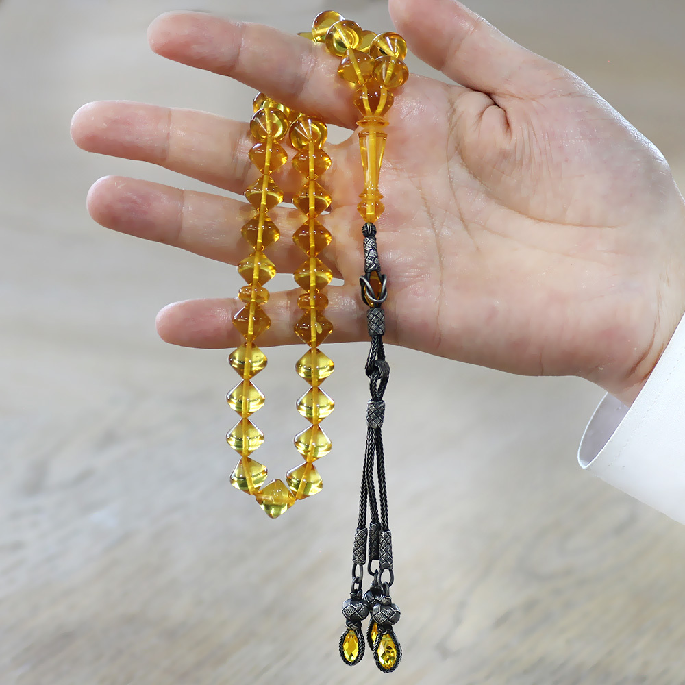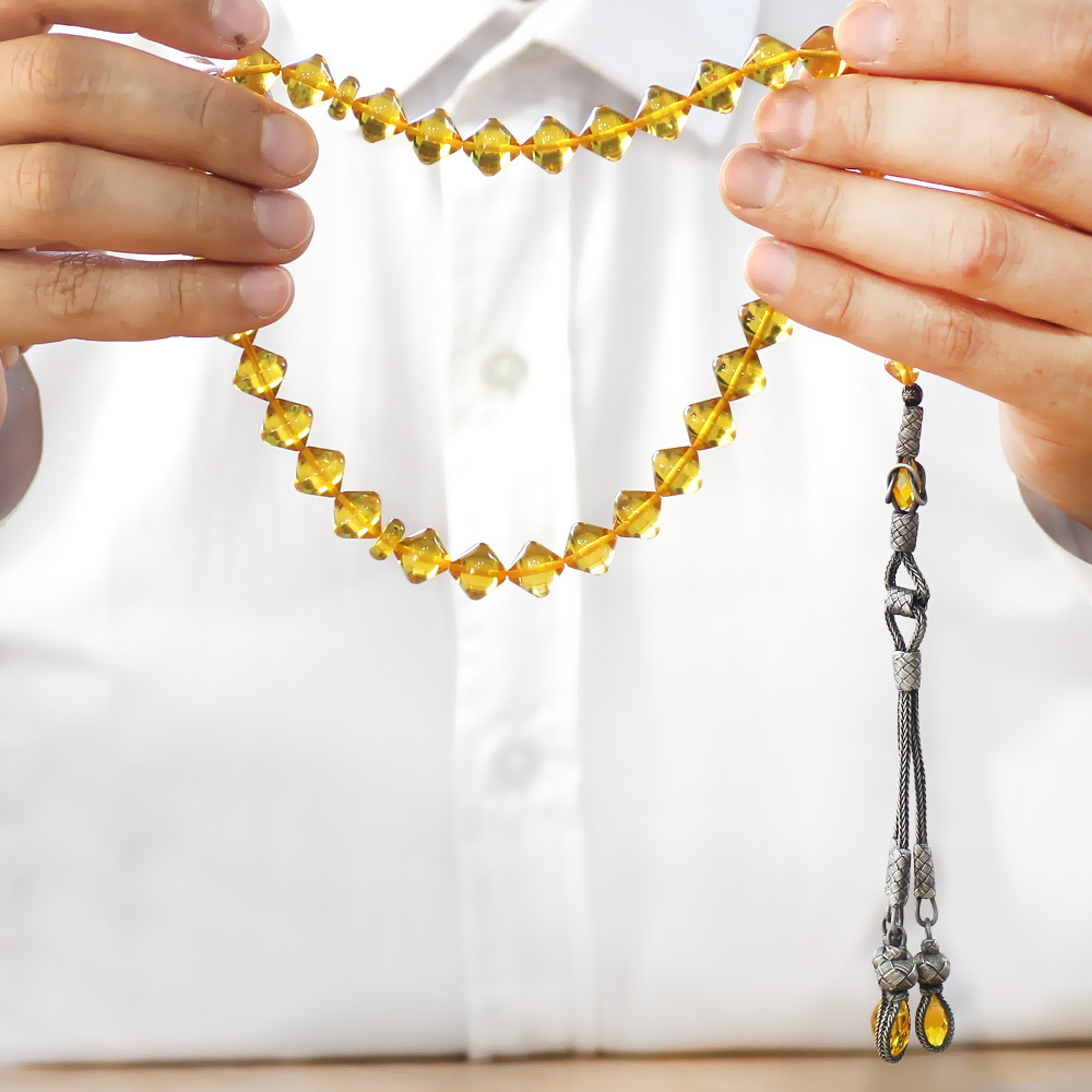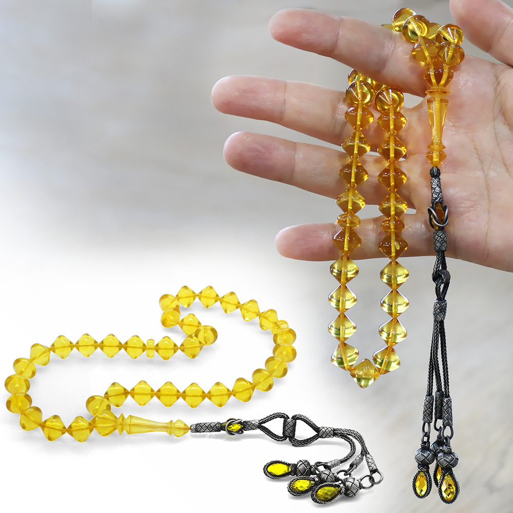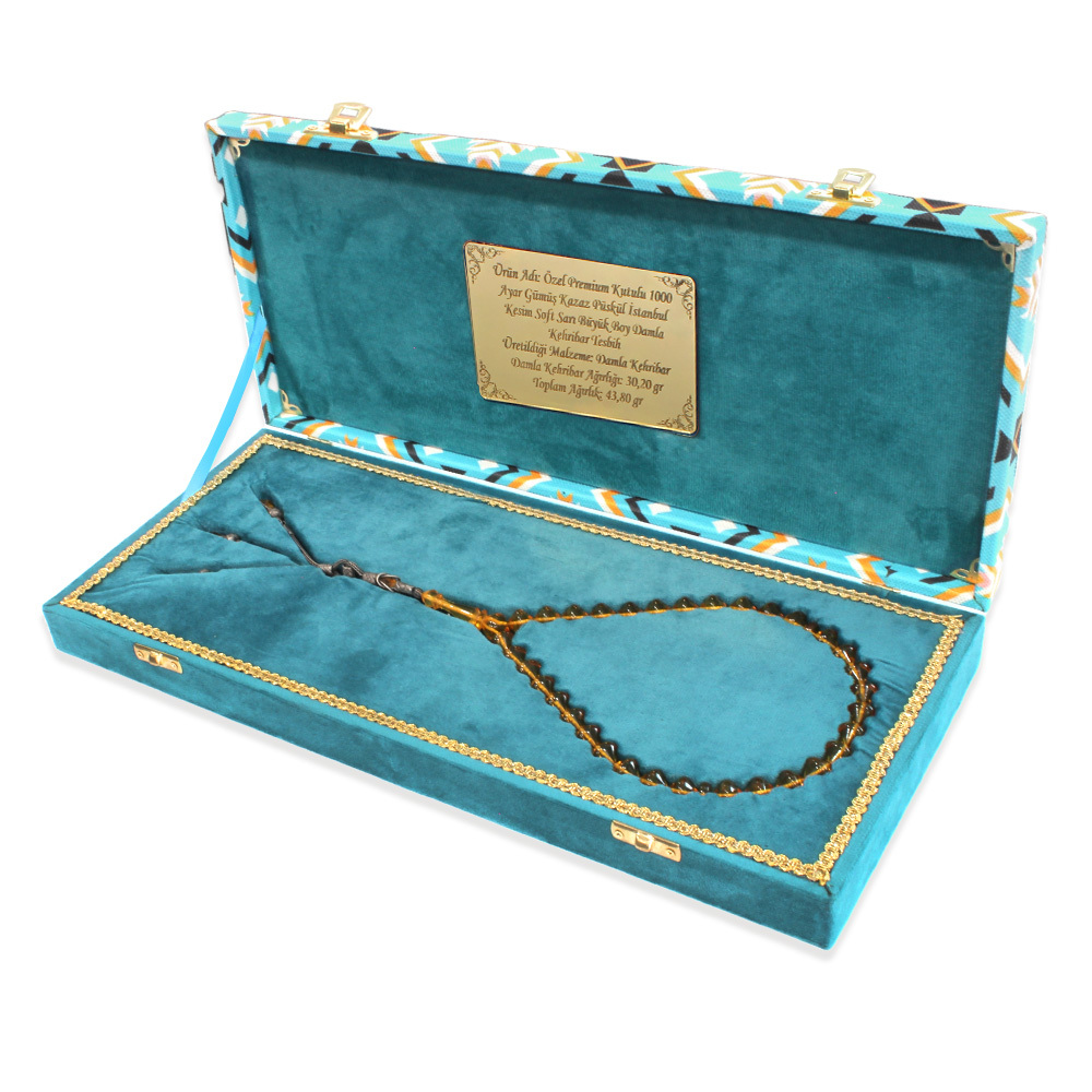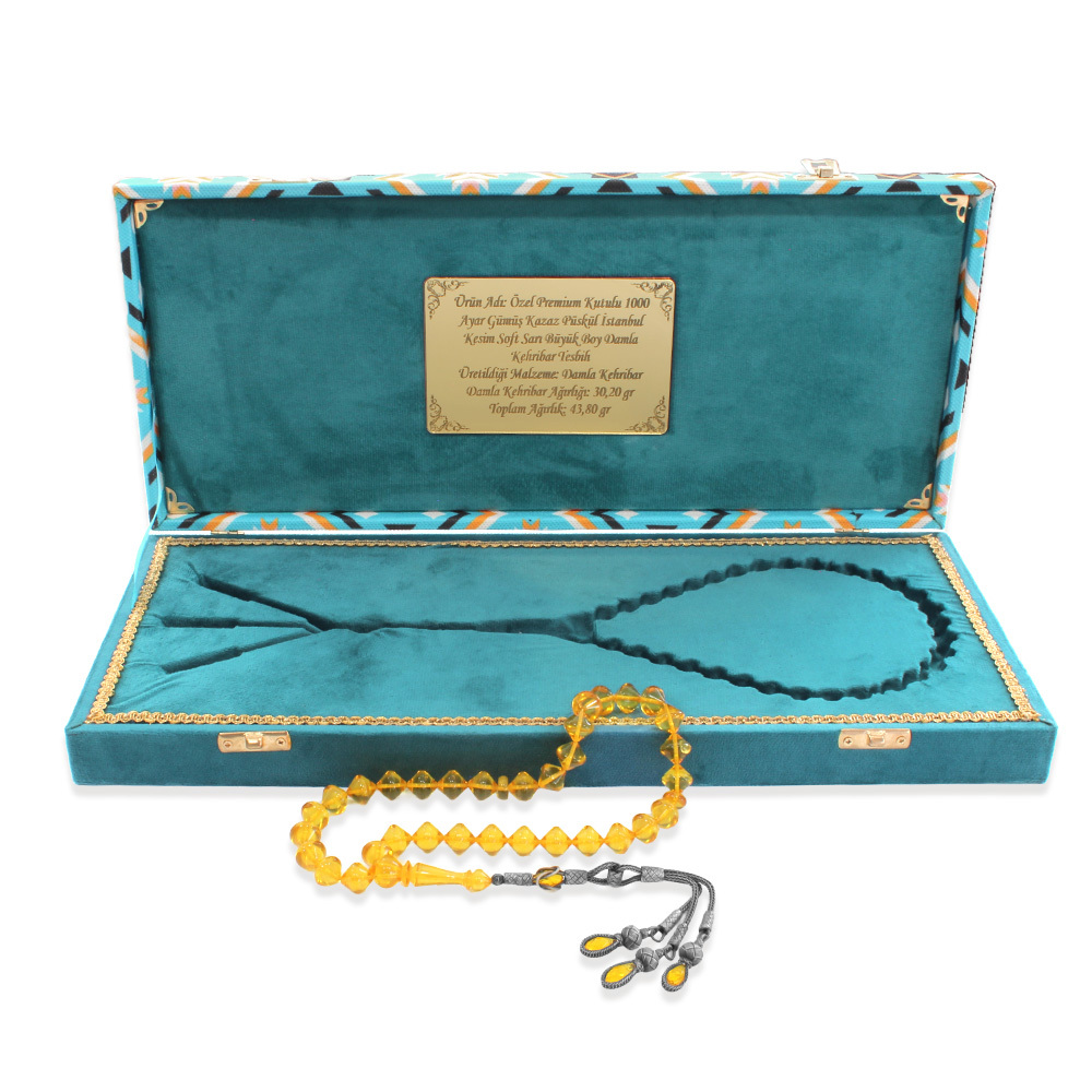 Premium Kutulu 1000 Ayar Gümüş Kazaz Püskül İstanbul Kesim Soft Sarı Büyük Boy Damla Kehribar Tesbih