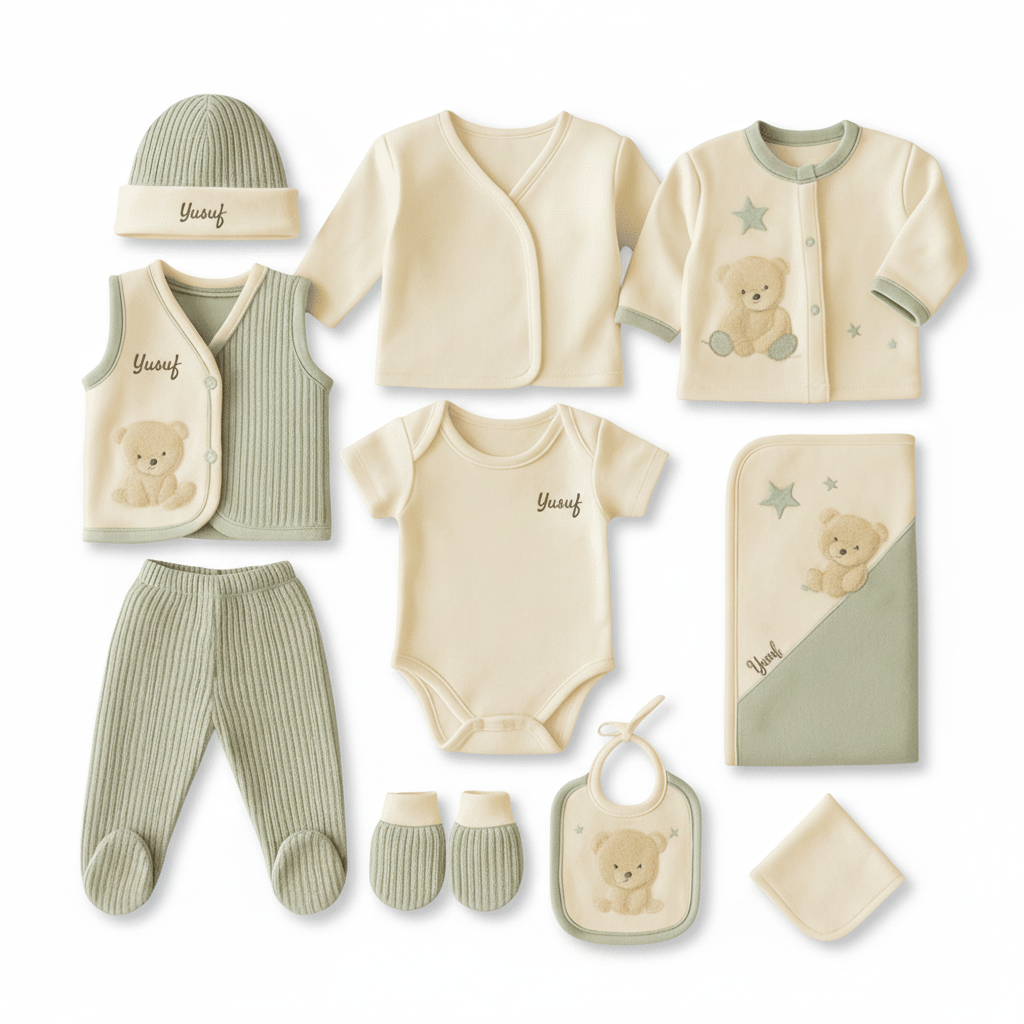 Peluş Ayıcıklı İsme Özel Nakışlı Yeşil Krem 10 lu Yenidoğan Hastane Çıkış Bebek Takımı