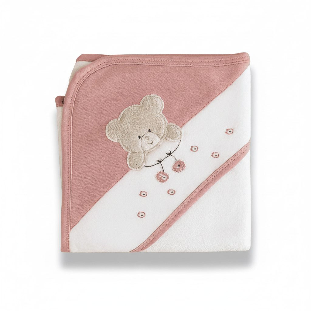 Peluş Ayıcıklı İsme Özel Nakışlı Pembe Beyaz Bebek Havlusu