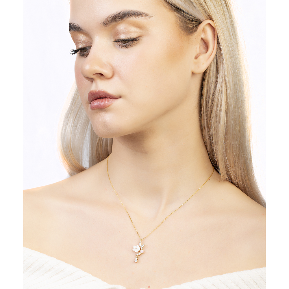 Pembe Zirkon Taşlı Sedef Kır Çiçeği Detaylı Altın Renk 925 Ayar Gümüş Kadın Kolye