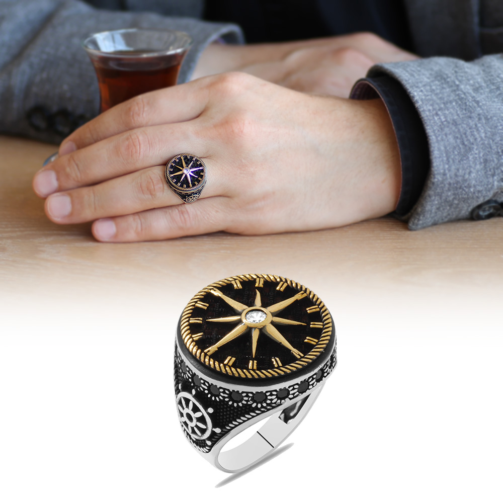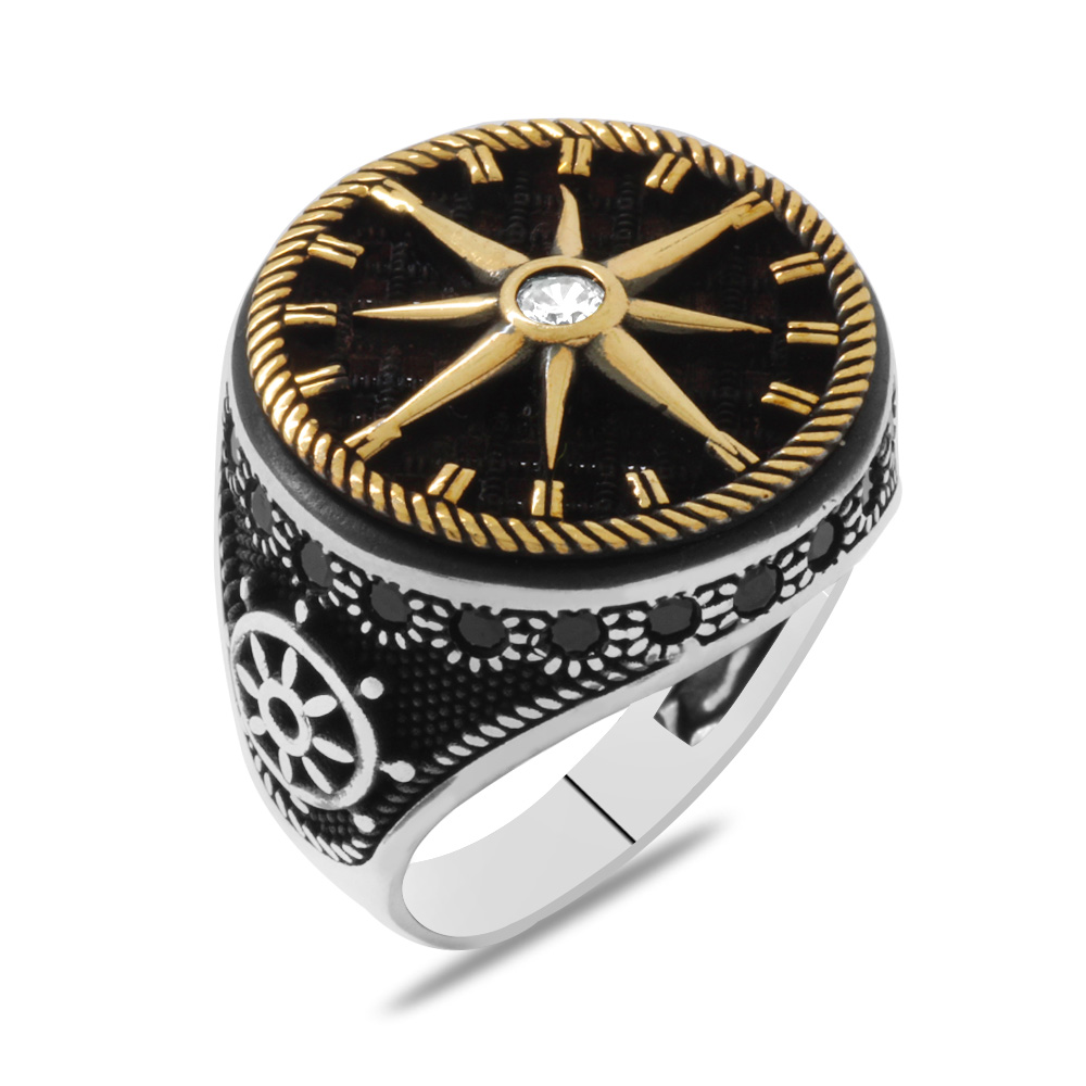 Pusula Tasarım Yanları Siyah Zirkon Taş Mıhlamalı 925 Ayar Gümüş Erkek Yüzük