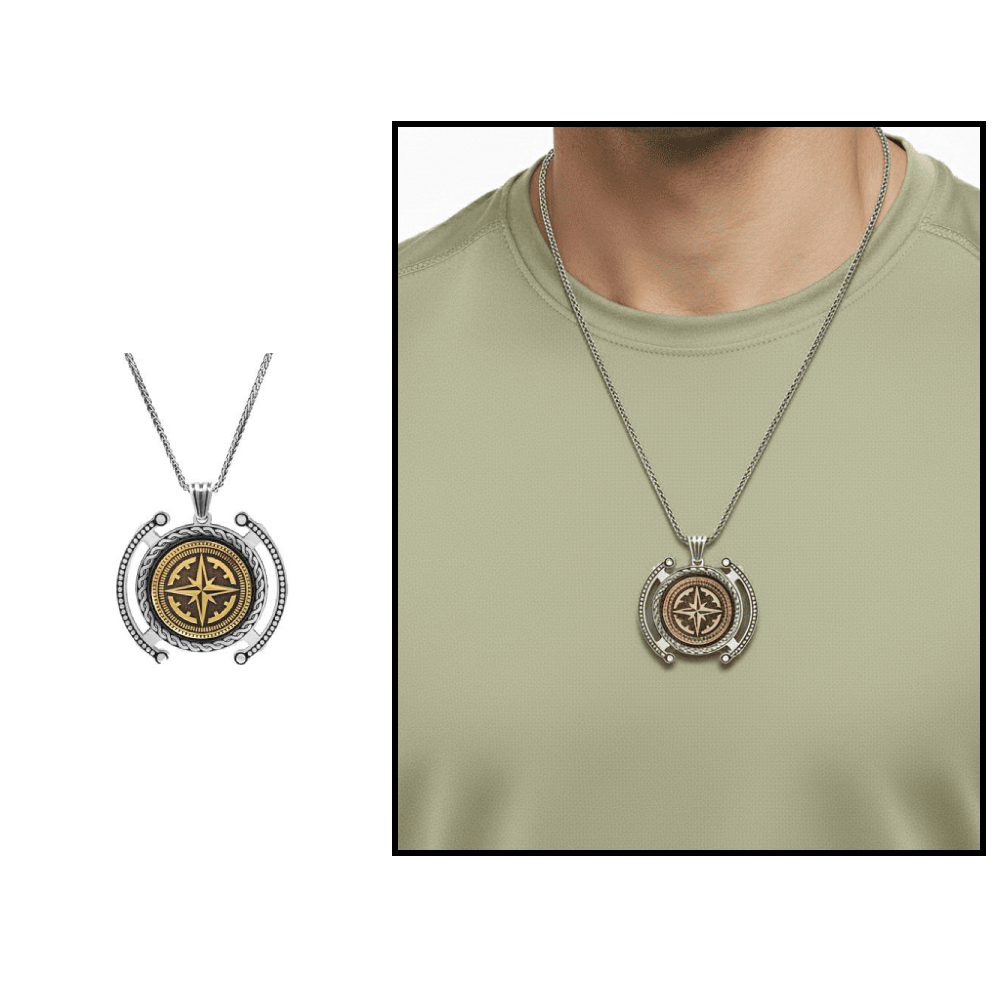 Pusula Temalı Kalın Zincirli 925 Ayar Gümüş Madalyon Kolye