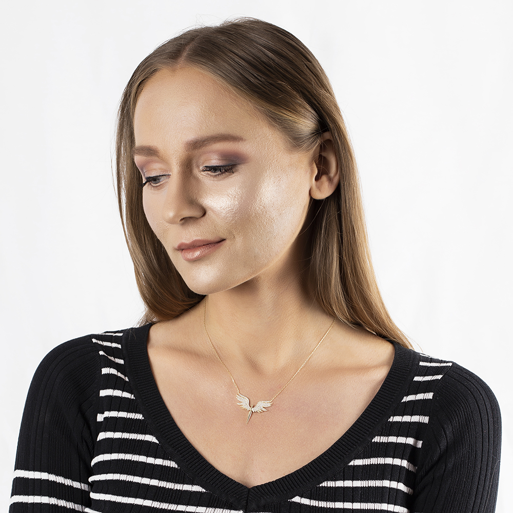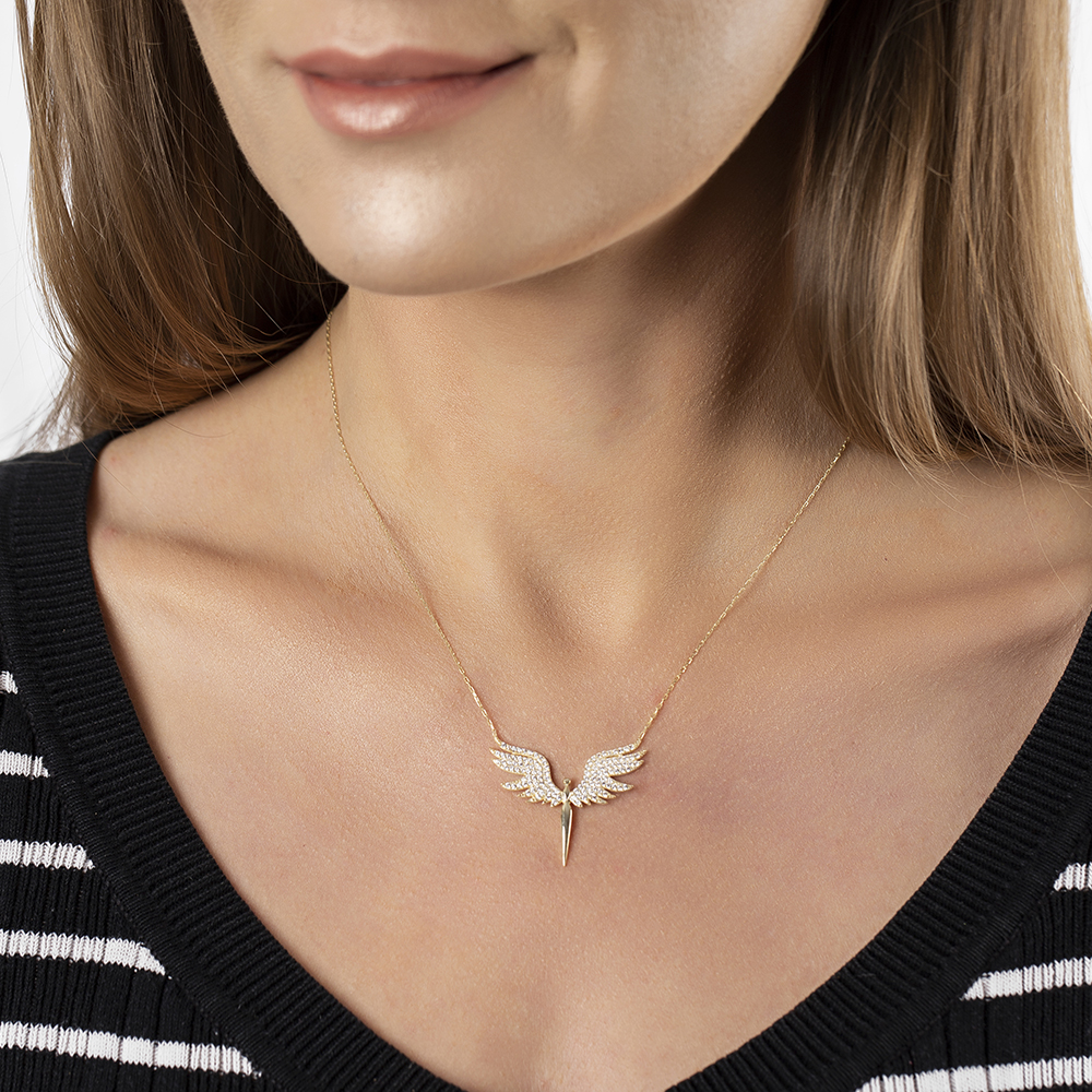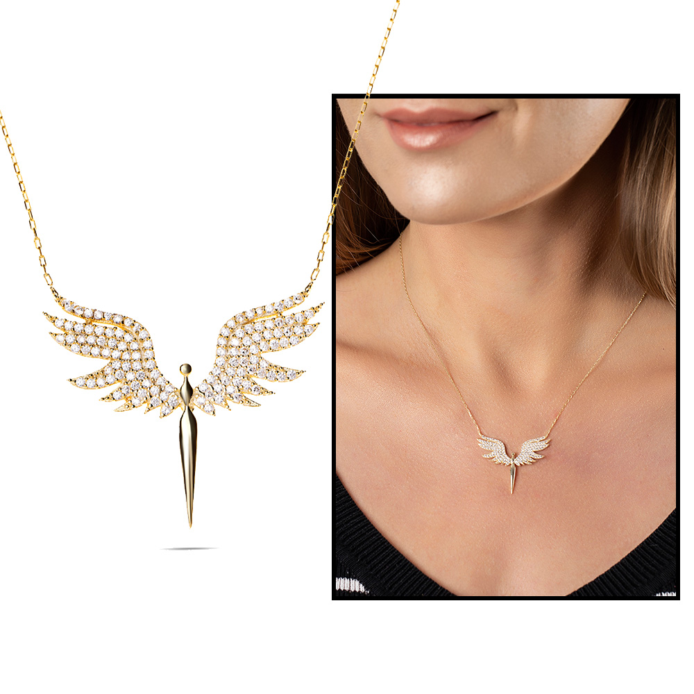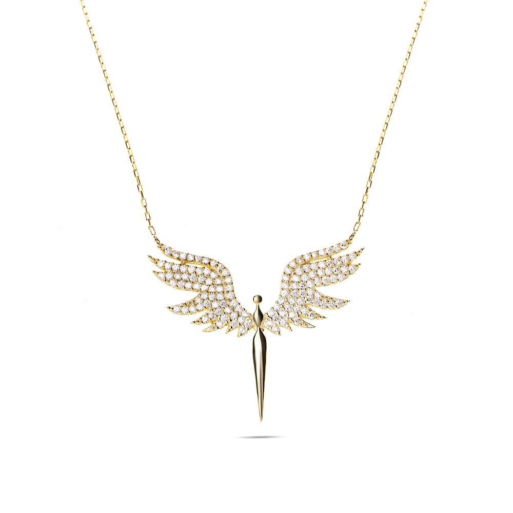 Renkli Zirkon Taşlı Melek Tasarım Altın Renk 925 Ayar Gümüş Bayan Kolye