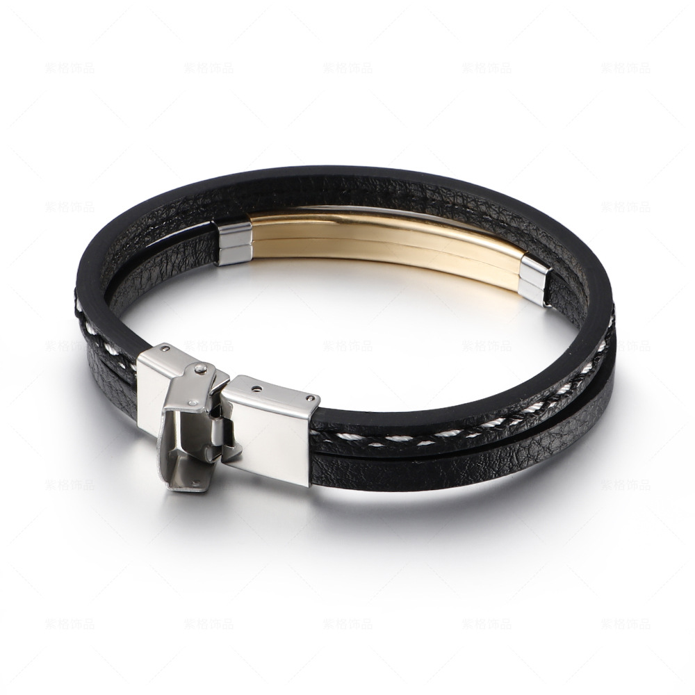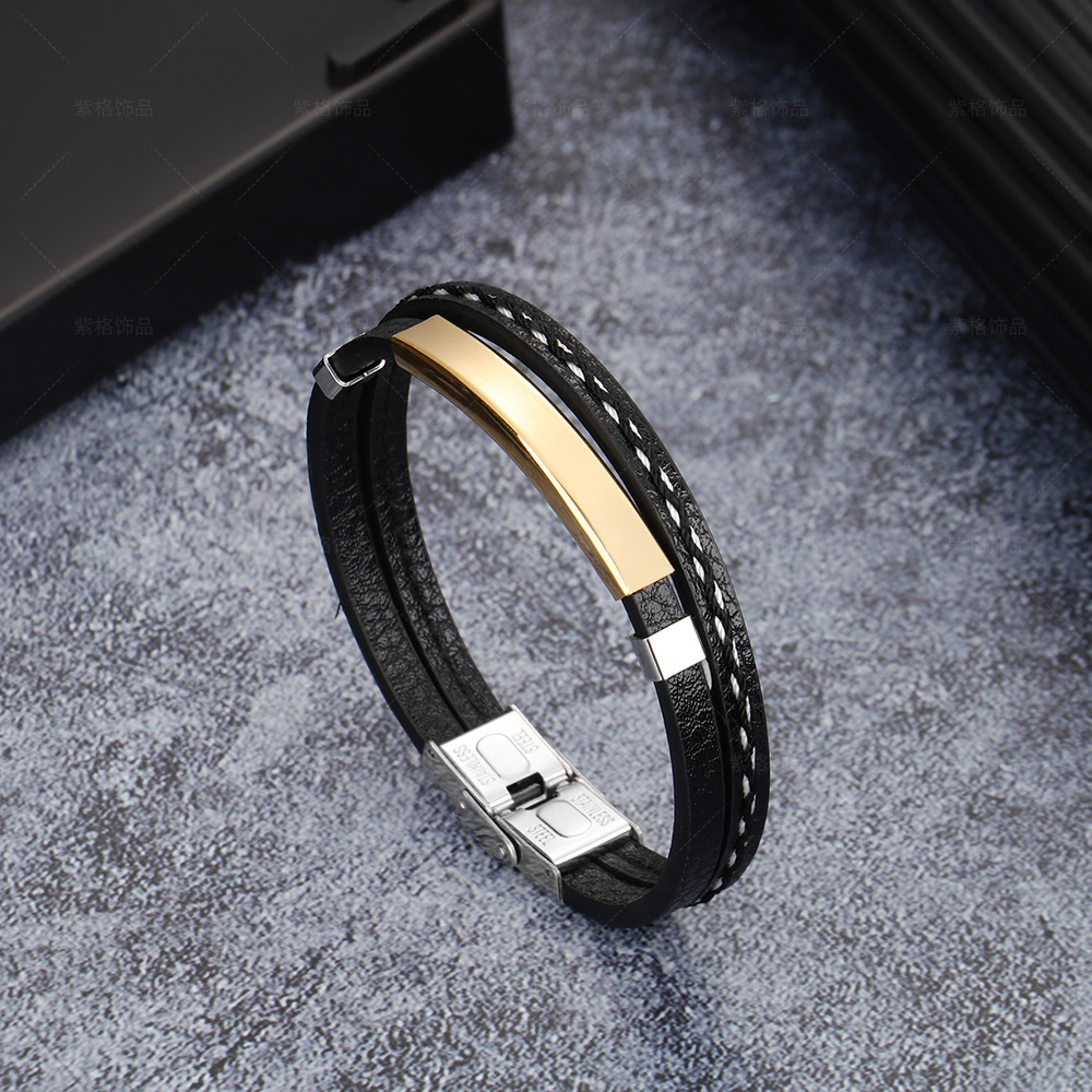 Retro Siyah Deri ve Sarı Renk Çelik Plakalı Mekanizmalı İsme Özel Veya Harf Yazılı Erkek Bileklik