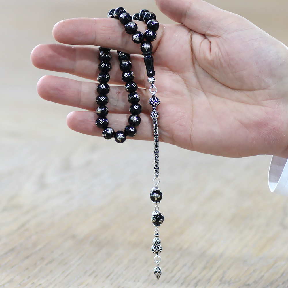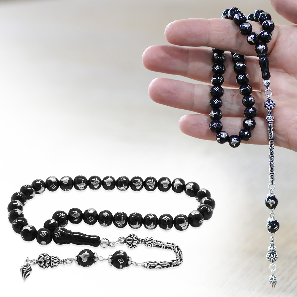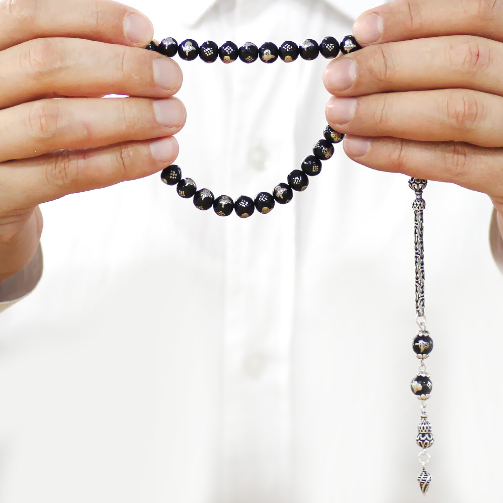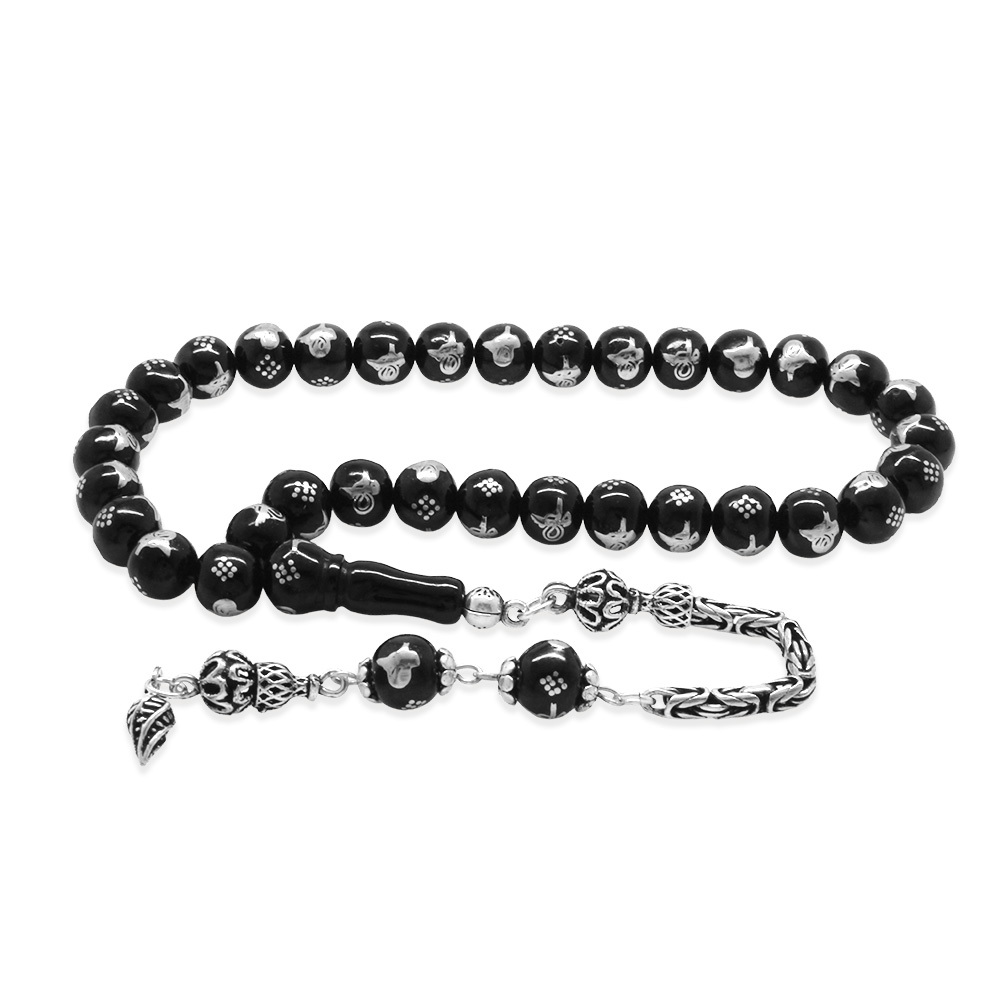 Rus Oltu Taşı - 925 Ayar Gümüş Kral Püsküllü - Tuğra İşlemeli - Küre Kesim - Siyah Renk