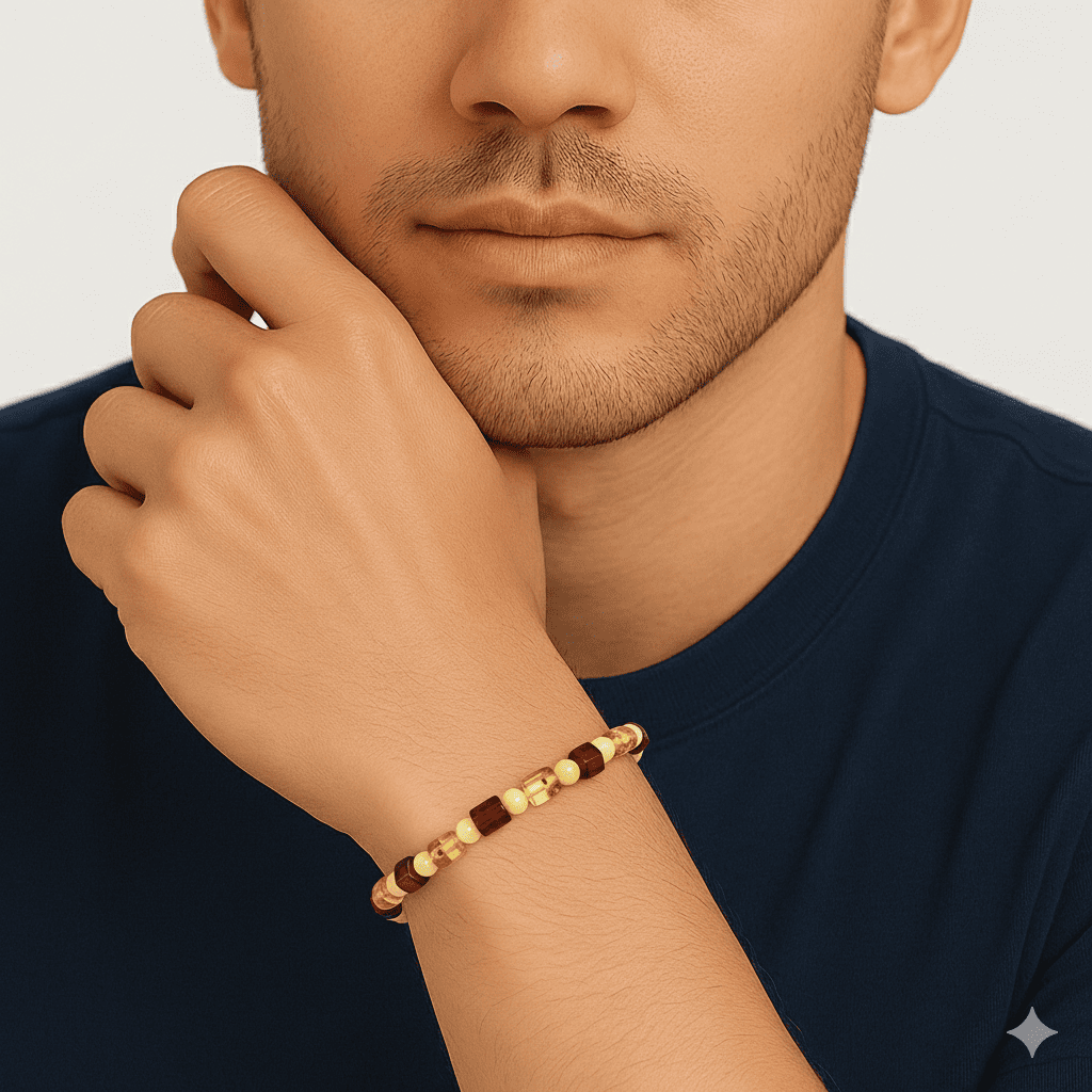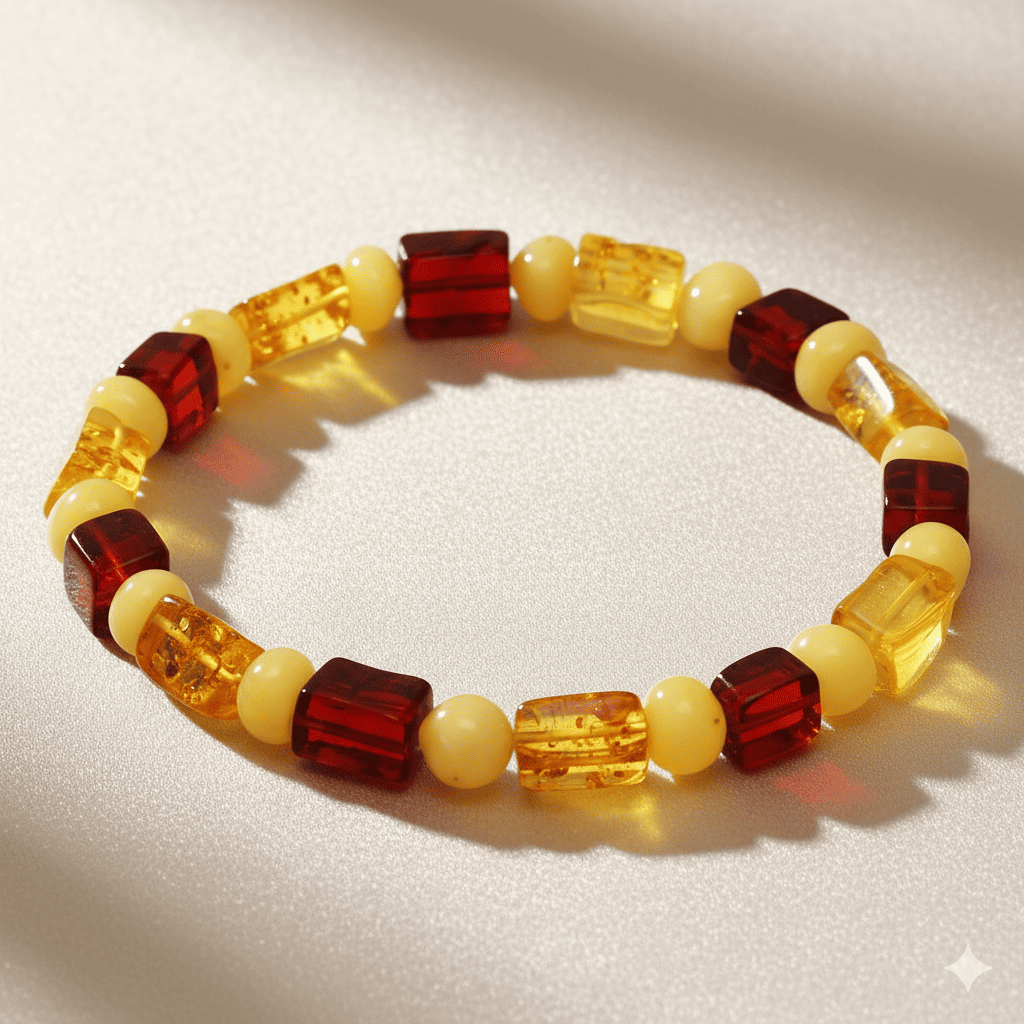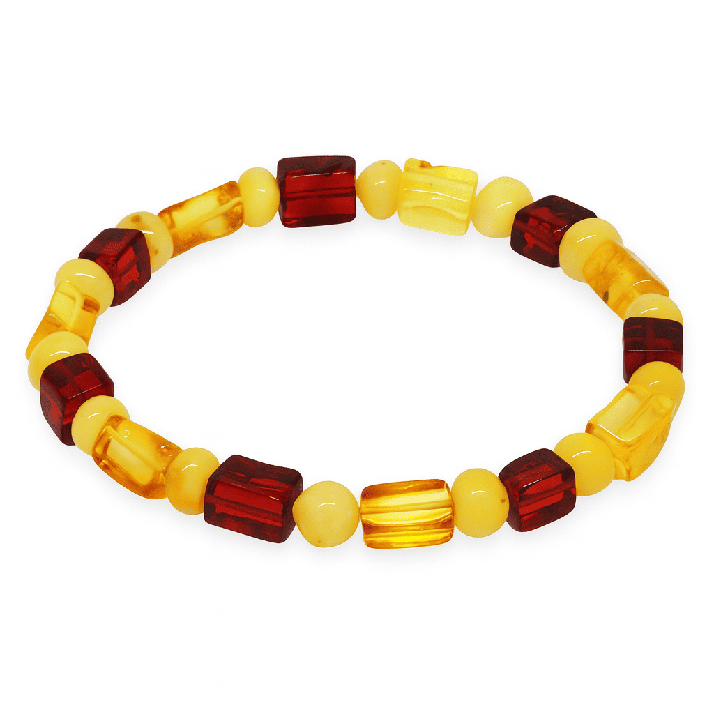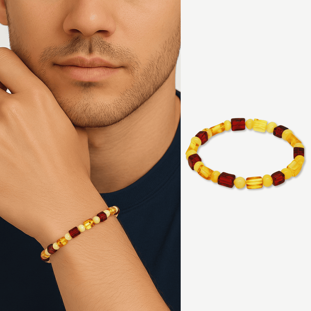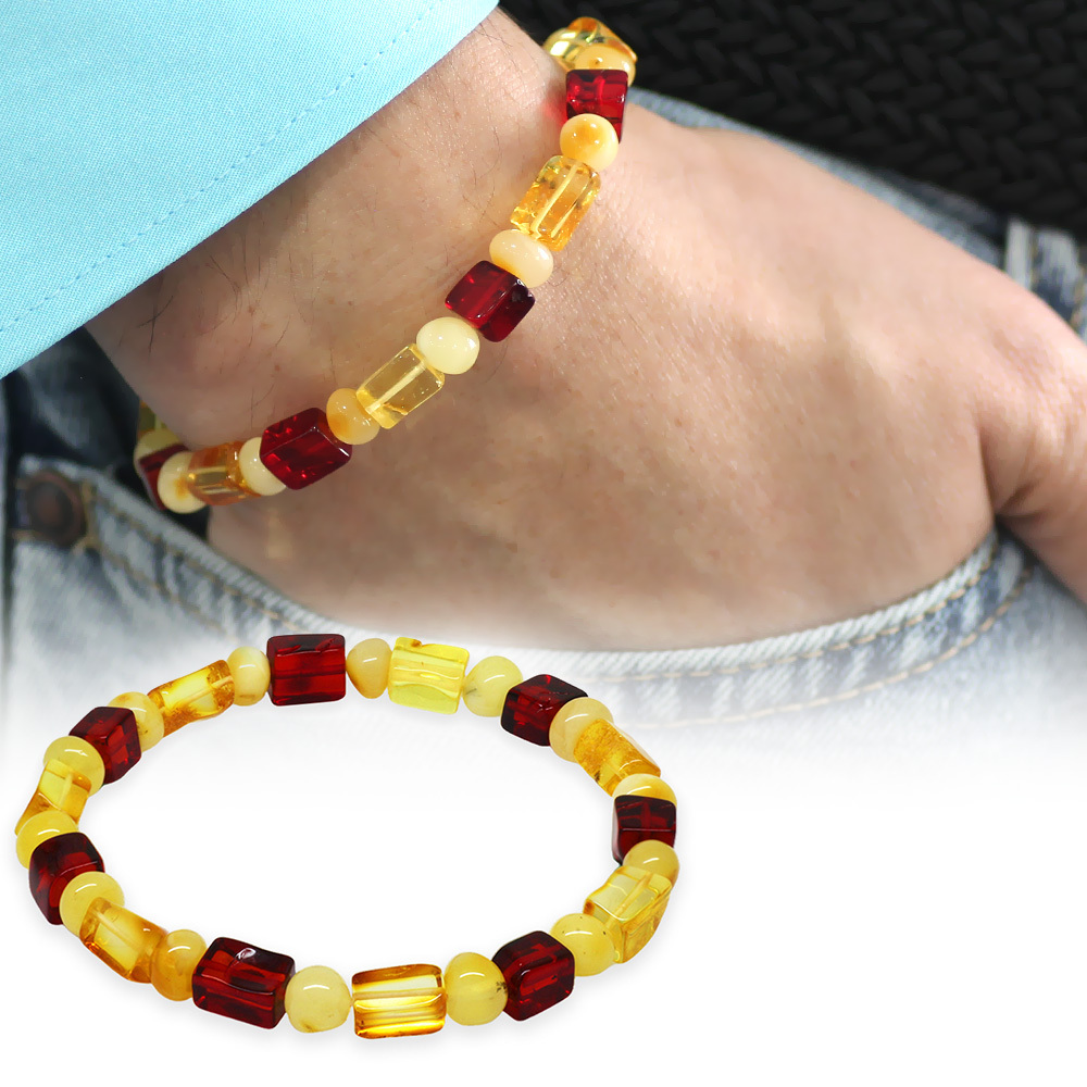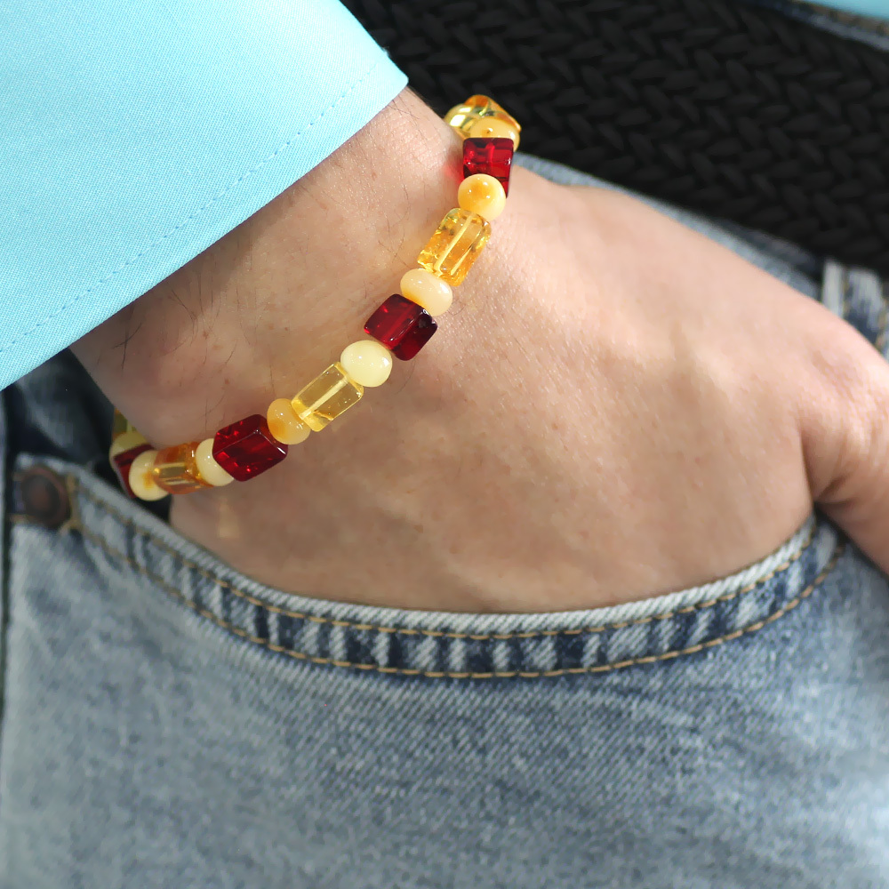 Sarı Kırmızı Silindir Küp Kesim Doğal Damla Kehribar Erkek Bileklik
